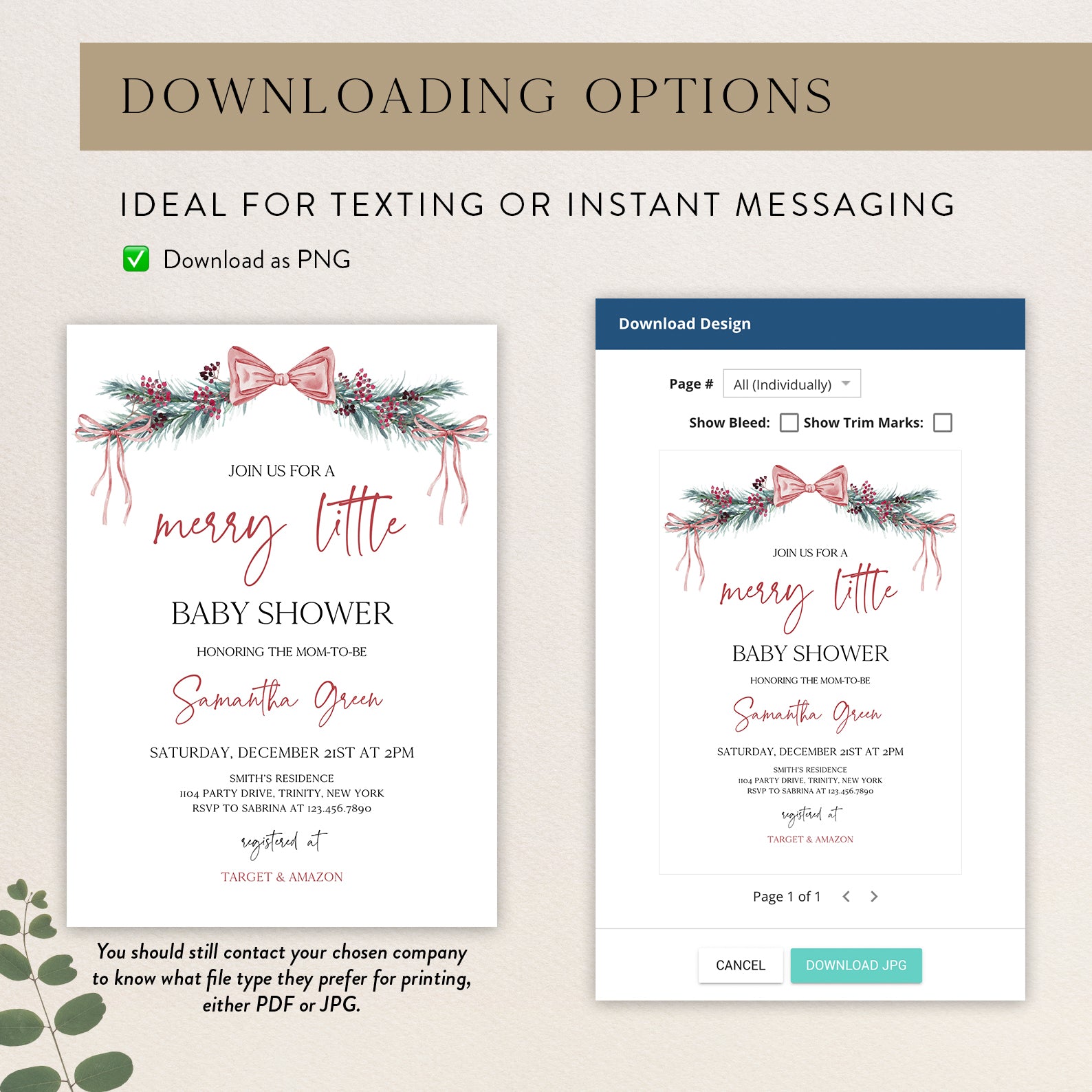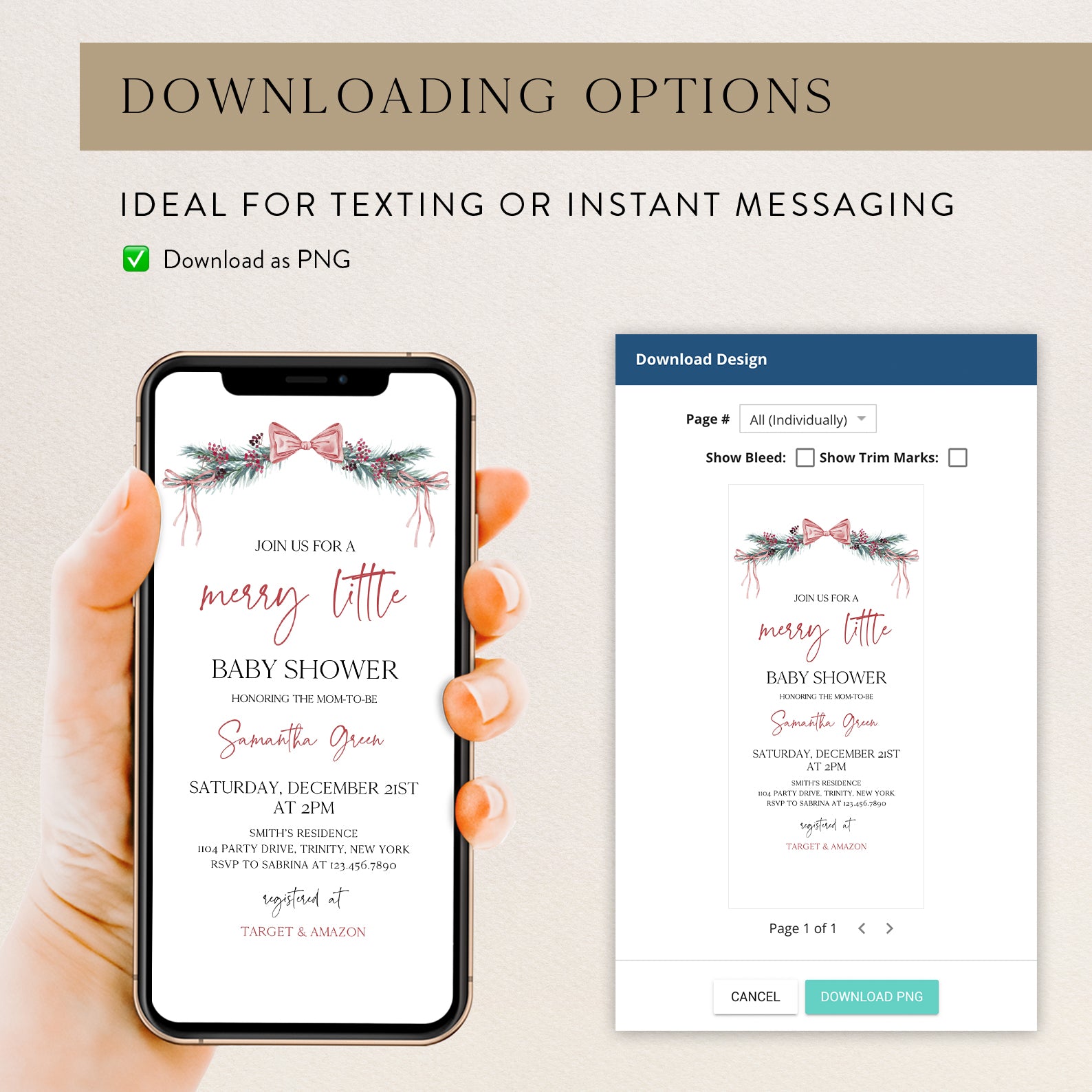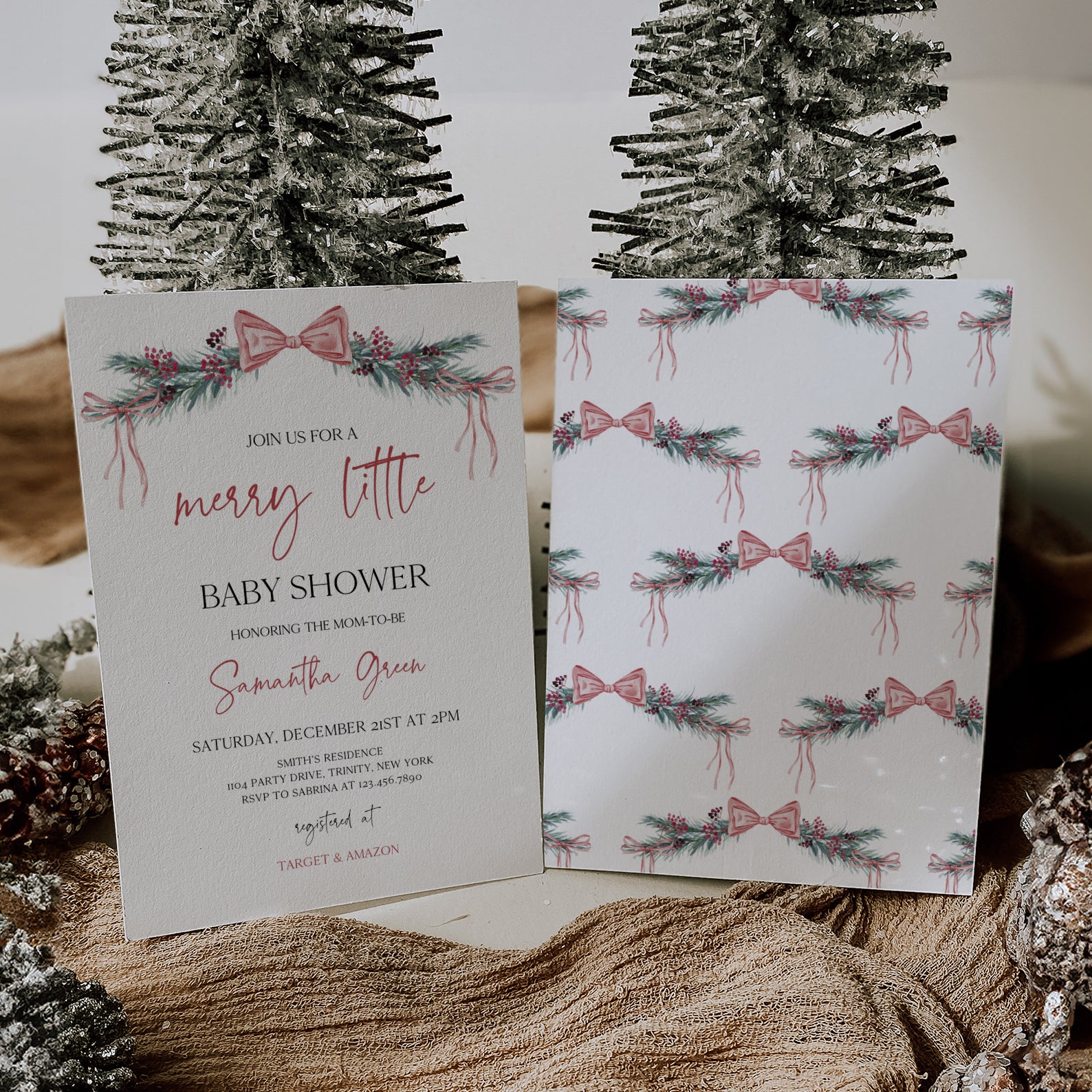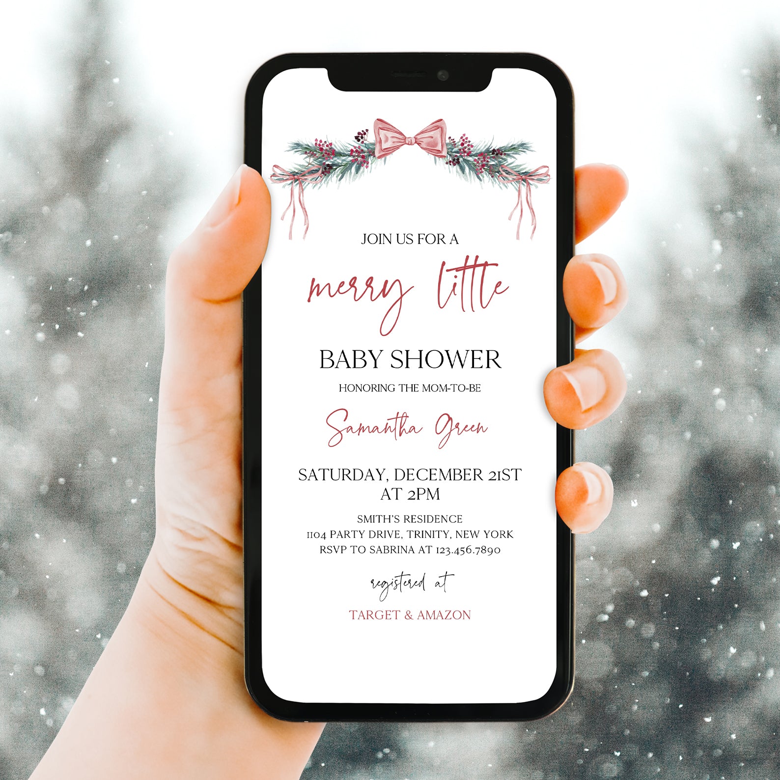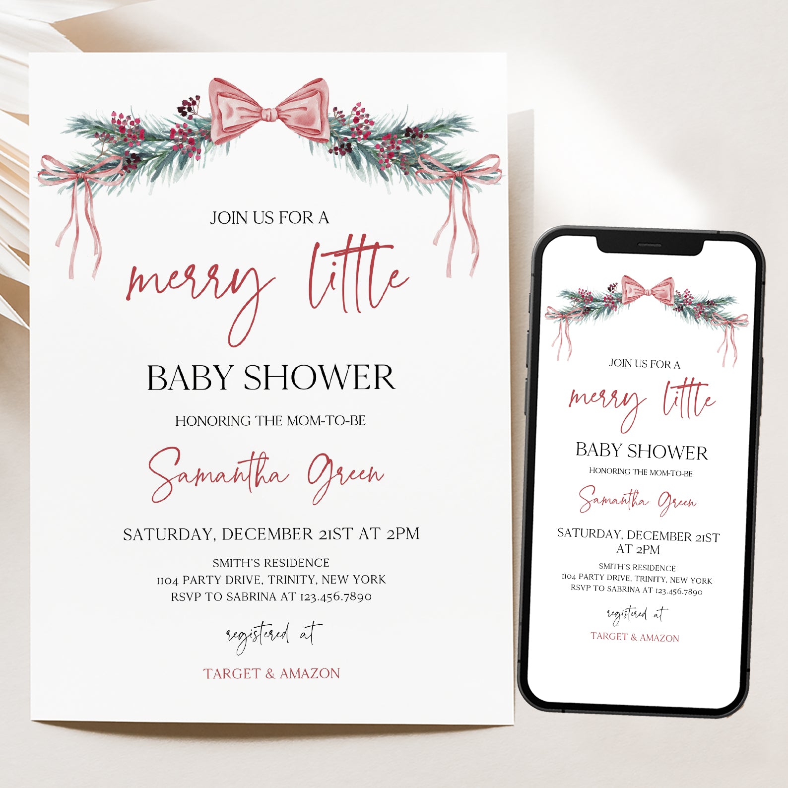 Celebrate the joy of new beginnings with our Merry Little Winter Baby Shower digital invitation. Featuring a charming minimalist design, this invitation showcases a delicate Christmas garland adorned with soft pink ribbons, perfectly blending festive cheer with a touch of elegance. Ideal for welcoming your little one during the cozy winter season, this digital invite is easy to customize and share, making your celebration planning a breeze. Invite your loved ones to join in the festivities with style and warmth!