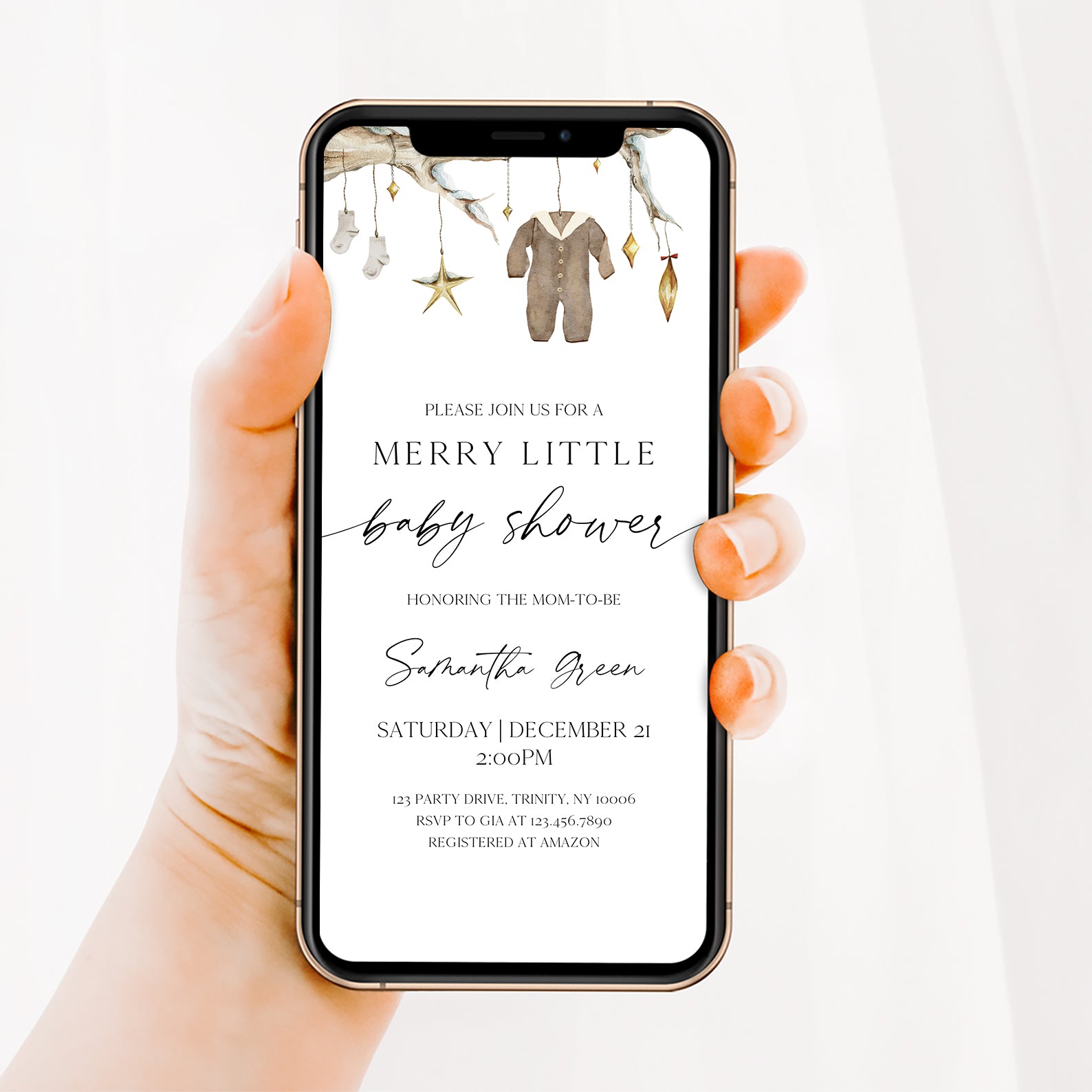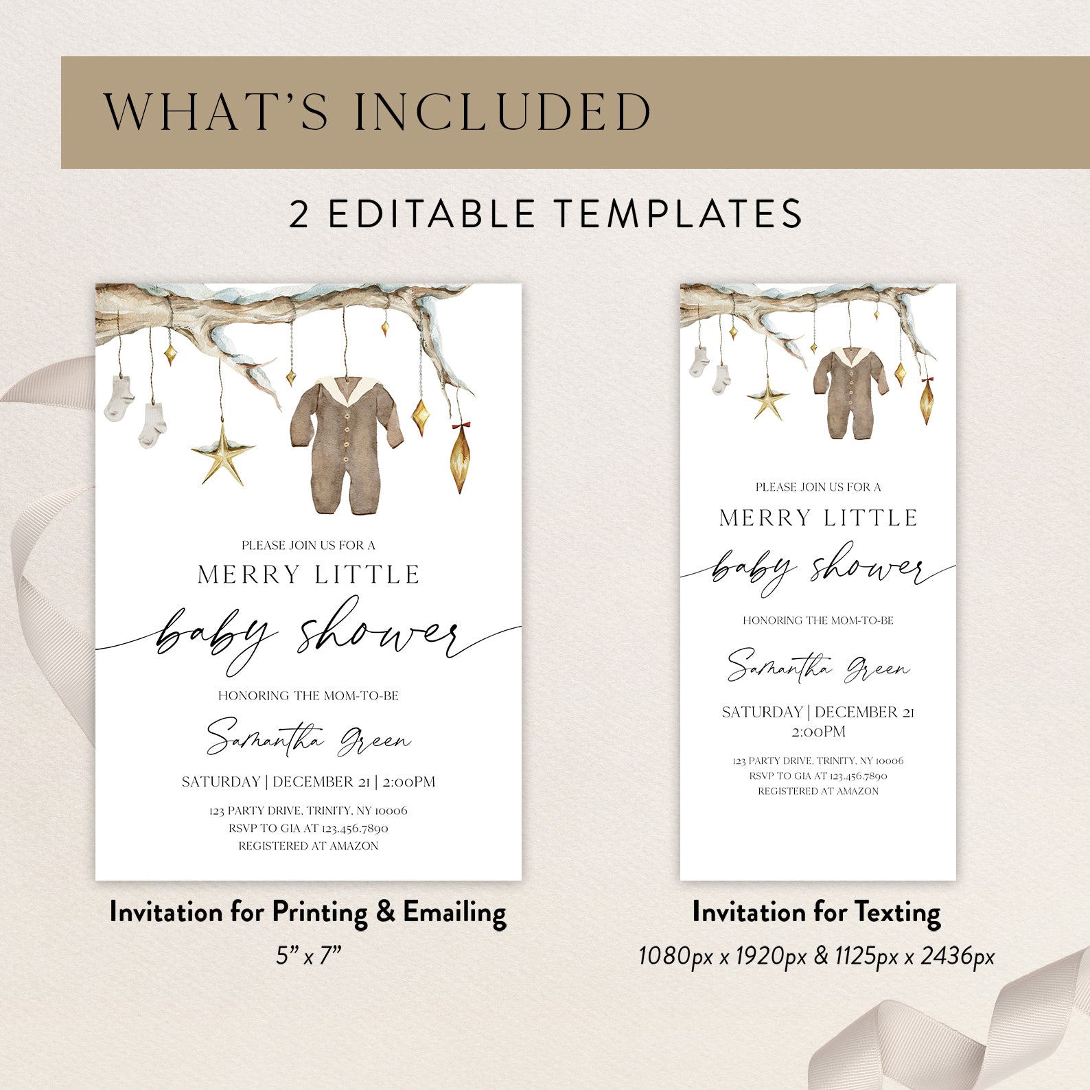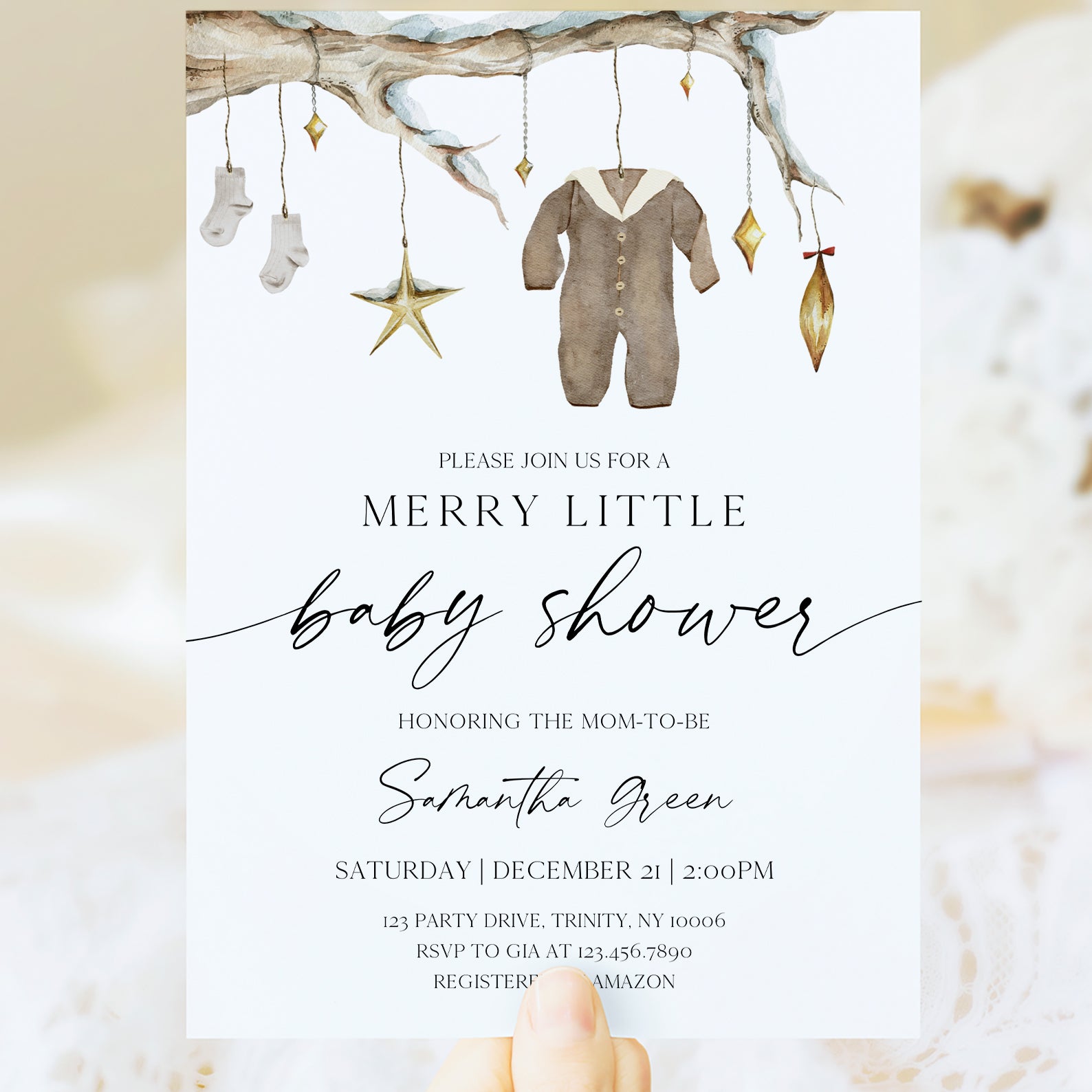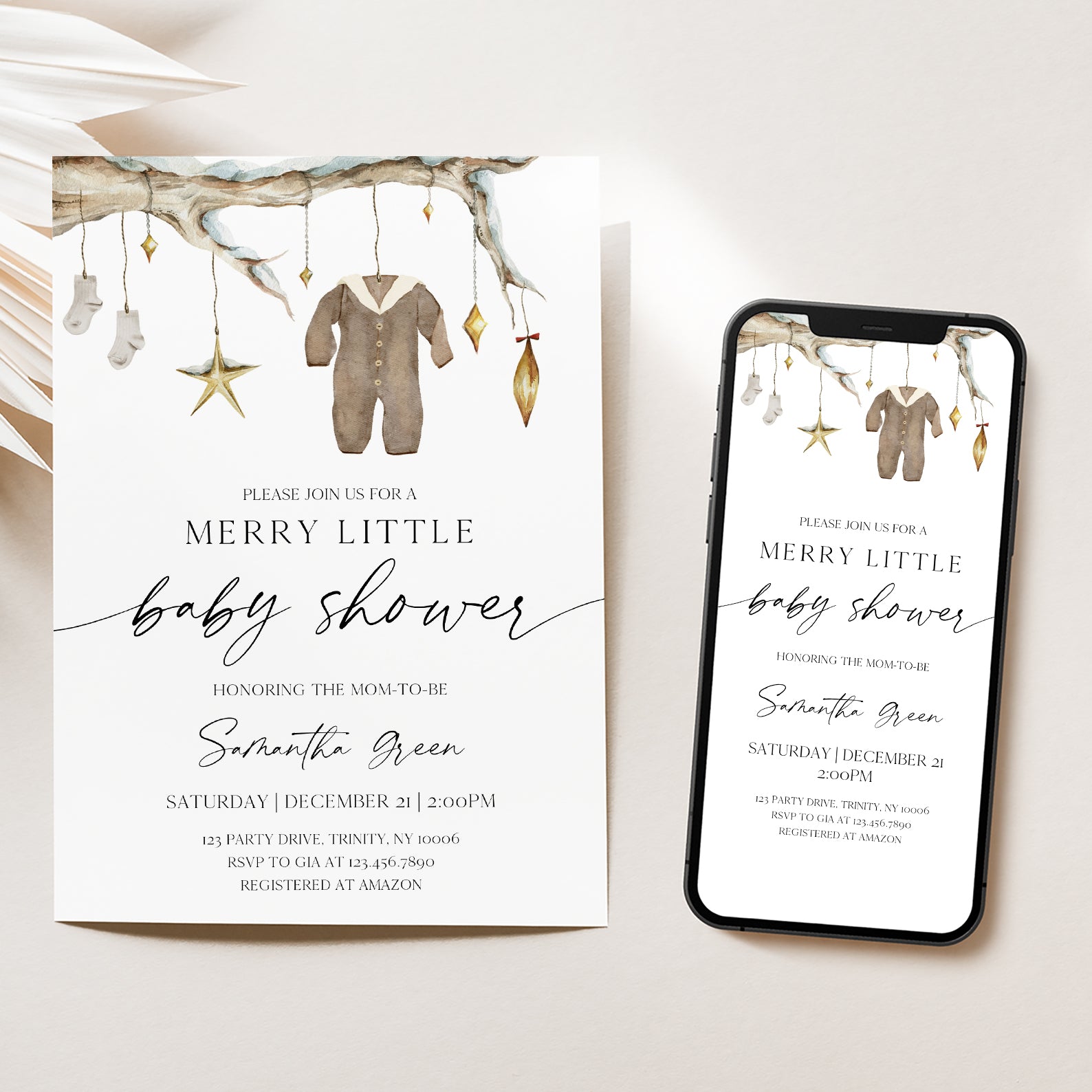 Announce your new arrival with our Winter Baby Shower Digital Invitation. Featuring a minimalist design with a tree branch, a brown baby jumpsuit, white socks, and twinkling stars, this invite is adorned with elegant diamond-shaped Christmas decorations. Perfect for a stylish and heartwarming celebration.