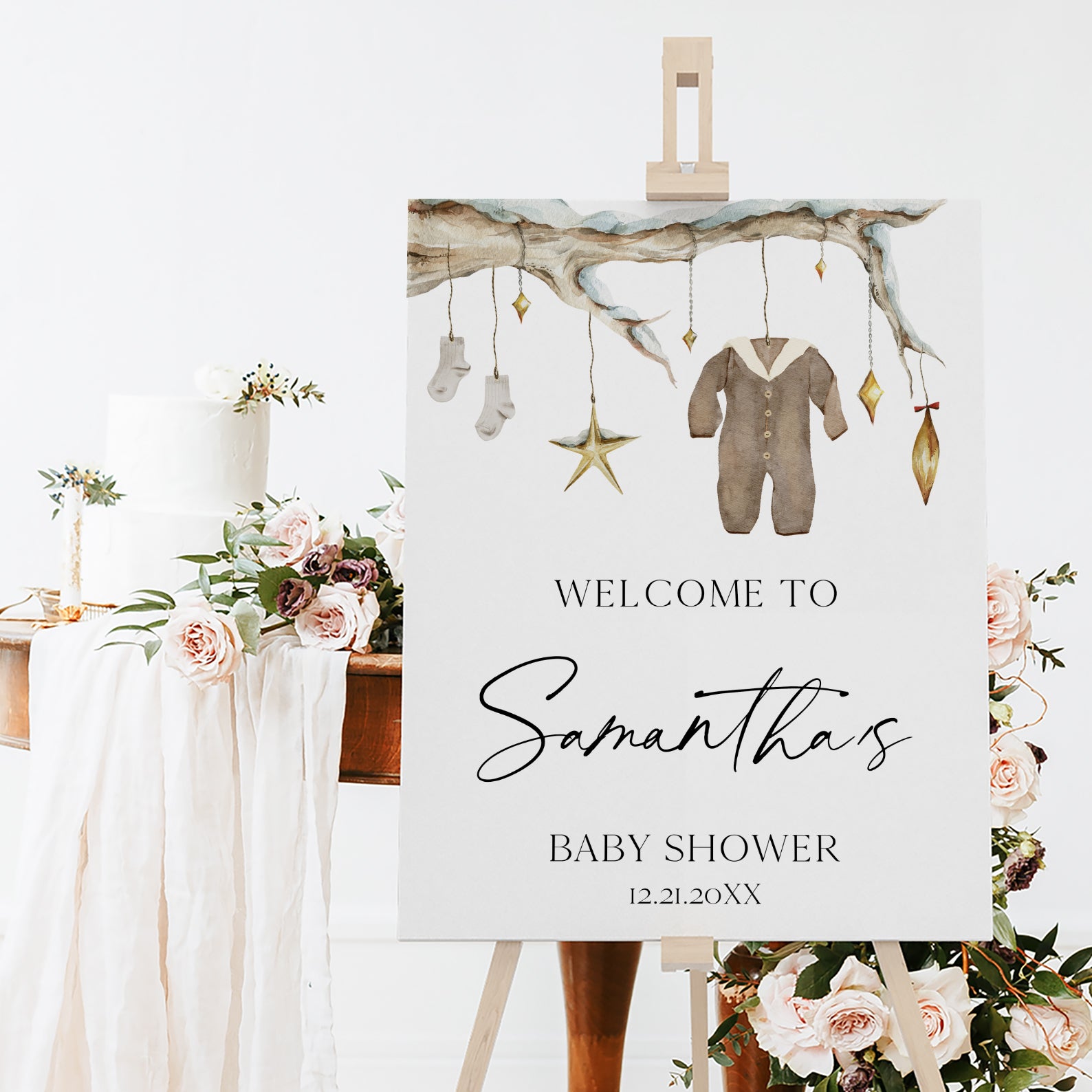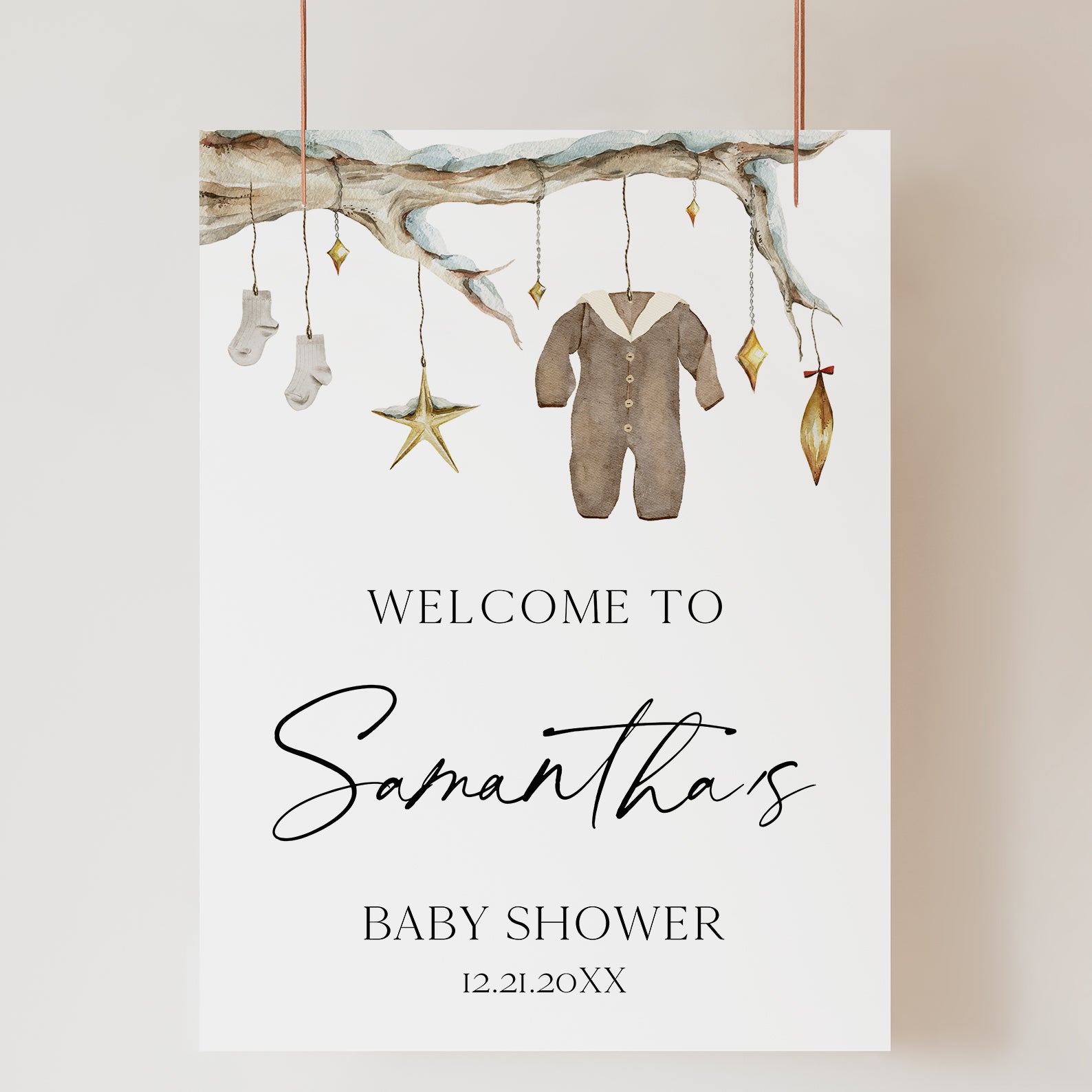 Welcome guests to your winter baby shower with our minimalist sign. Featuring a tree branch, brown baby jumpsuit, white socks, and twinkling stars, this sign adds a stylish and festive touch to your celebration.