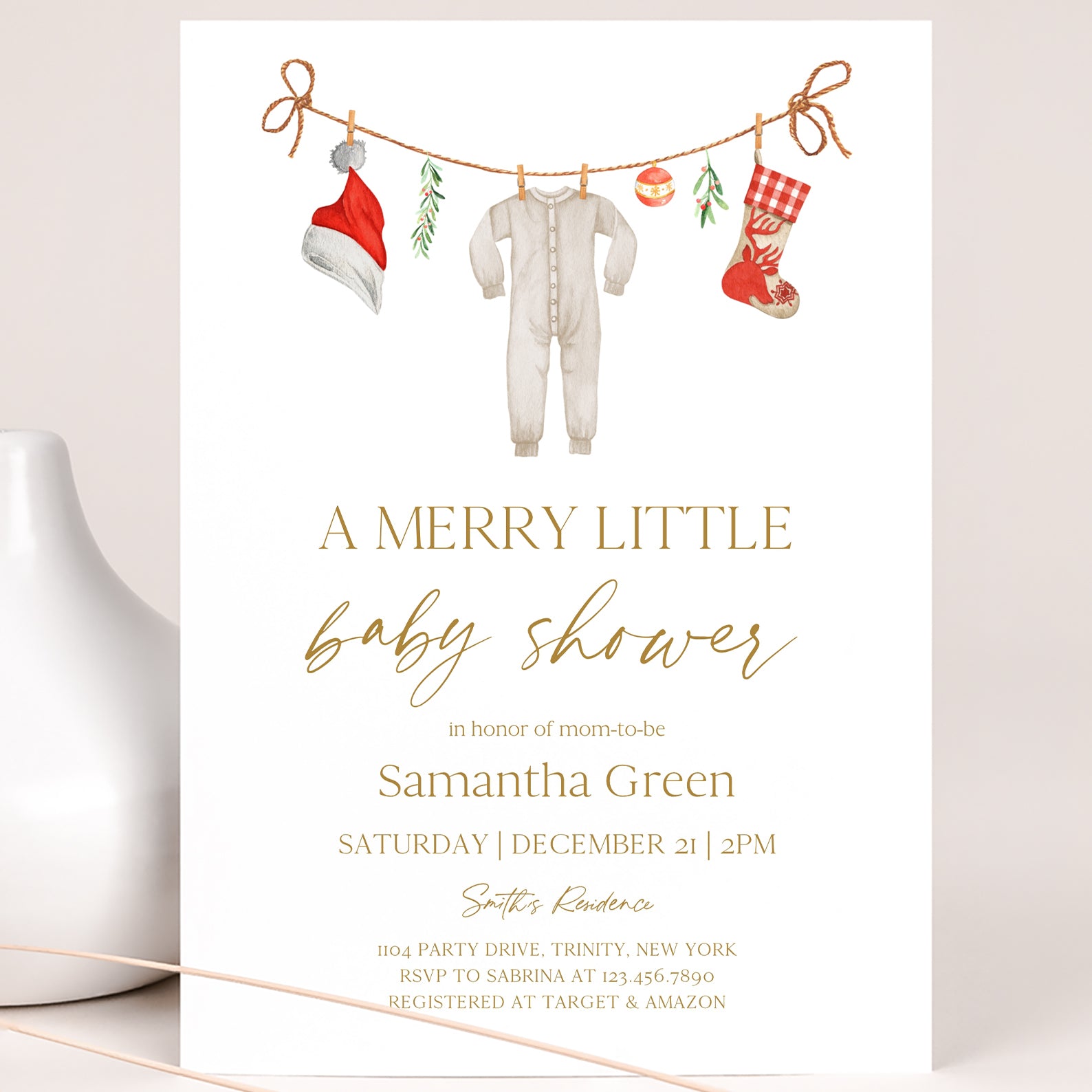Celebrate new beginnings with our minimalist Winter Baby Shower Digital Invitation. Featuring a cute hanging baby jumpsuit, Christmas hat, and cozy socks, this design sets a charming tone for your merry gathering. Perfect for sharing the excitement of your holiday season celebration.
