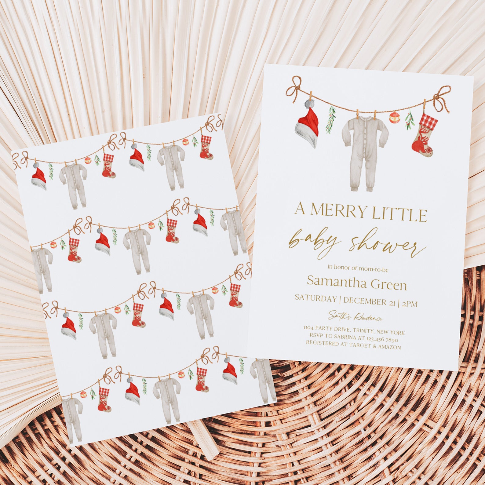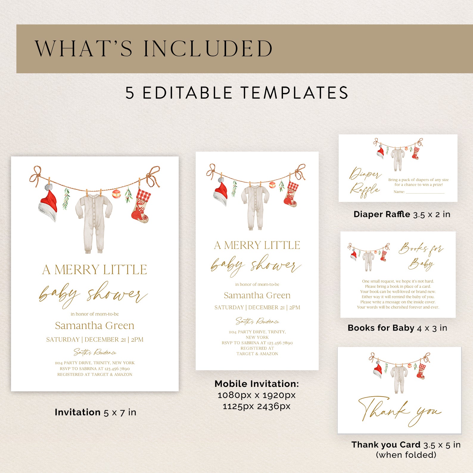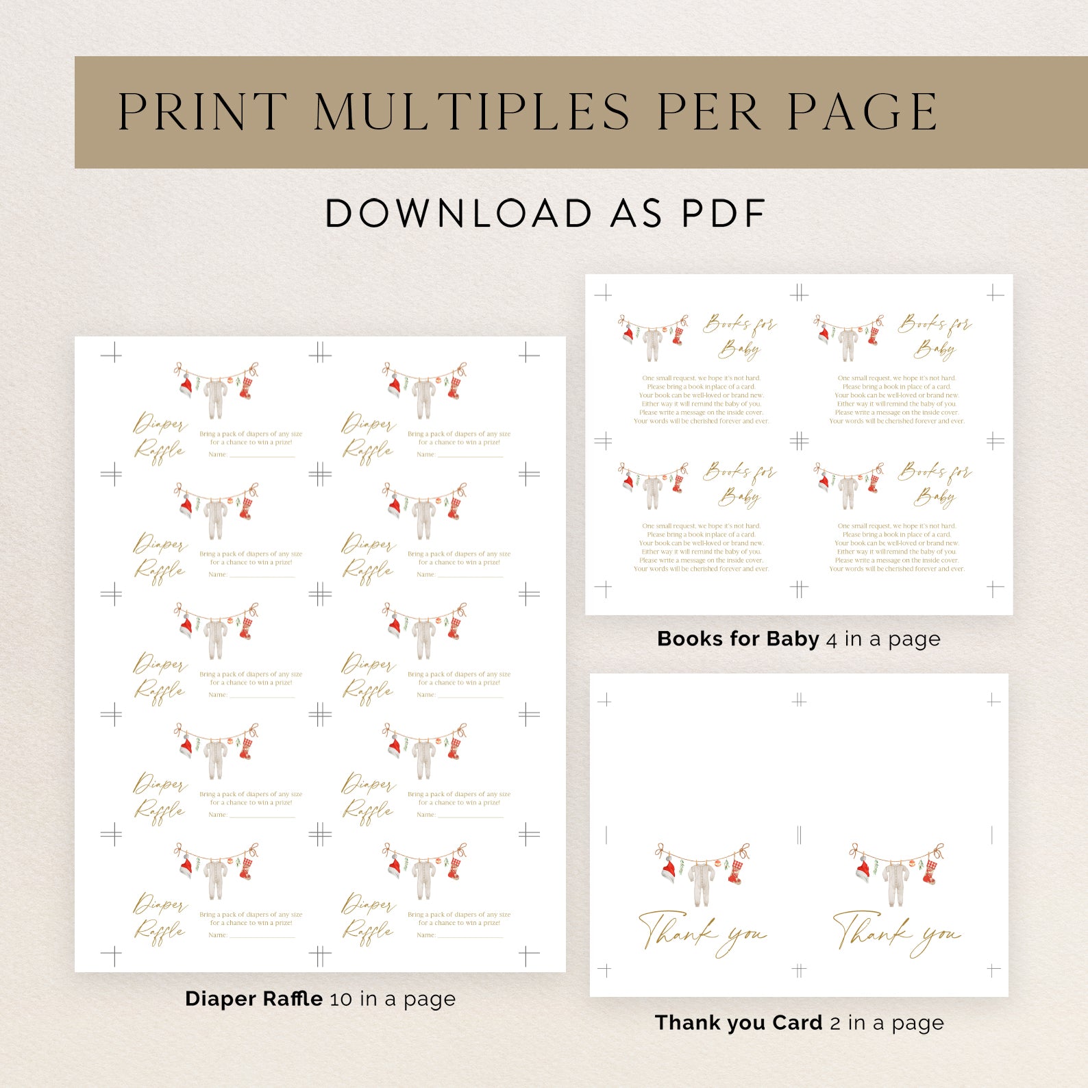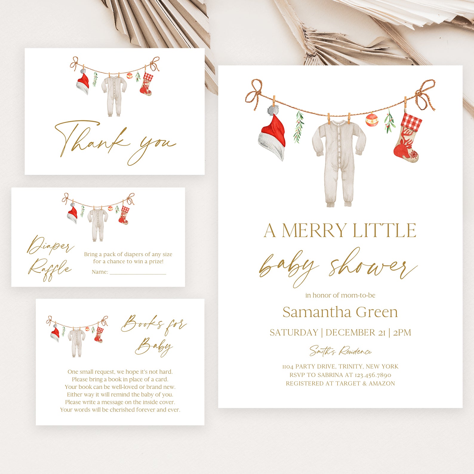 Welcome your little one with our minimalist Winter Baby Shower bundle. This set includes a digital invitation, mobile invite, diaper raffle, books for baby cards, and thank you cards, all featuring a cute hanging baby jumpsuit, Christmas hat, and cozy socks.