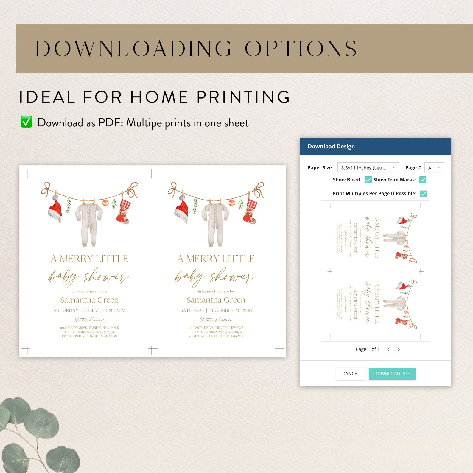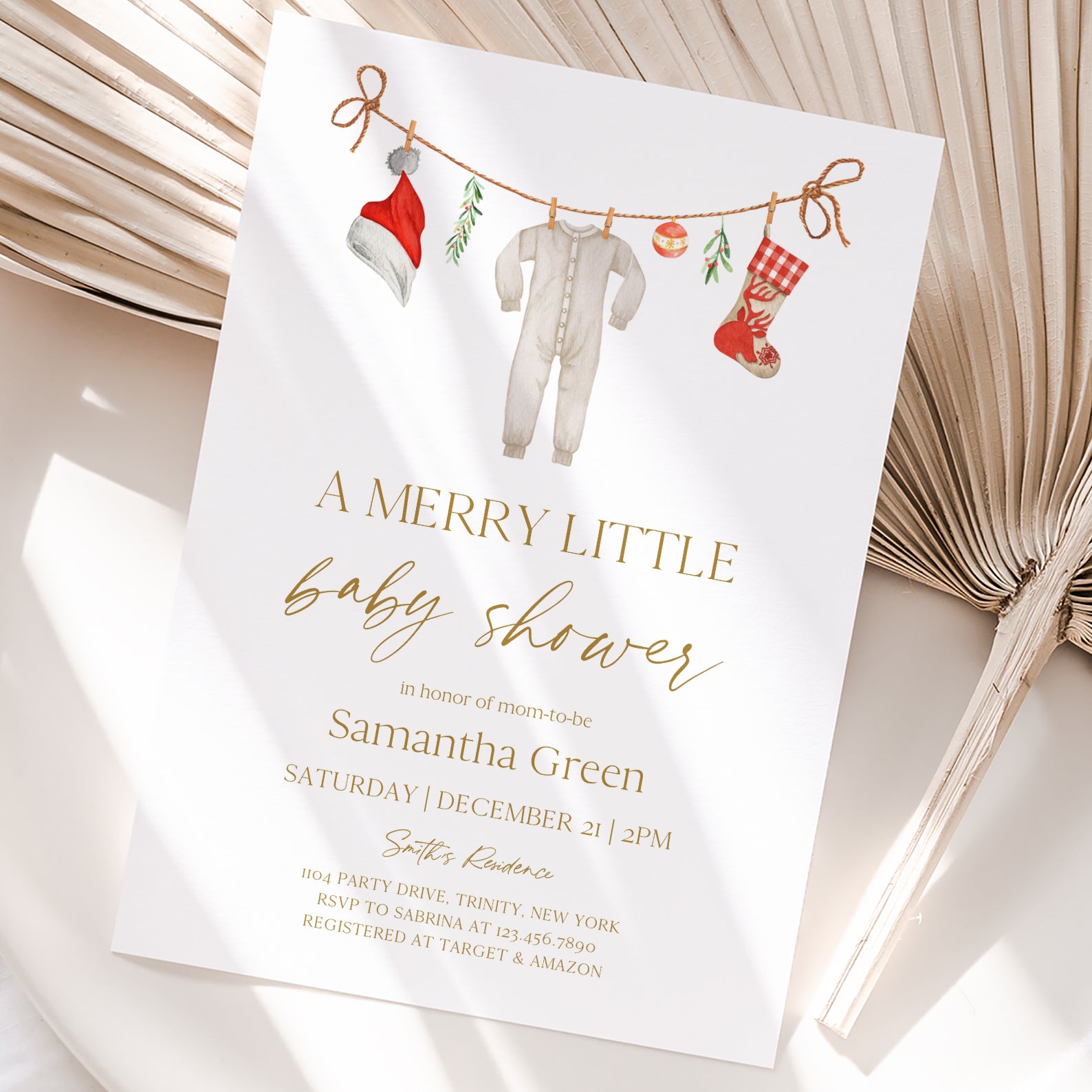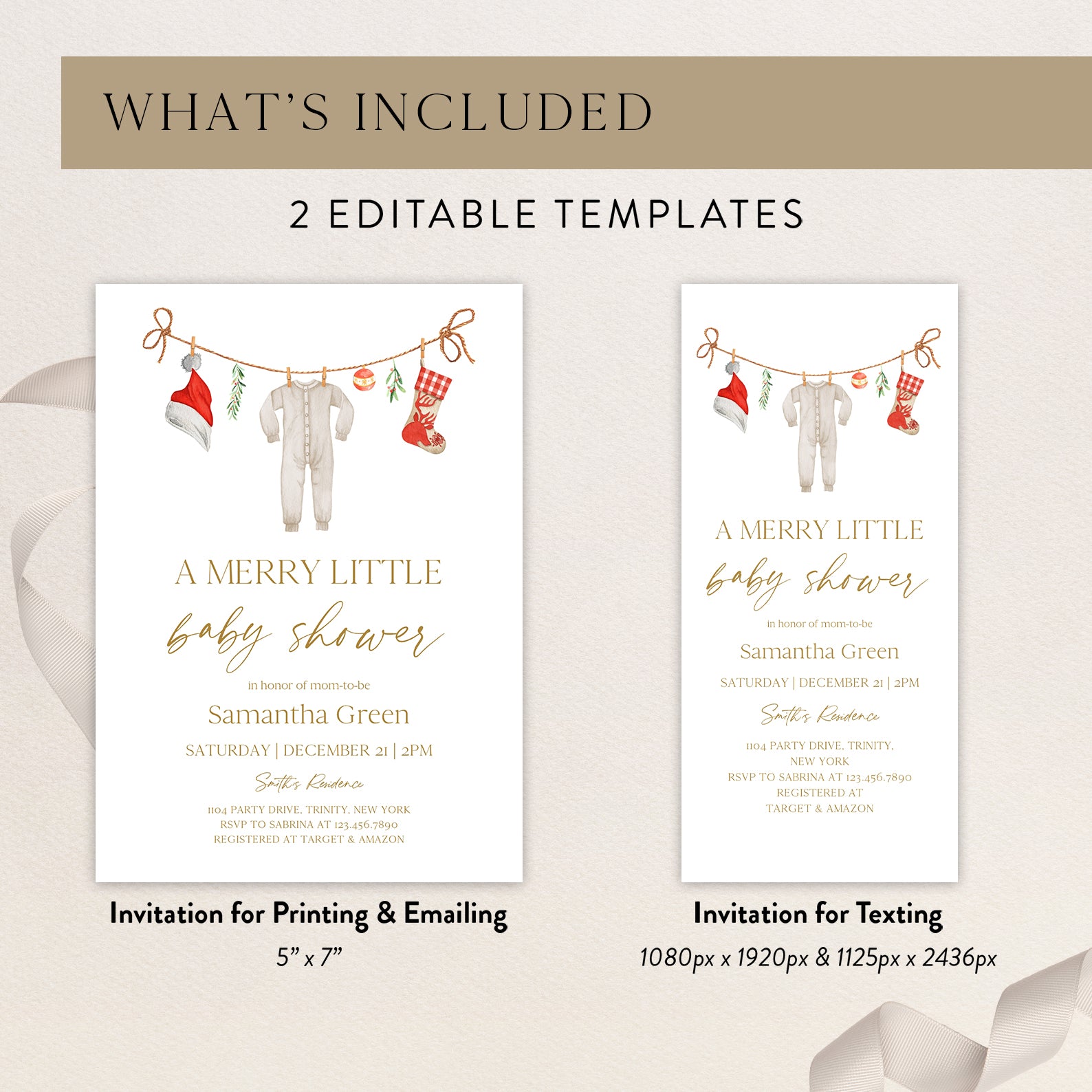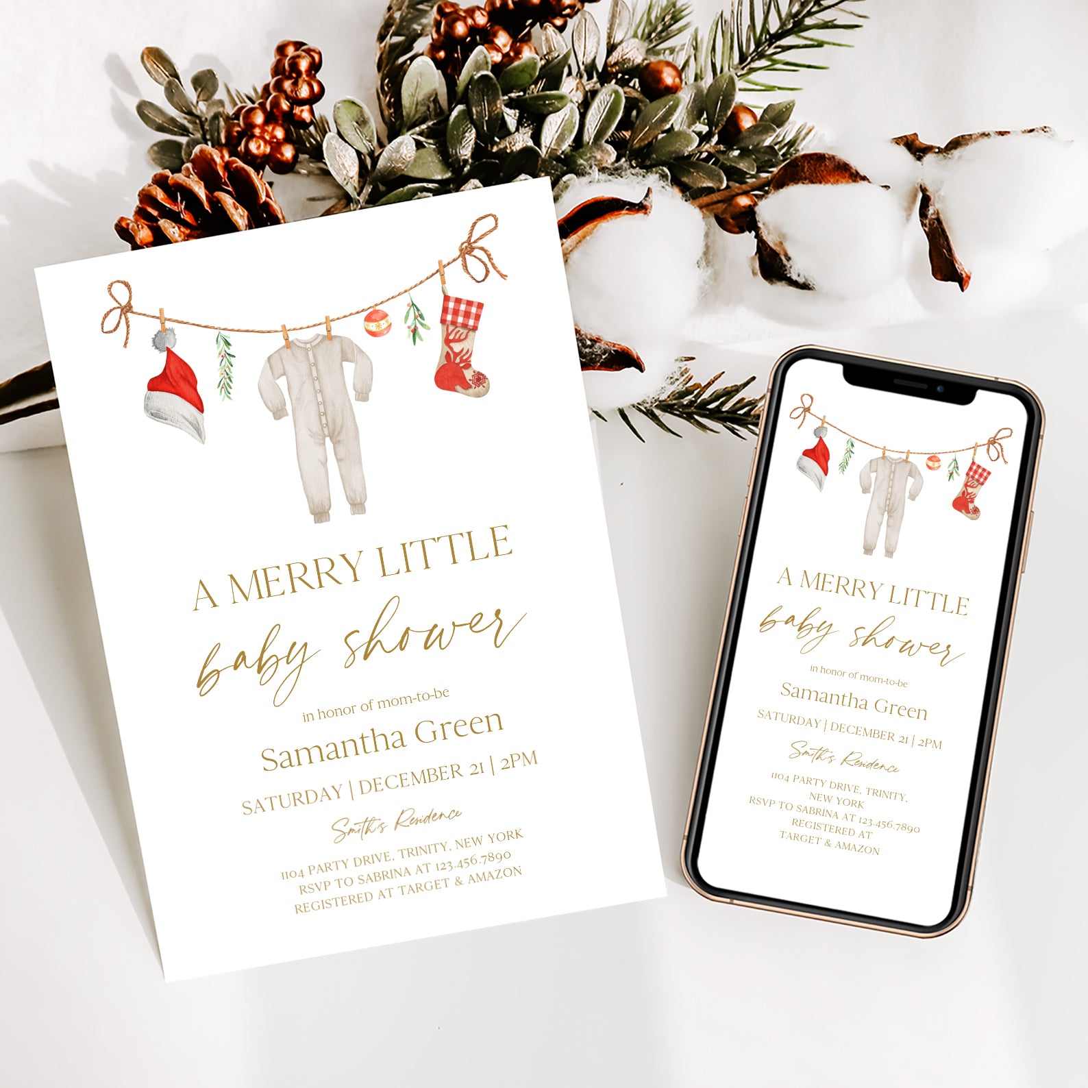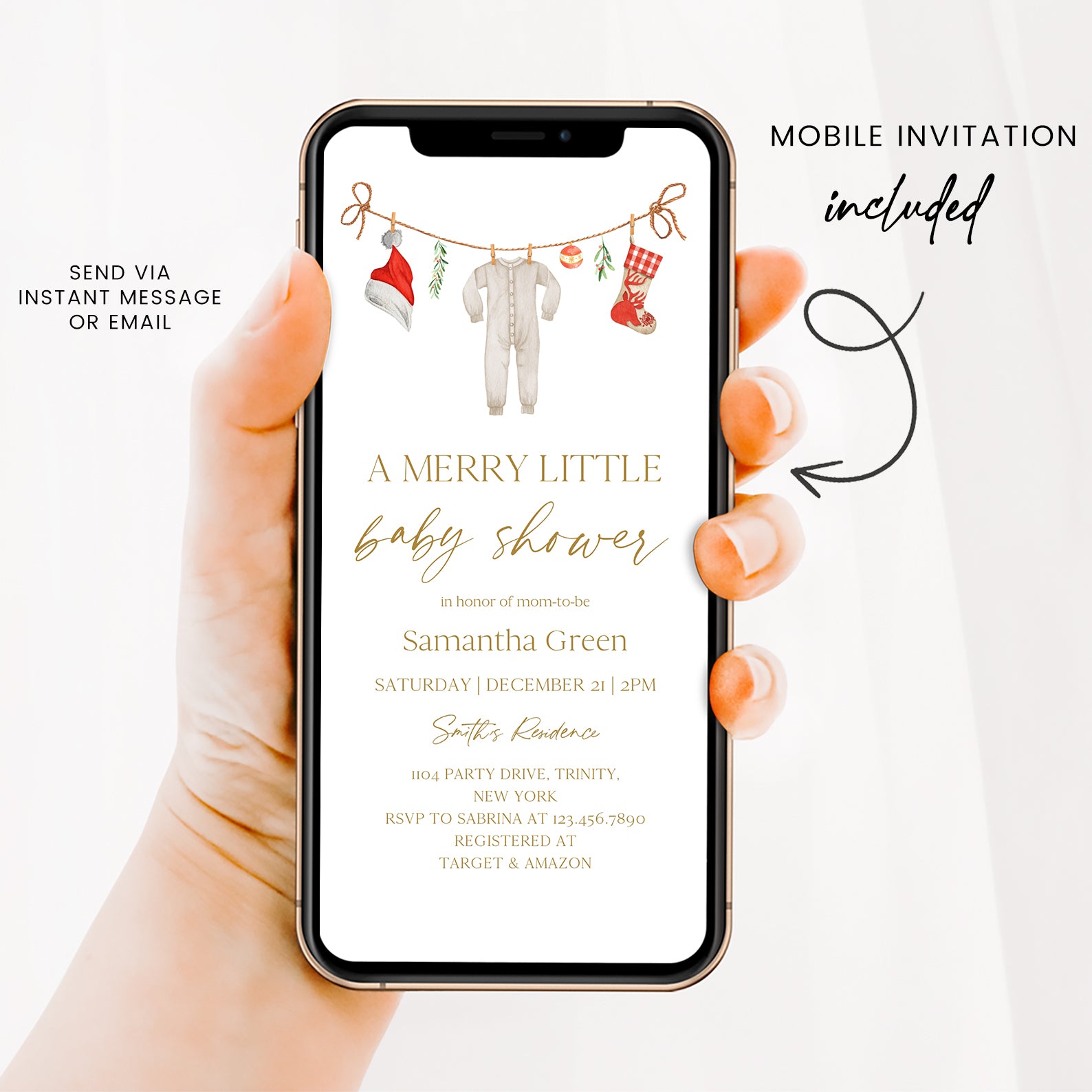 Welcome your little one with our minimalist Winter Baby Shower bundle. This set includes a digital invitation, mobile invite, diaper raffle, books for baby cards, and thank you cards, all featuring a cute hanging baby jumpsuit, Christmas hat, and cozy socks.