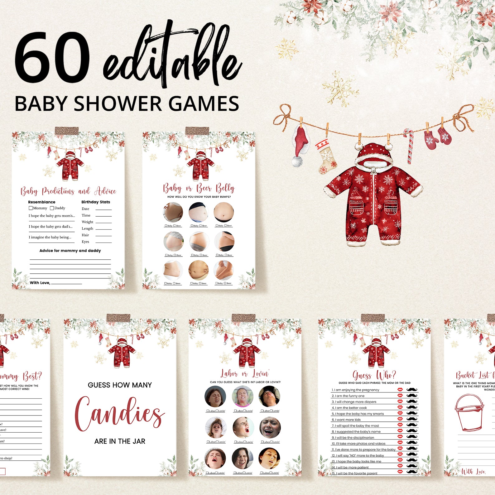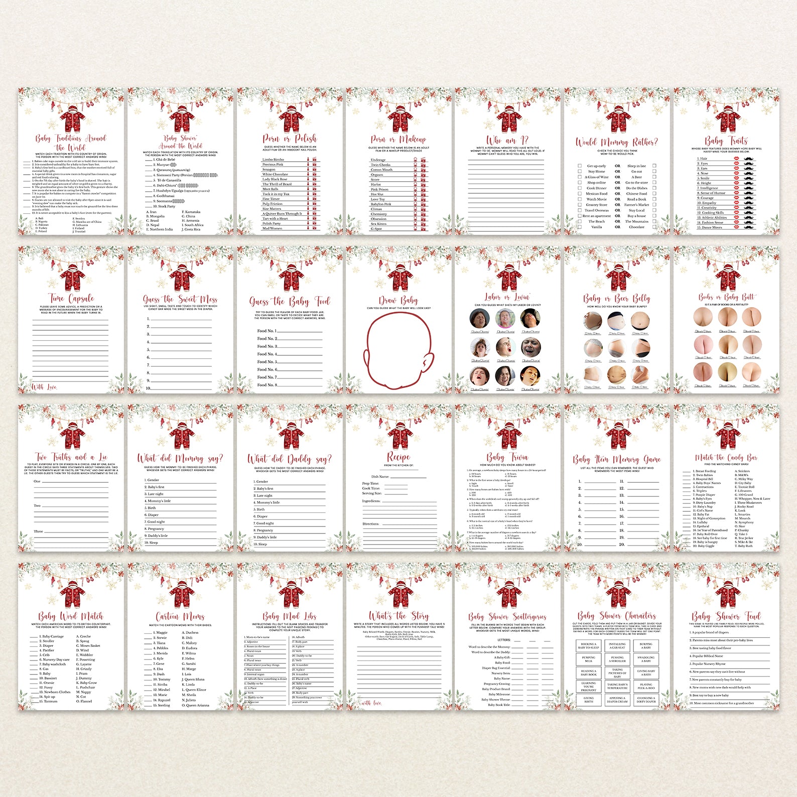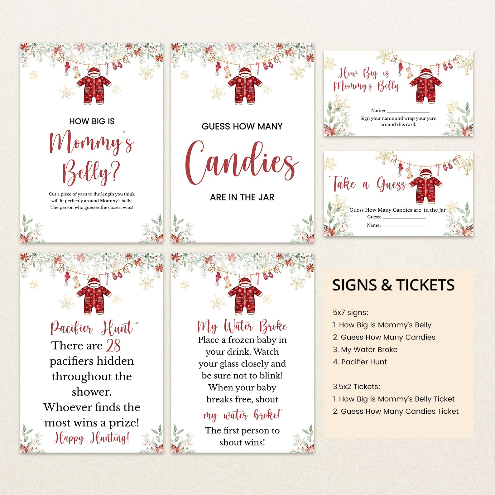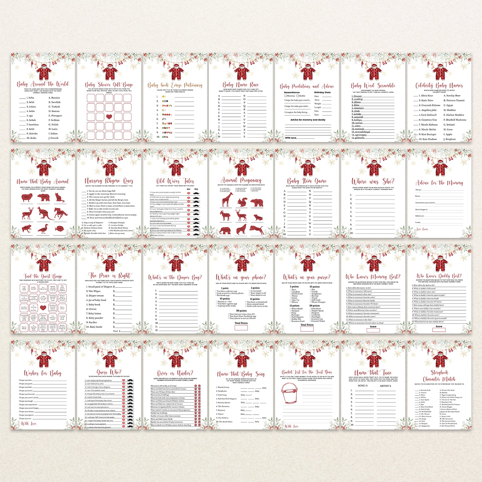 Bring the fun to your baby shower with our Winter Game Bundle! Featuring a festive design of poinsettias, gold snowflakes, and cozy holiday baby accents, this set includes 60 editable baby shower games to entertain your guests. From trivia to interactive activities, these beautifully designed games make your holiday celebration lively, memorable, and filled with laughter.