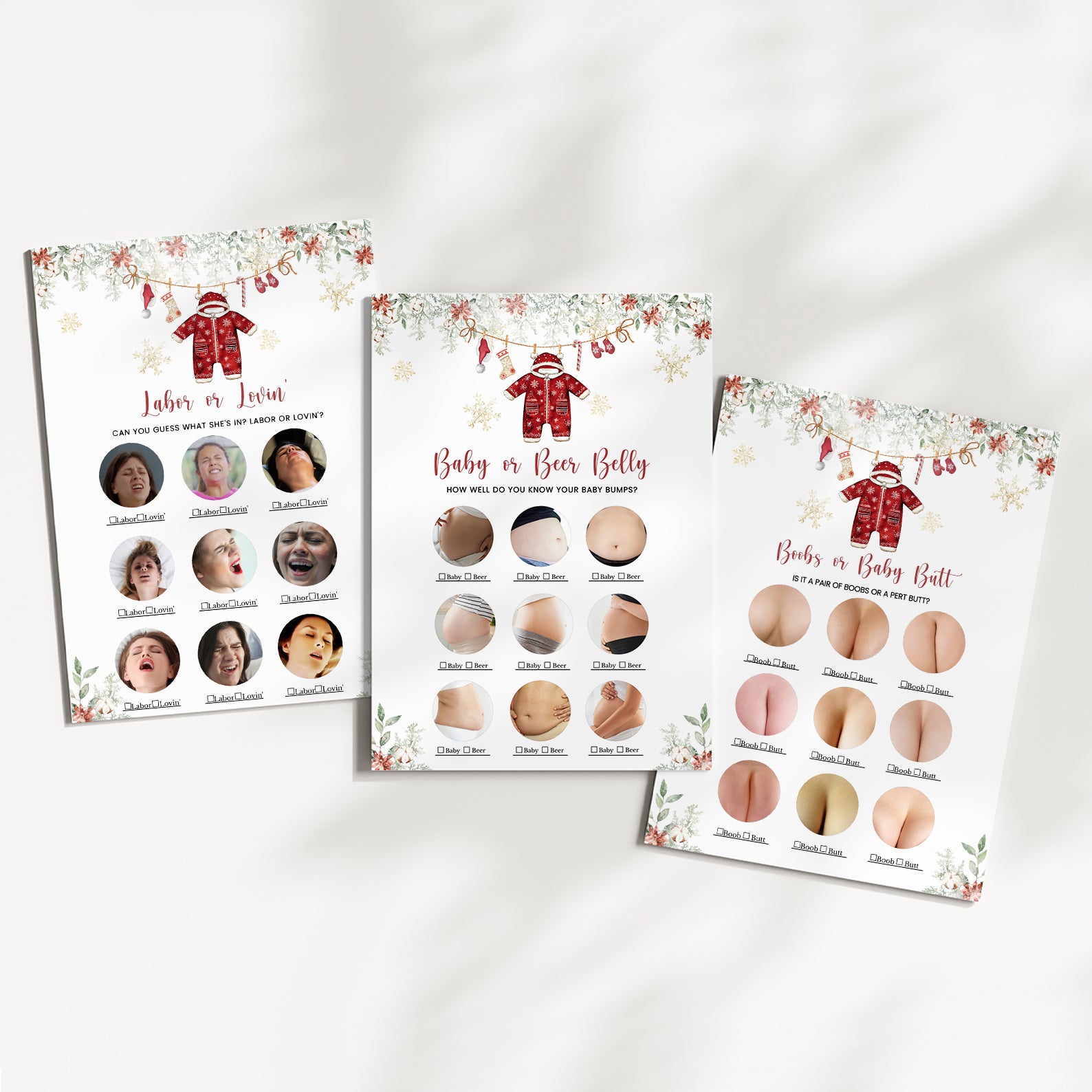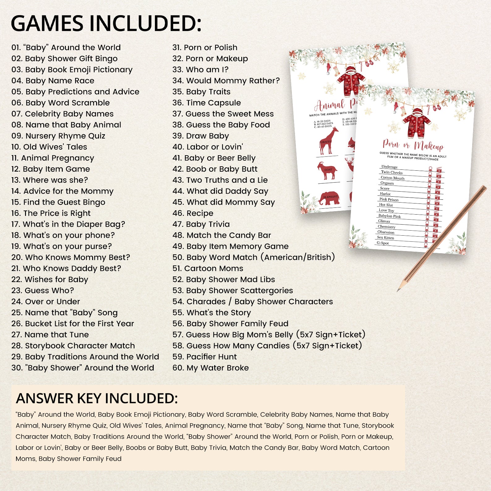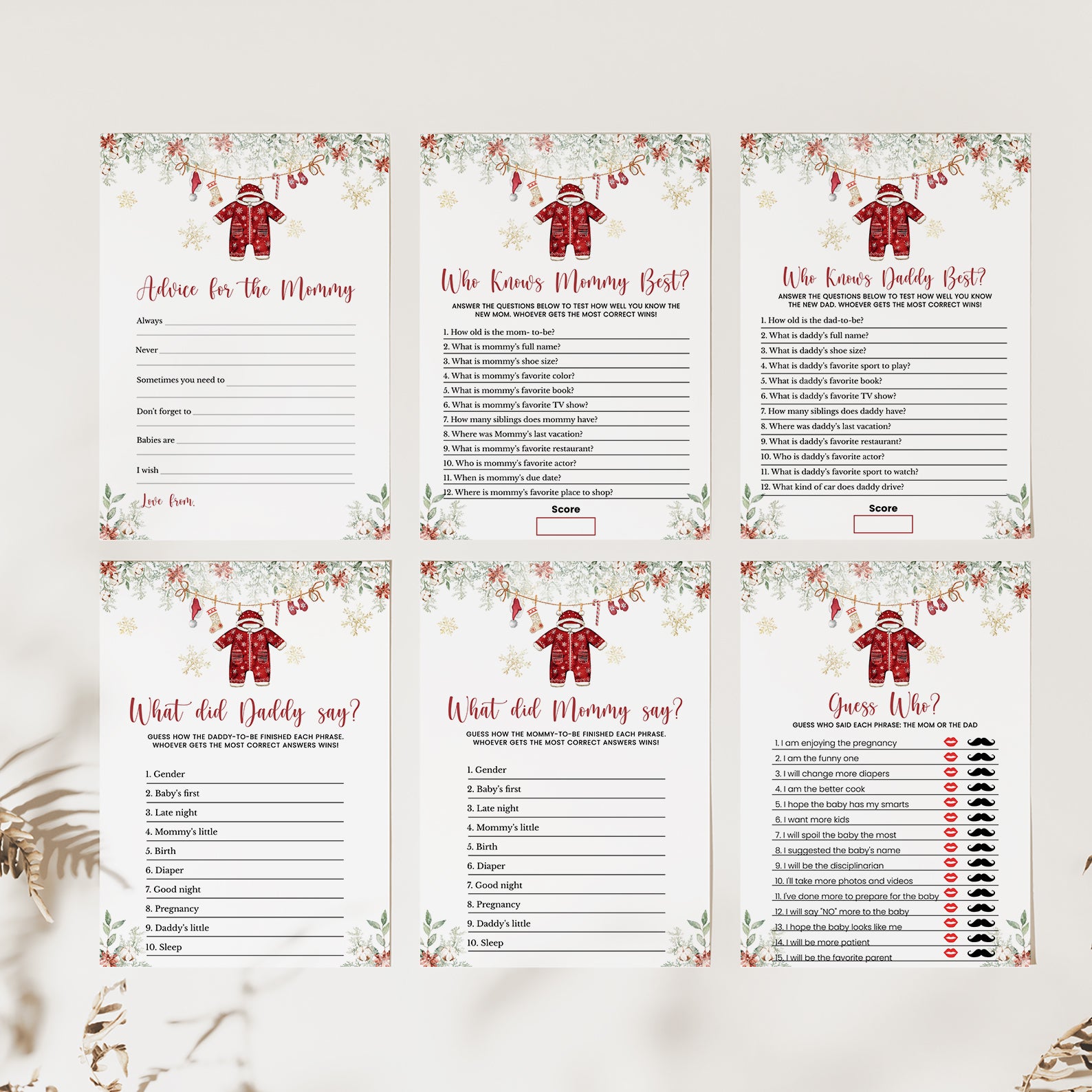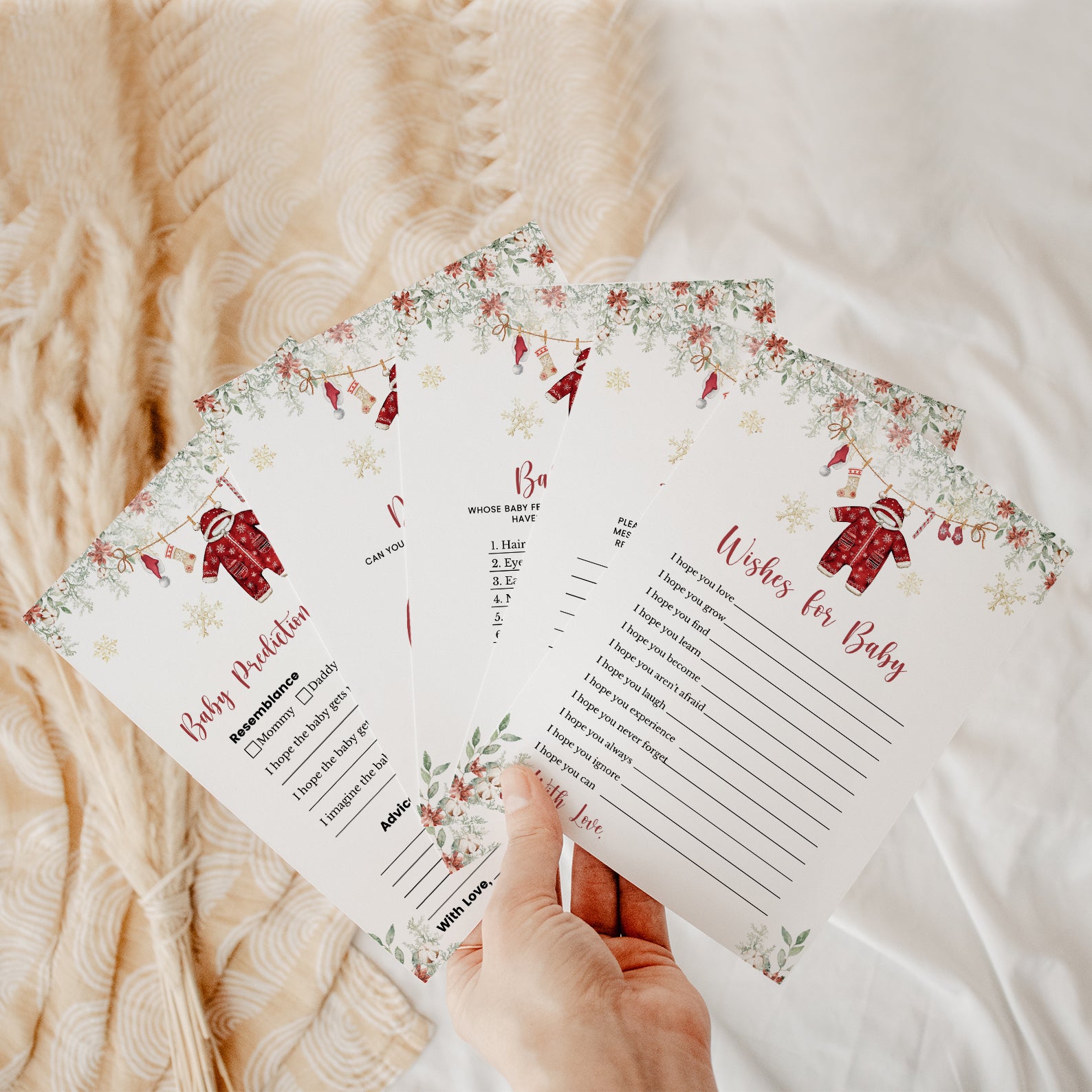 Bring the fun to your baby shower with our Winter Game Bundle! Featuring a festive design of poinsettias, gold snowflakes, and cozy holiday baby accents, this set includes 60 editable baby shower games to entertain your guests. From trivia to interactive activities, these beautifully designed games make your holiday celebration lively, memorable, and filled with laughter.