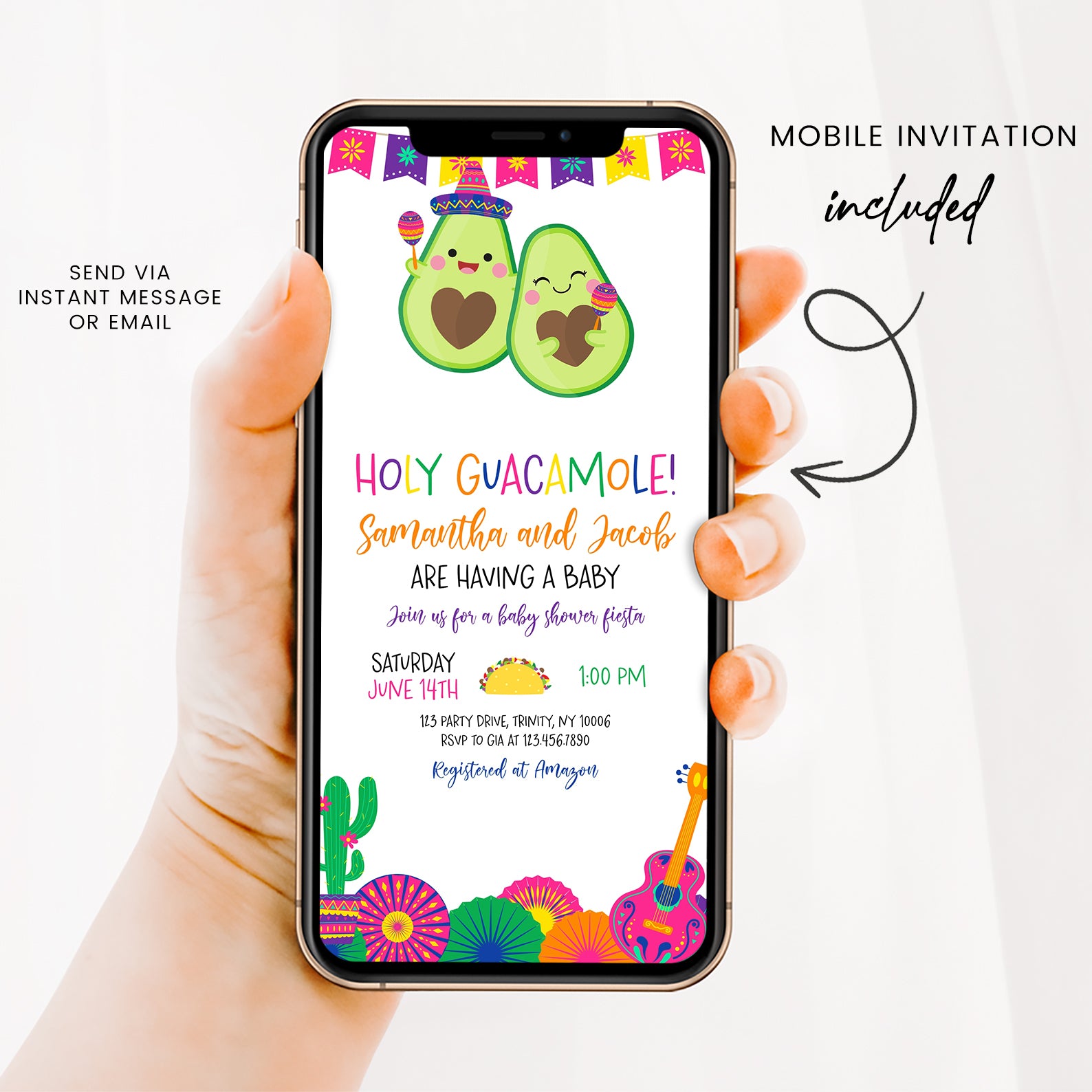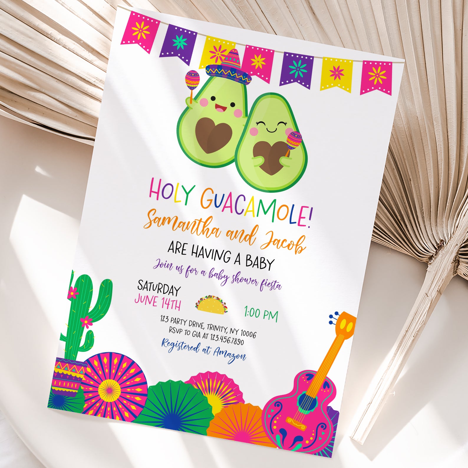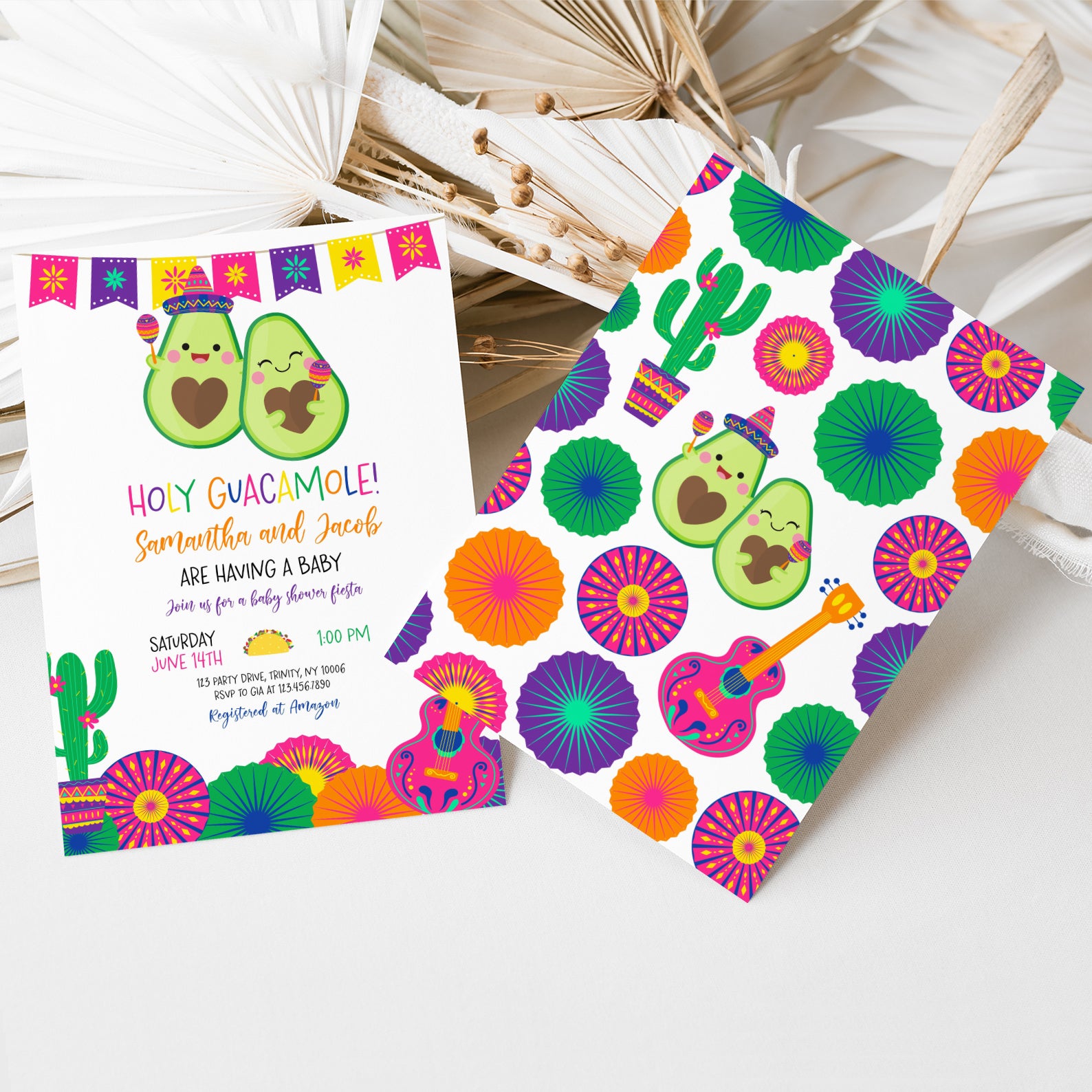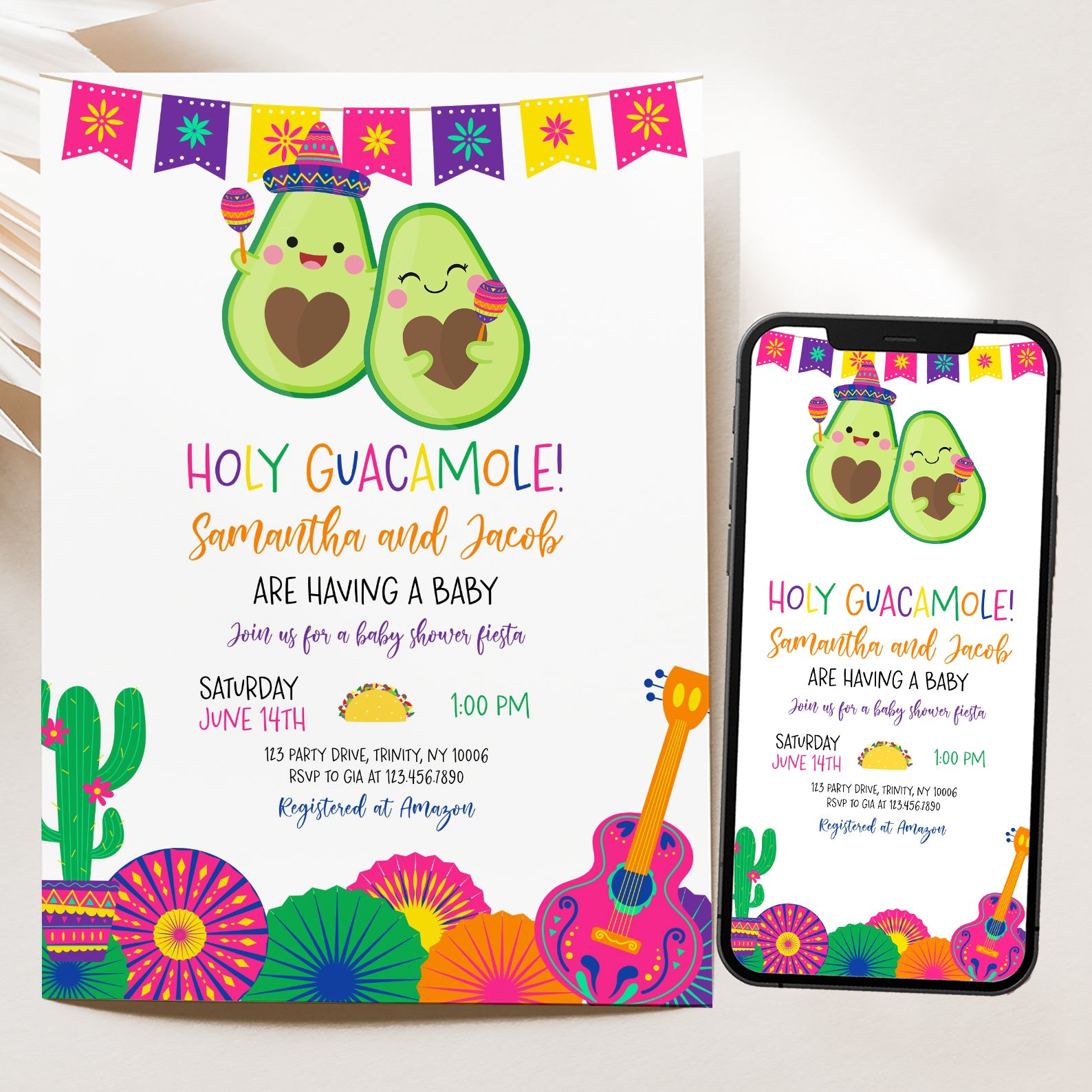 Celebrate your little one’s upcoming arrival with our vibrant Summer Baby Shower Digital Invitation, featuring a delightful Mexican theme! Adorned with a festive fiesta banner at the top, this invitation showcases adorable avocados, one donning a charming hat and shaking maracas. The design is completed with playful cacti in colorful pot, cheerful paper fans, and a pink guitar, setting the perfect tone for a fun-filled celebration. Easy to customize and share, this invitation will ensure your guests are excited to join the fiesta!
