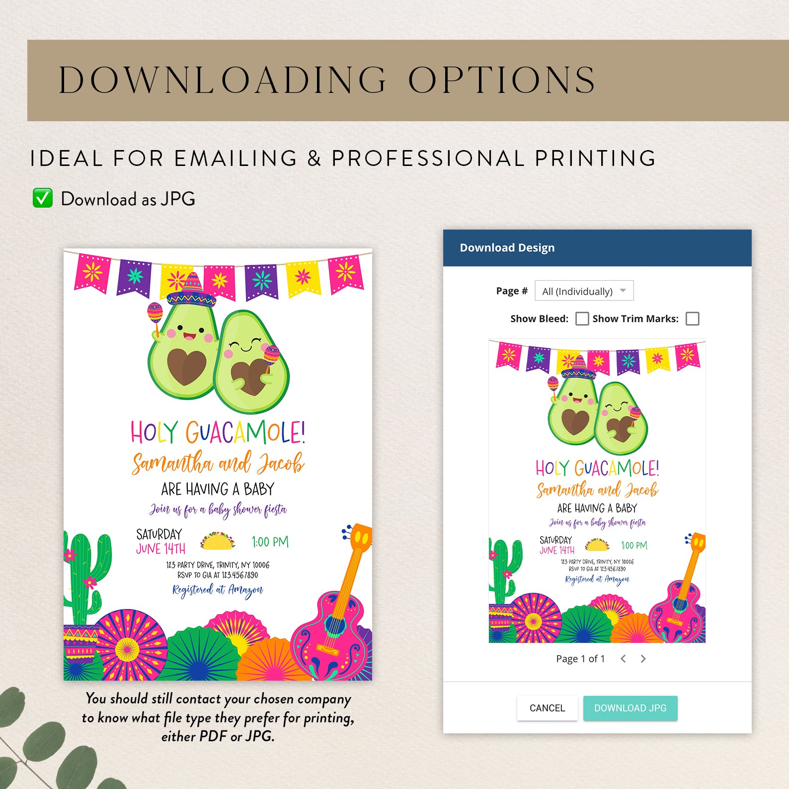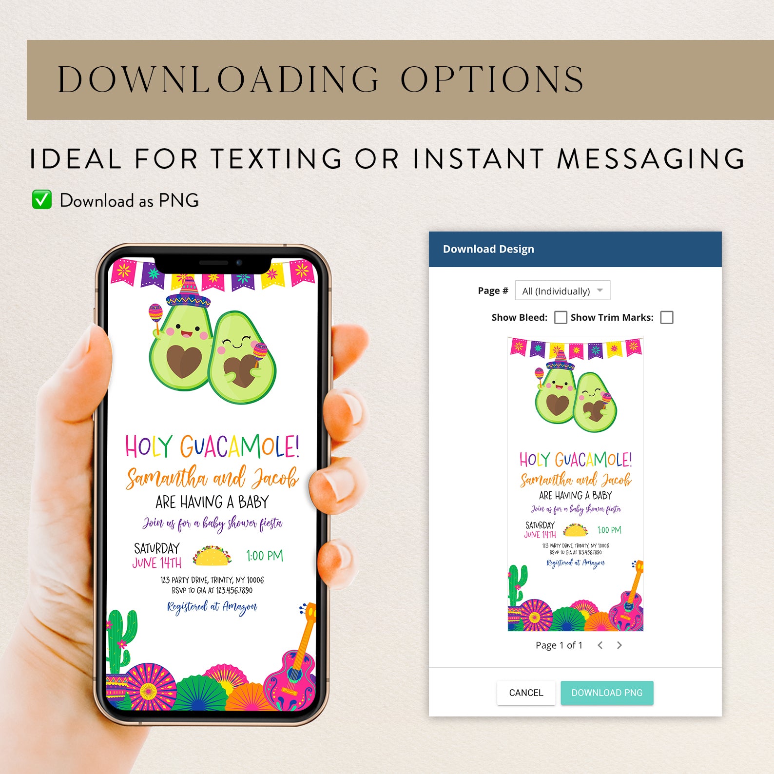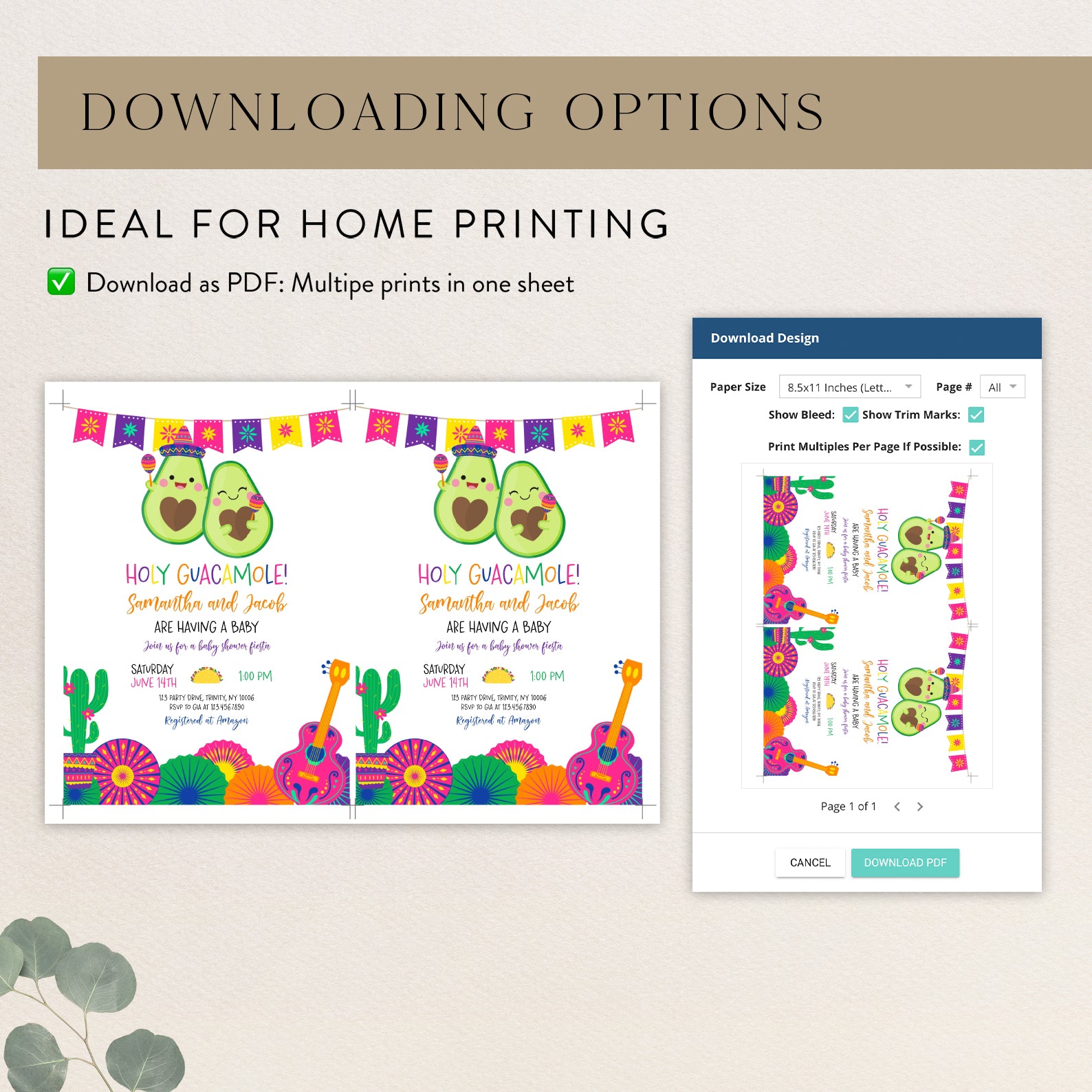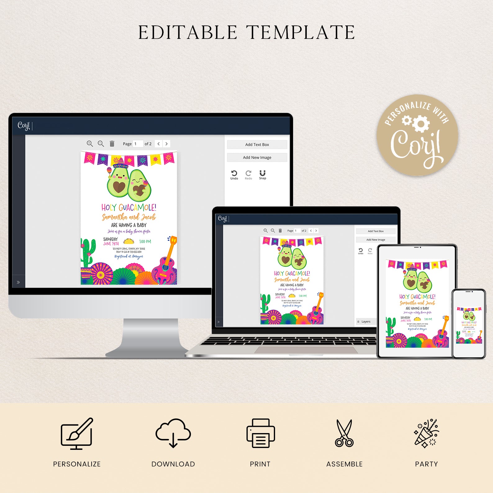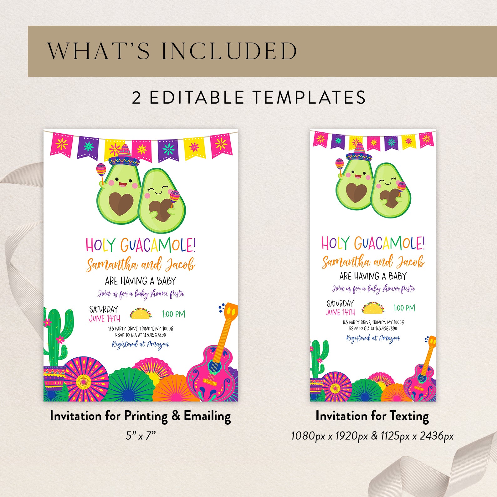 Celebrate your little one’s upcoming arrival with our vibrant Summer Baby Shower Digital Invitation, featuring a delightful Mexican theme! Adorned with a festive fiesta banner at the top, this invitation showcases adorable avocados, one donning a charming hat and shaking maracas. The design is completed with playful cacti in colorful pot, cheerful paper fans, and a pink guitar, setting the perfect tone for a fun-filled celebration. Easy to customize and share, this invitation will ensure your guests are excited to join the fiesta!