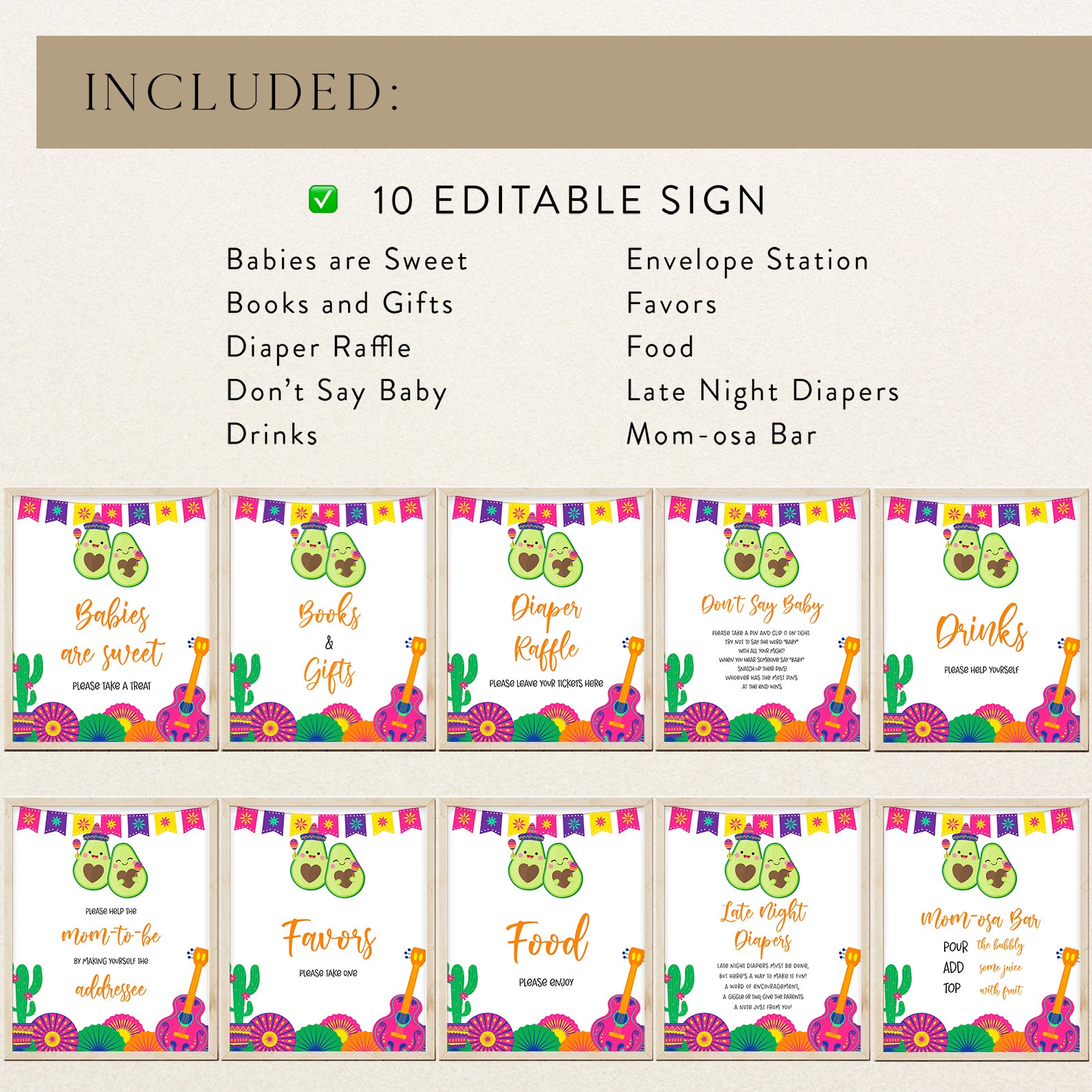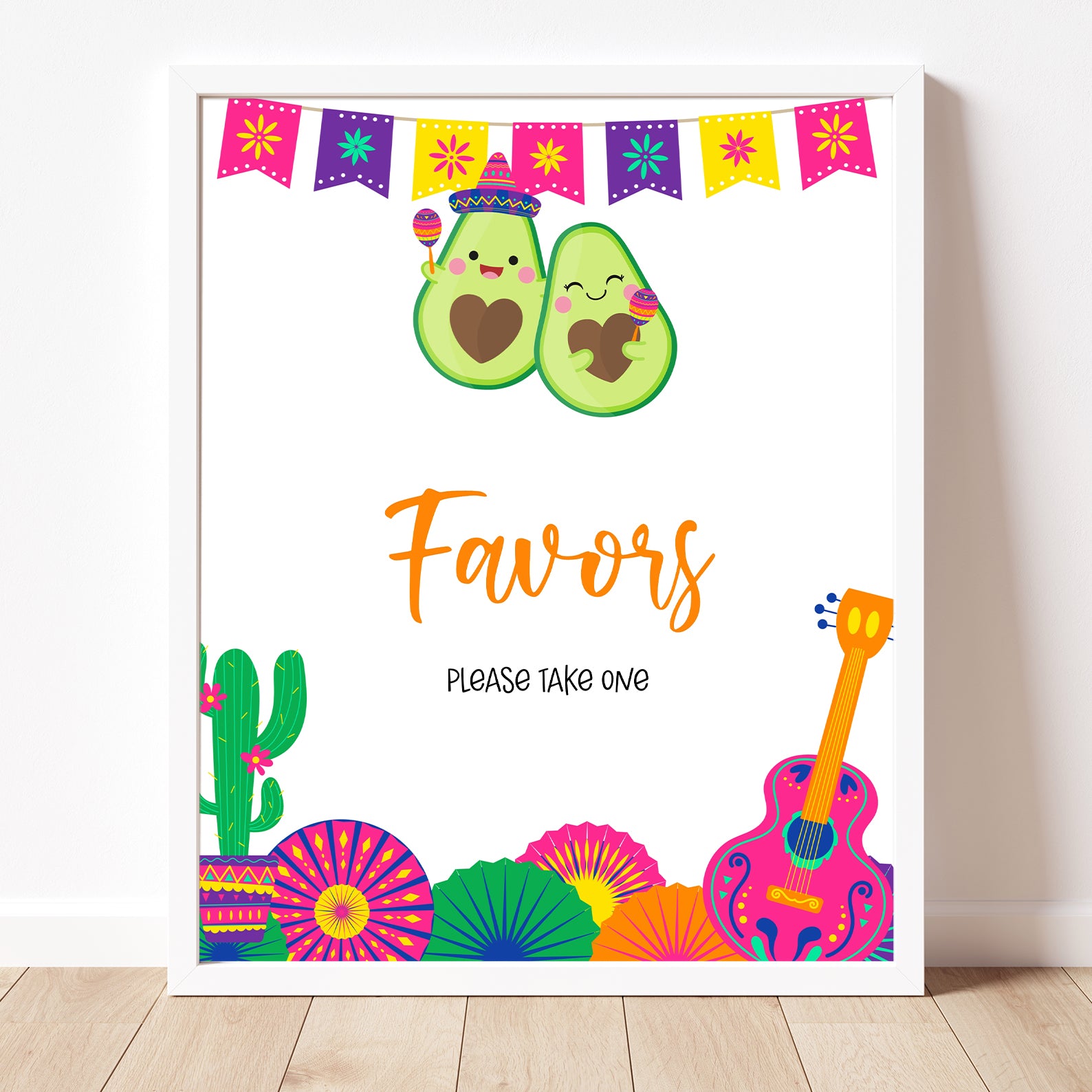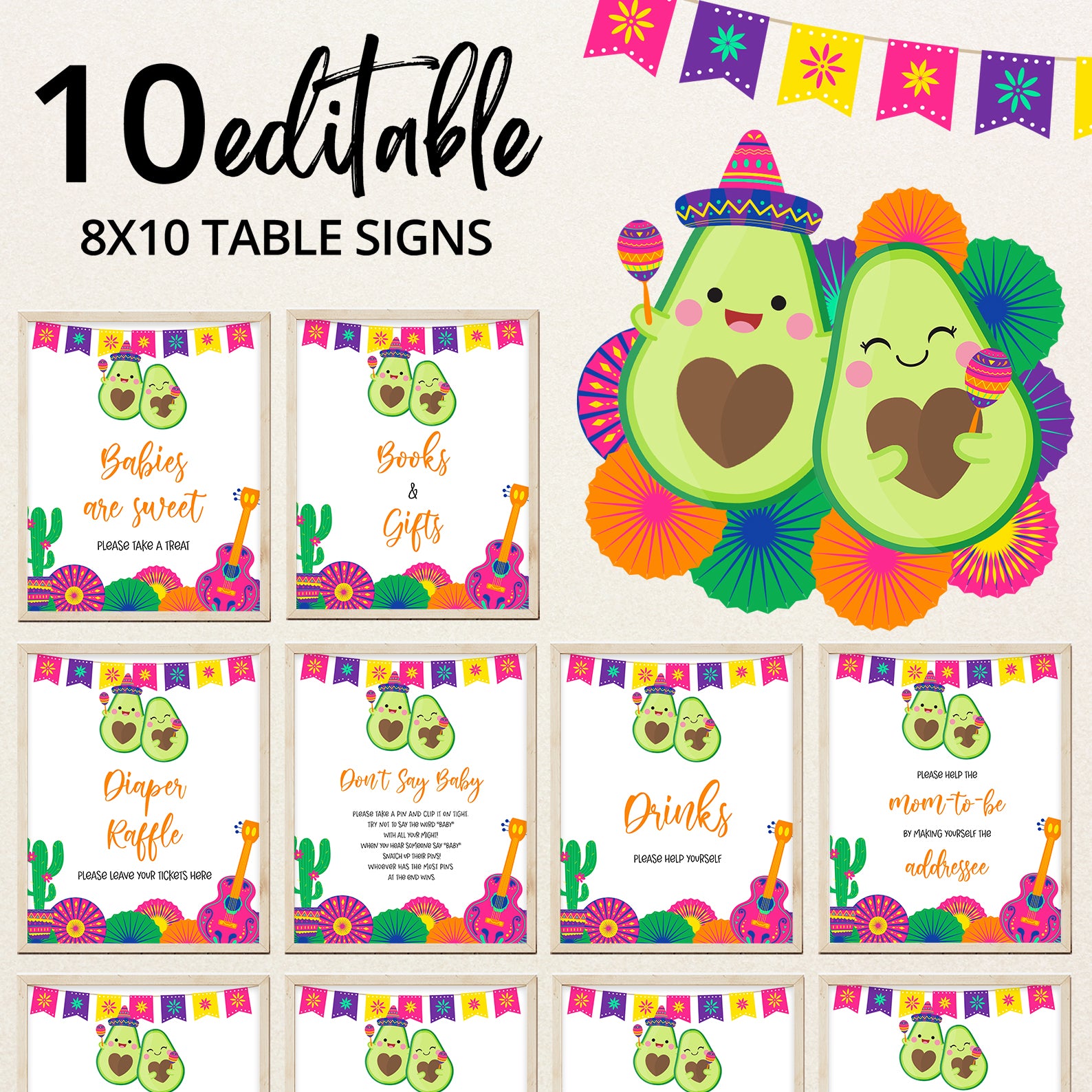 Celebrate your little one’s arrival with our vibrant Summer Baby Shower Table Signs, featuring a festive Mexican theme! These fun and colorful signs include delightful illustrations of avocados wearing charming hats, shaking maracas, and surrounded by playful cacti in colorful pots. The design is completed with cheerful paper fans, a pink guitar, and a fiesta banner at the top, setting a lively tone for your celebration. Customize these signs to suit your needs, whether it's for a Diaper Raffle, Don’t Say Baby, or any of the other fun messages. Make your fiesta-themed baby shower even more memorable with these adorable table signs!