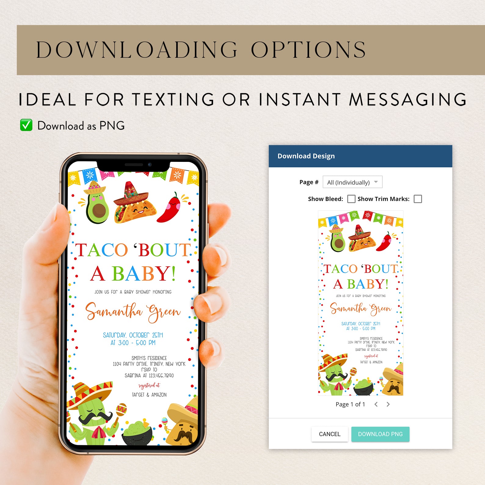 Celebrate the upcoming arrival of your little one with our delightful "Taco 'Bout a Baby" digital invitation! This vibrant Mexican-themed design features a festive banner, an adorable avocado and taco sporting a charming hat, a cheeky red chili, and a mustachioed cactus holding maracas, all ready to fiesta! Perfect for setting a joyful tone for your baby shower, this invitation is easy to customize and share, ensuring your guests are excited to join the celebration. Make your baby shower unforgettable with this fun and unique invitation that captures the spirit of family and fun!