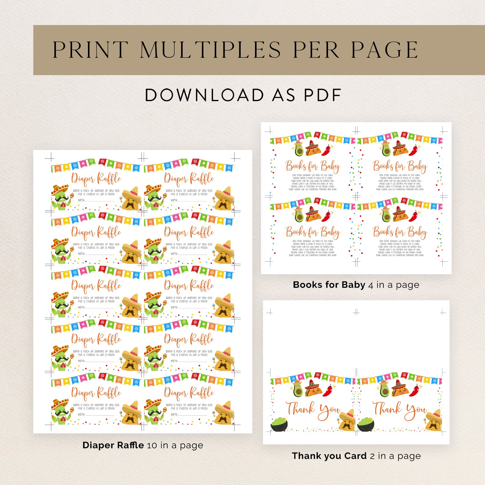 Spice up your baby shower with our fun-filled "Taco 'Bout a Baby" invitation bundle! Featuring a festive Mexican theme with a taco, avocado, chili, and maraca-shaking cactus, this playful set includes a digital invite, mobile version, diaper raffle card, books for baby insert, and thank you card. Easy to personalize and send, it’s the perfect way to kick off your celebration with flavor and flair!