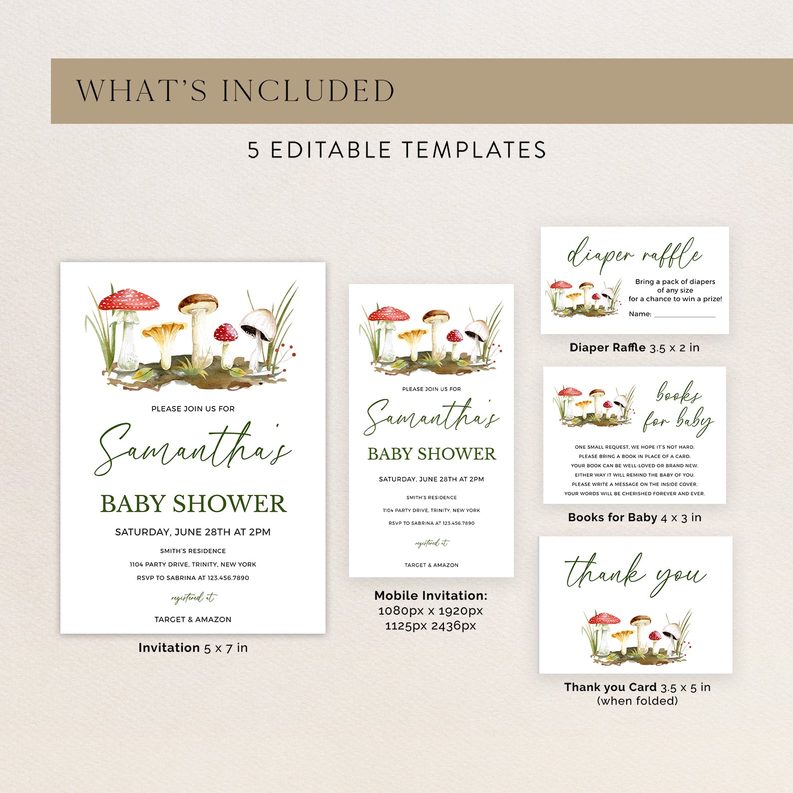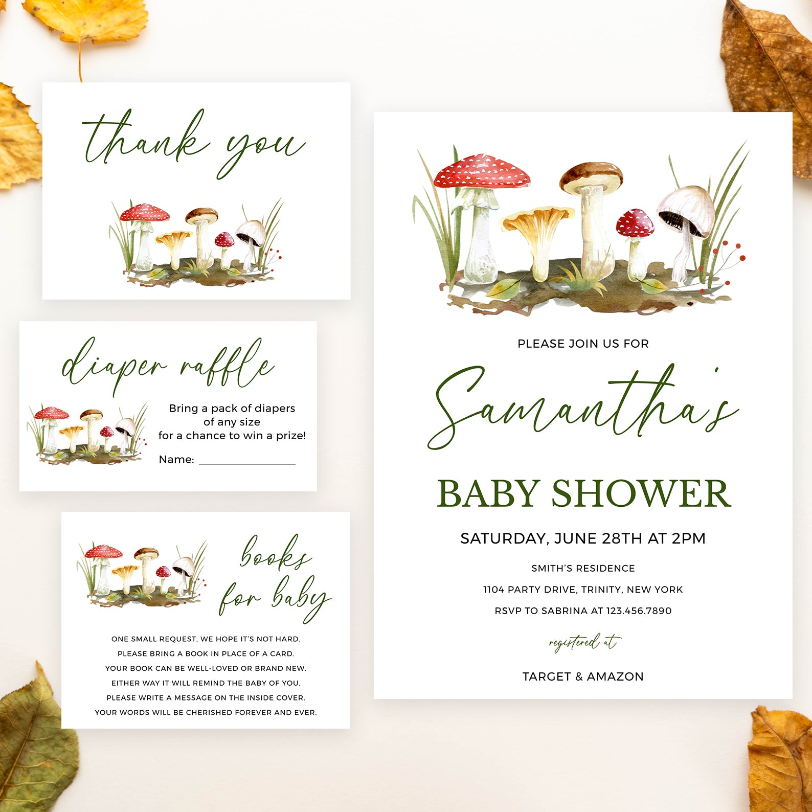 - Purchase this Green Fall Baby Shower Invite Bundle: Minimalist Mushrooms & Grass template