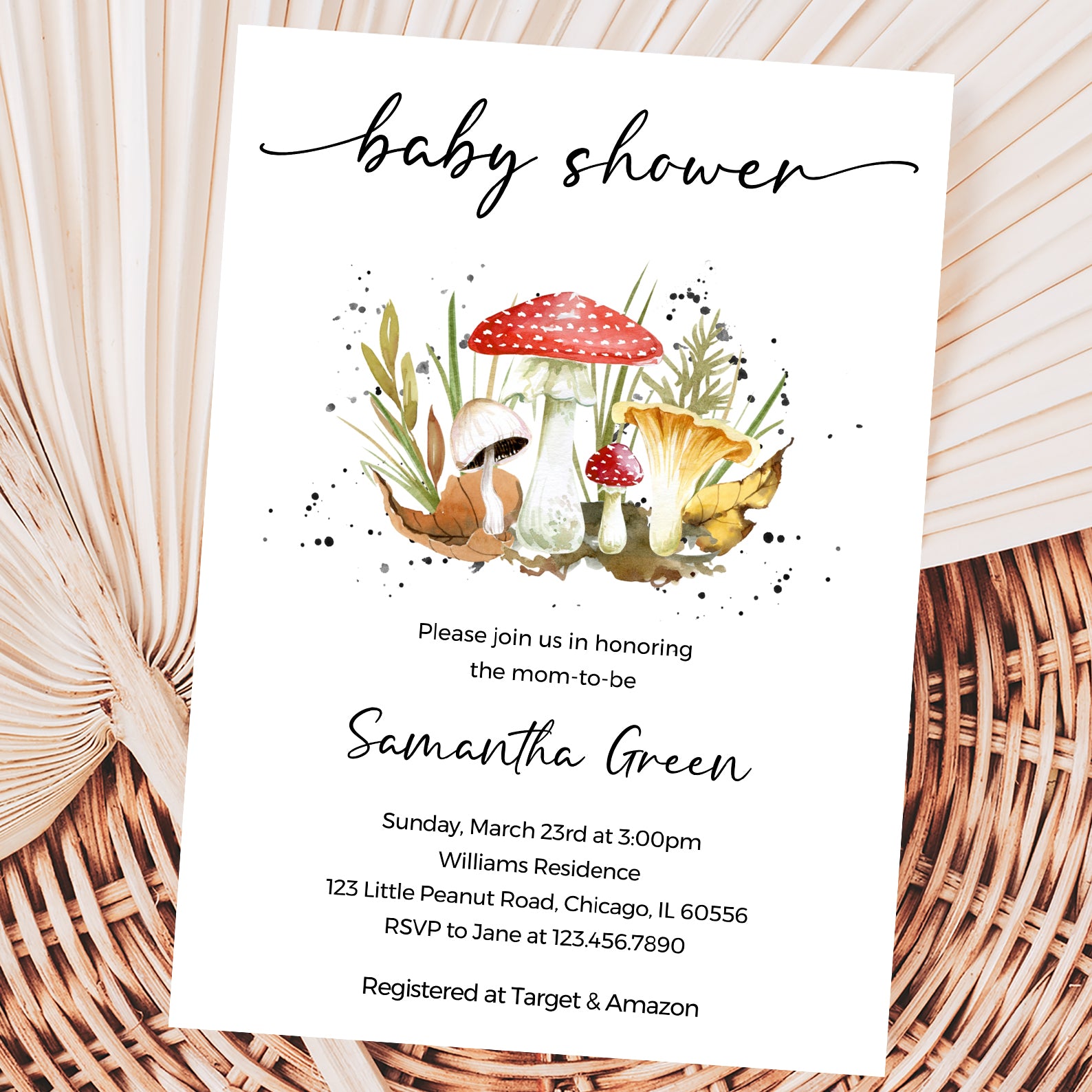 - Purchase this Minimalist Fall Baby Shower Invite: Growing Mushrooms Design template