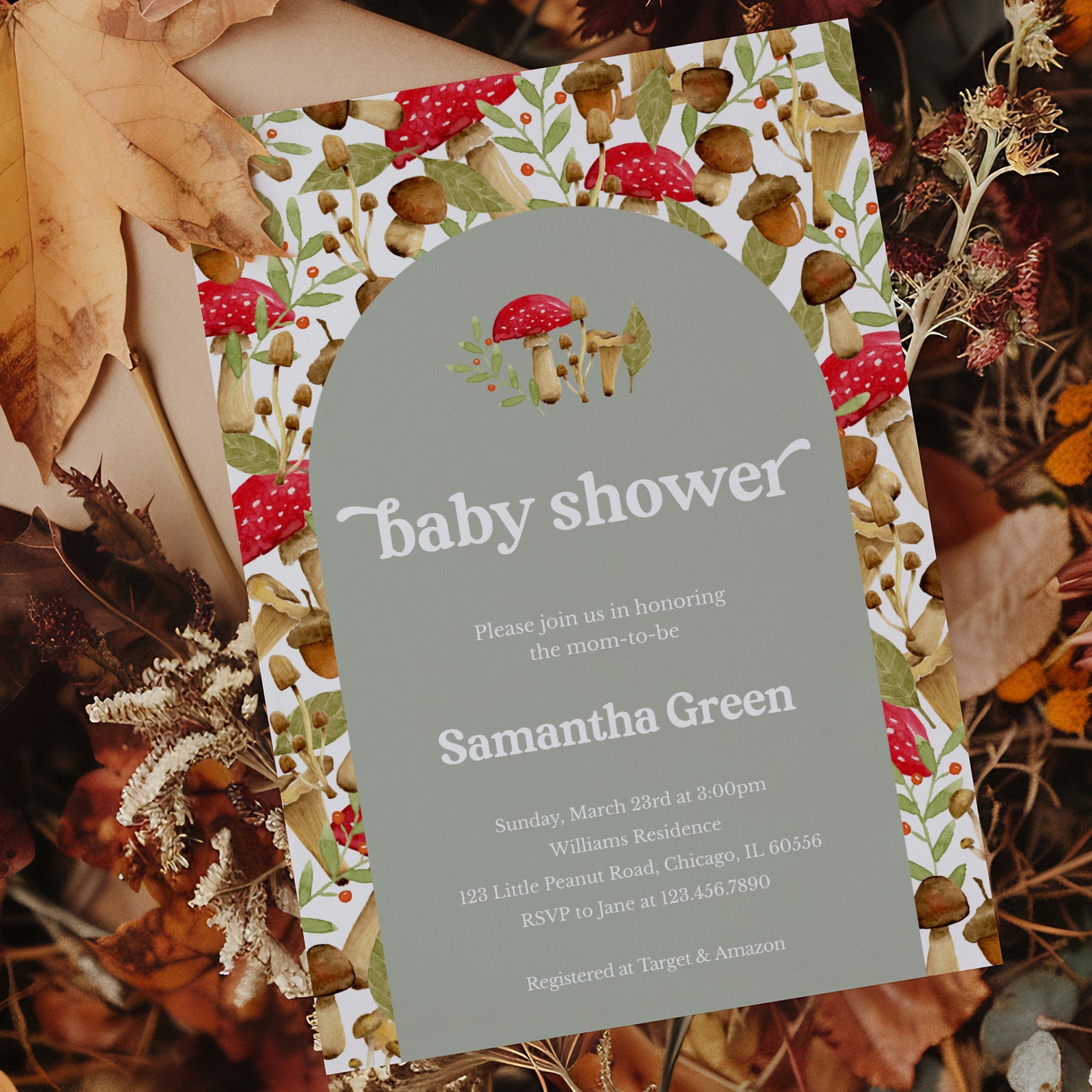 - Purchase this Mushrooms & Acorns Fall Baby Shower Digital Invite template