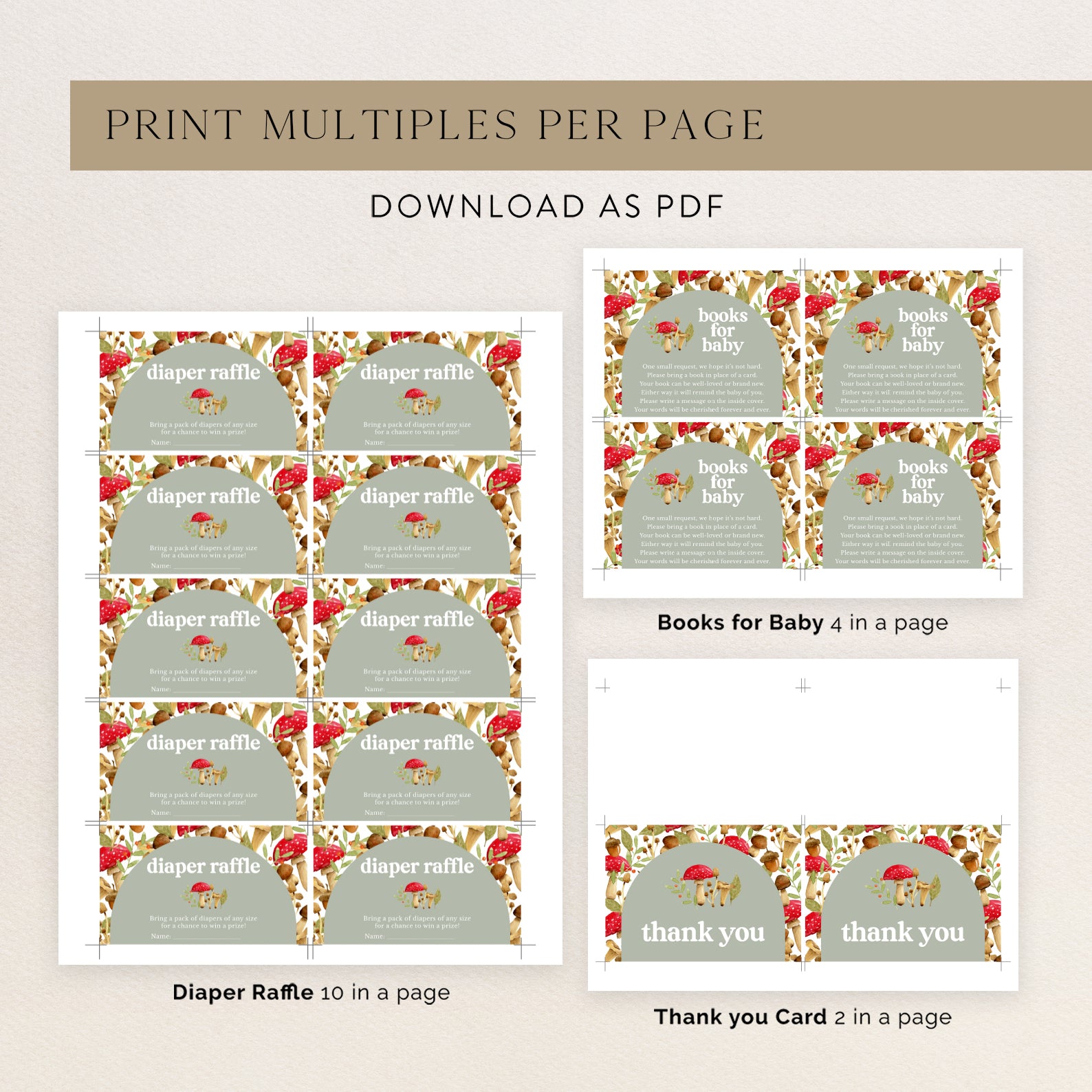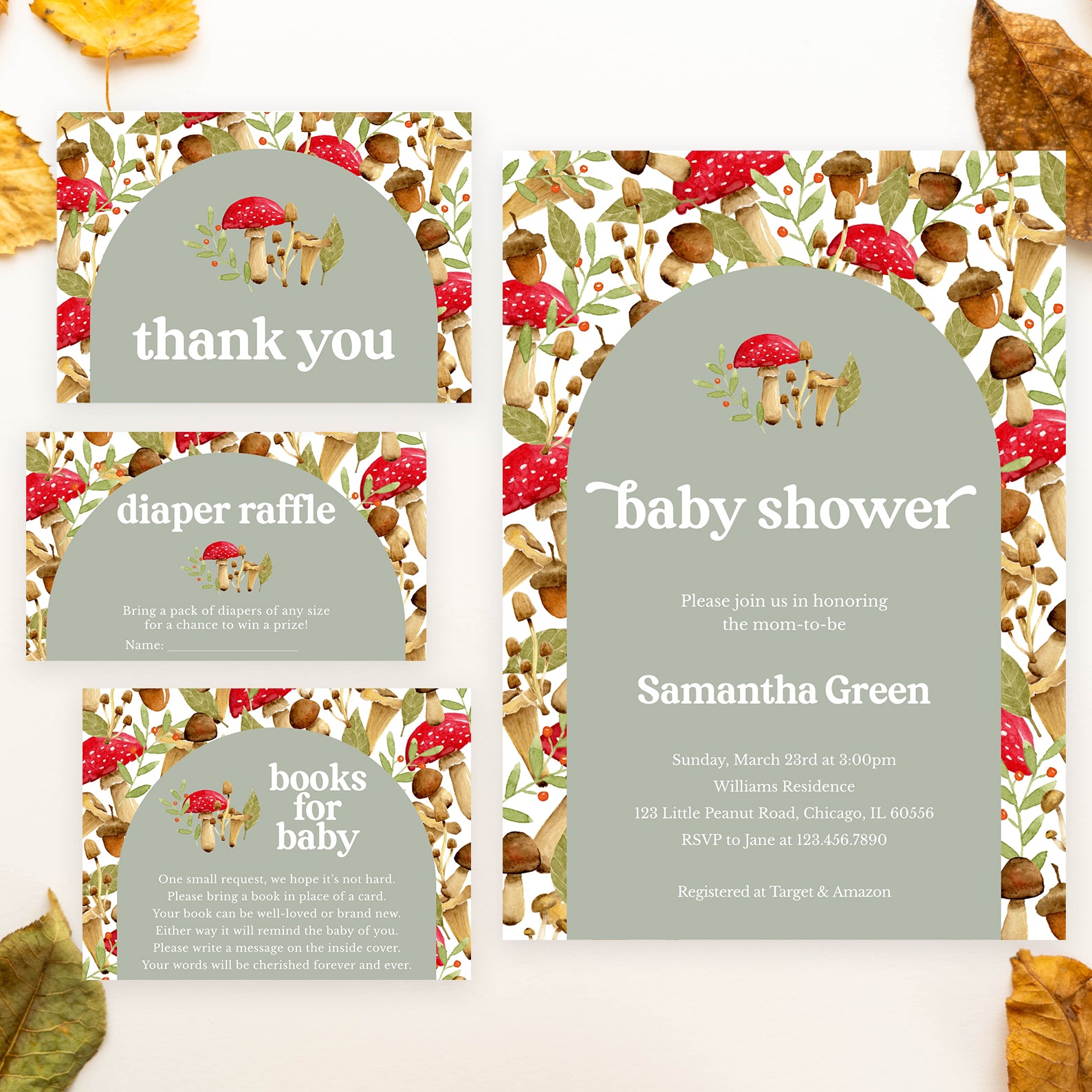 Welcome your little one with our whimsical fall baby shower invitation bundle! Featuring vibrant mushrooms and acorns, this set includes an invitation, mobile invite, diaper raffle, books for baby card, and thank you card. Easy to customize, it perfectly captures autumn's charm and sets a cozy tone for your celebration.