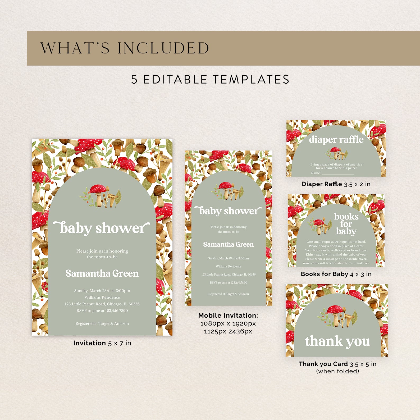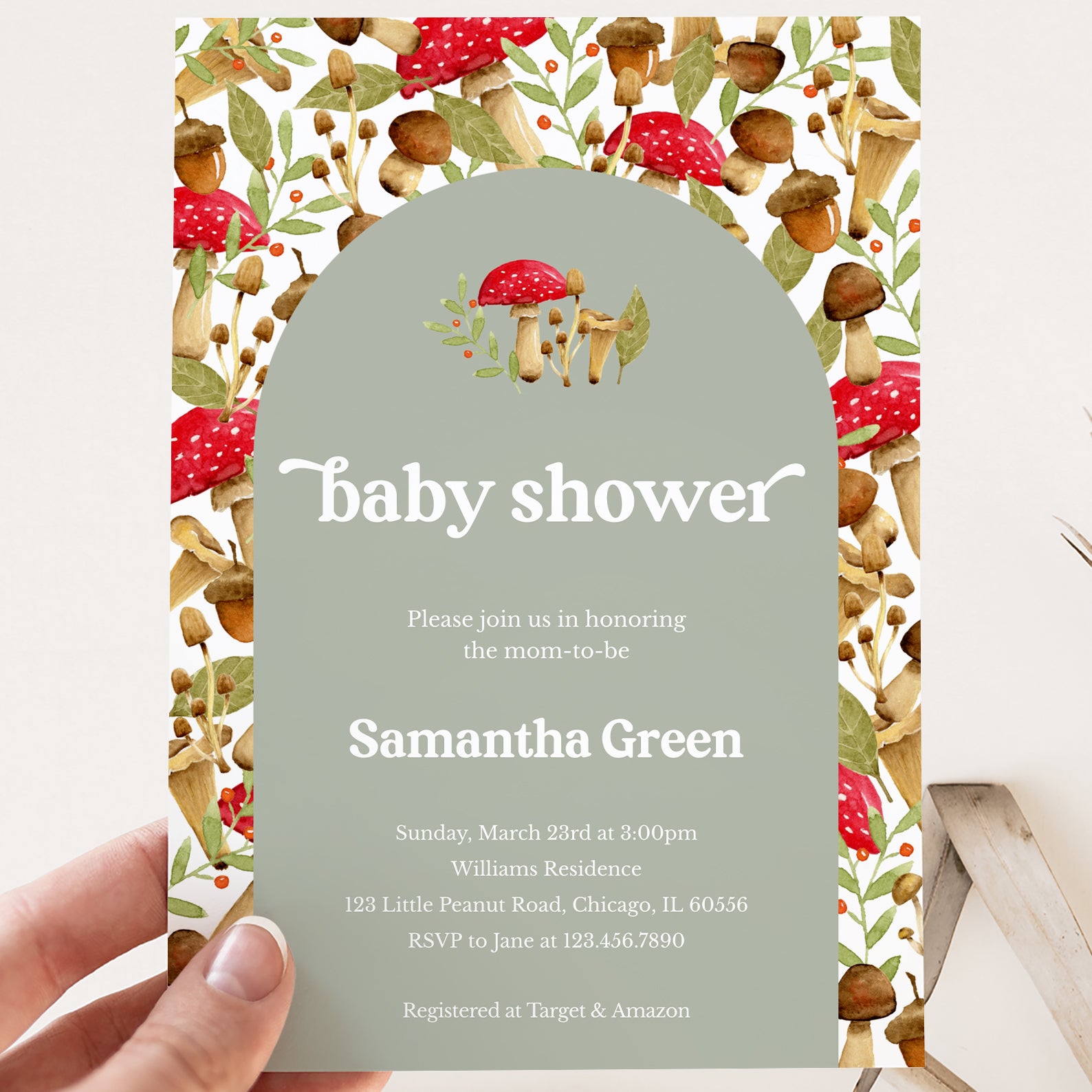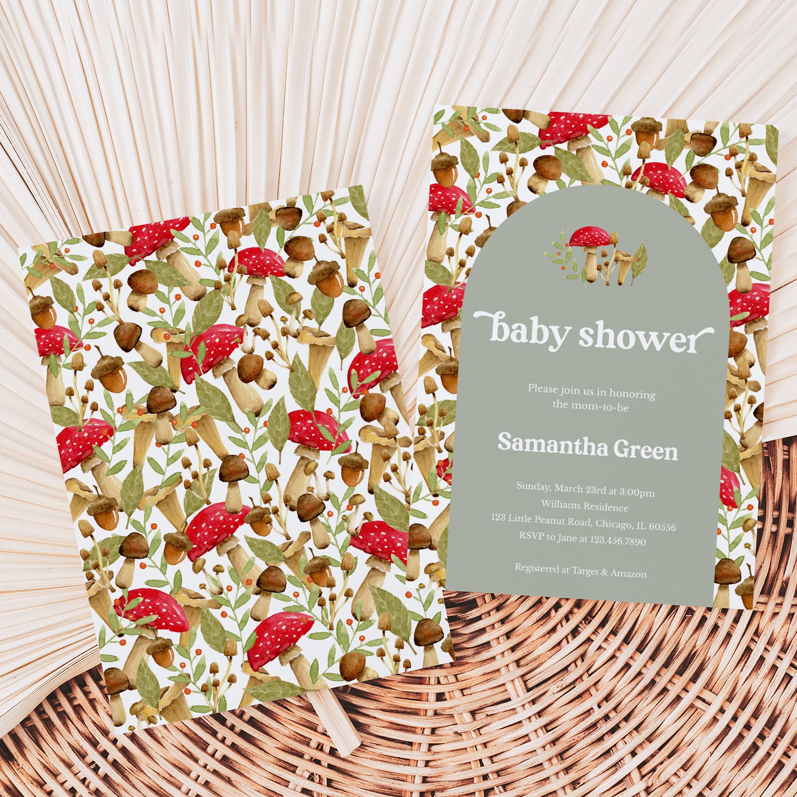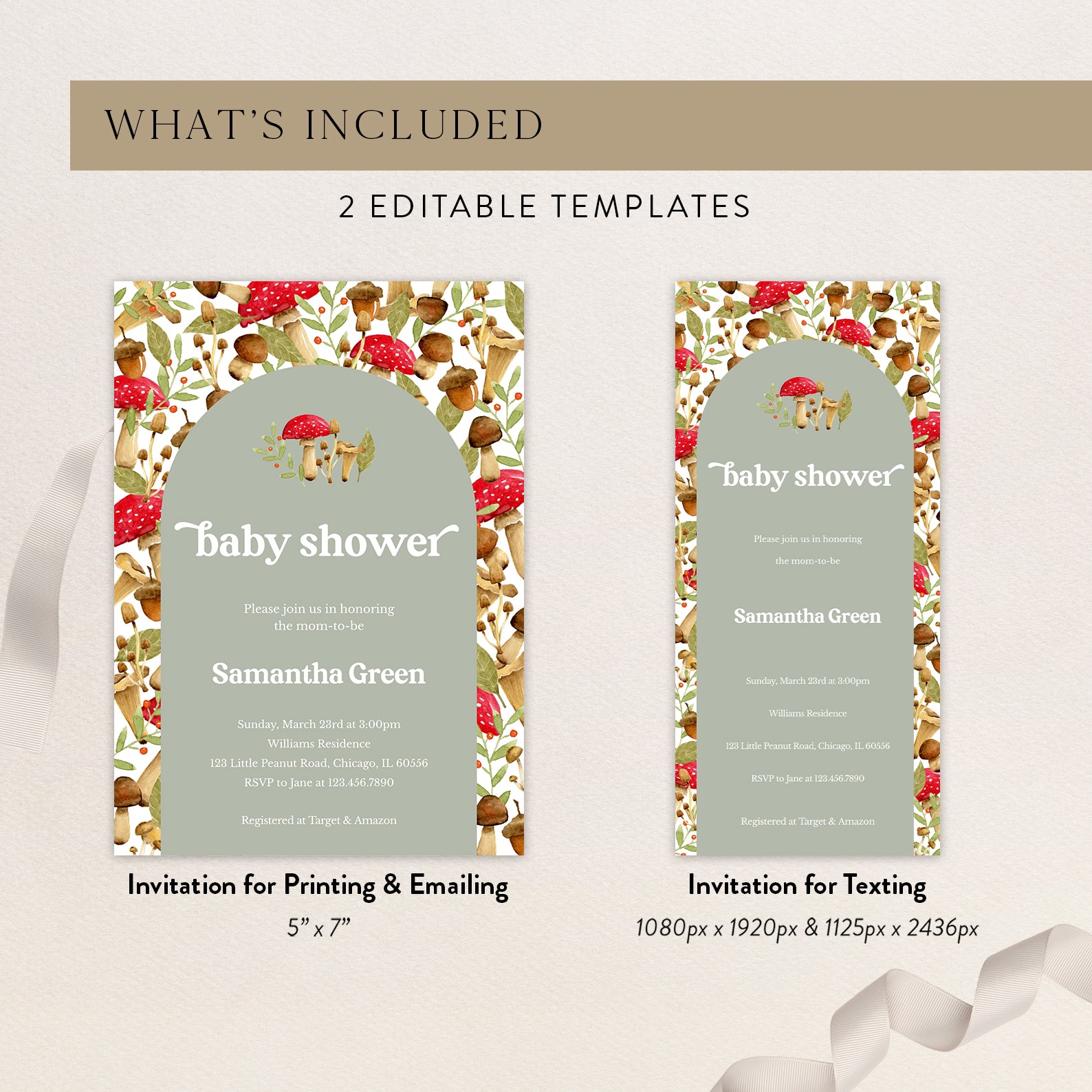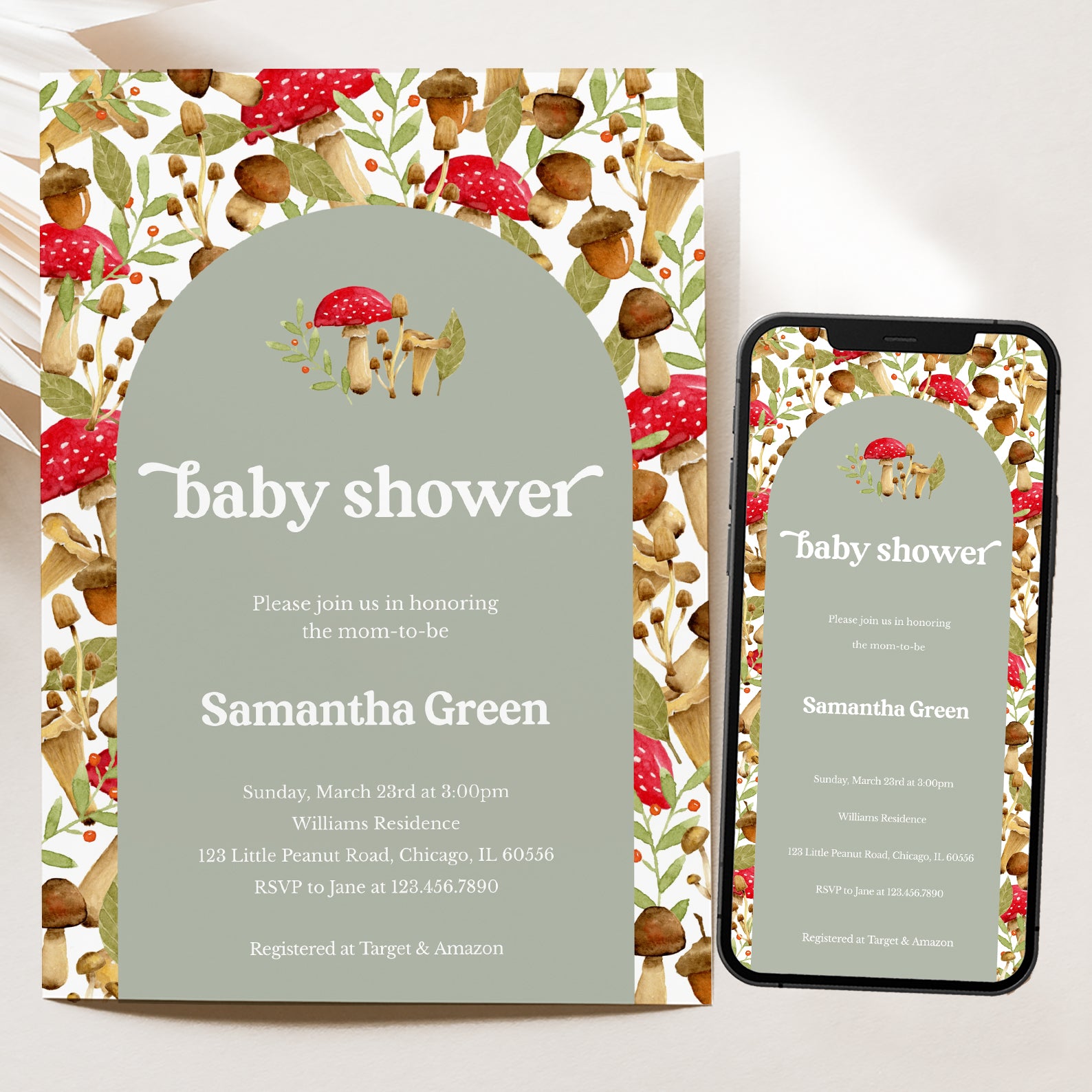 - Purchase this Mushrooms & Acorns Fall Baby Shower Digital Invite Bundle template