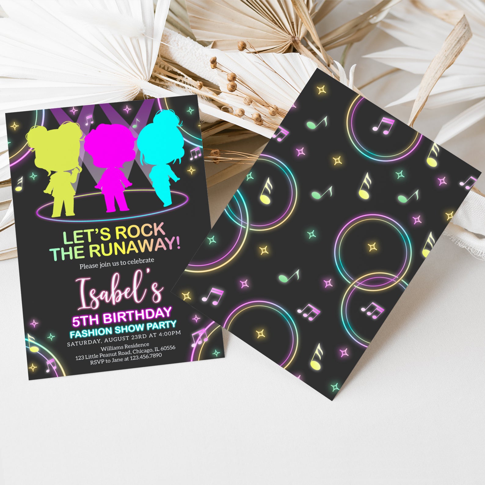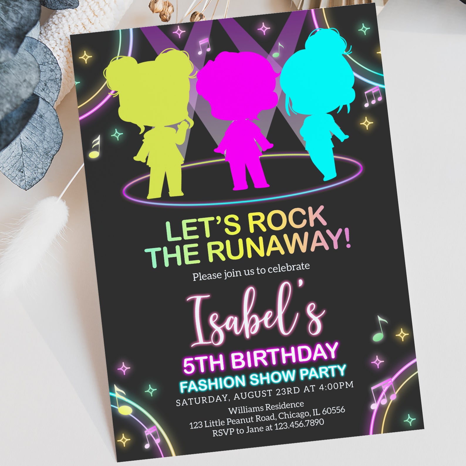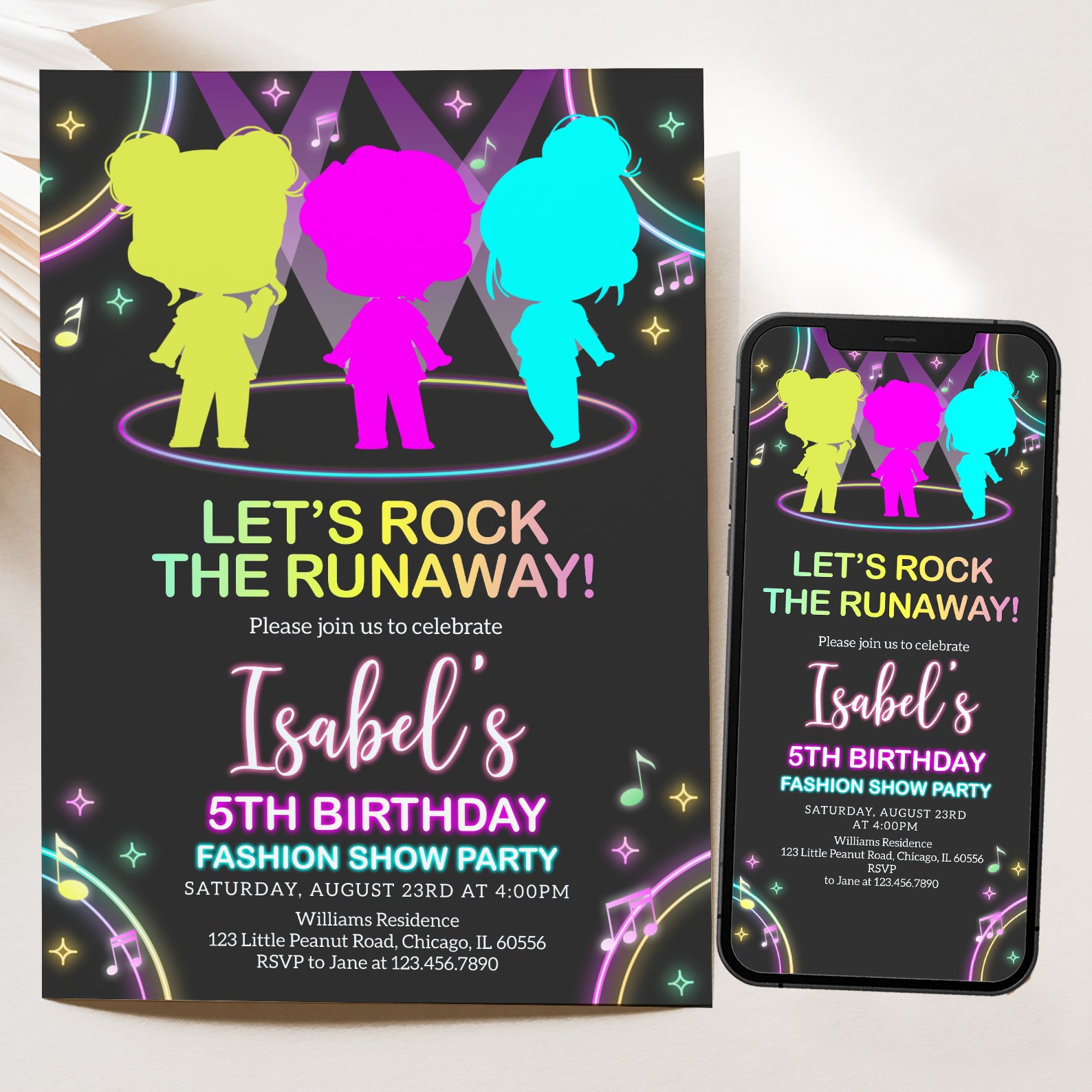 Get ready to strut your stuff with our fabulous "Let's Rock the Runway" digital birthday invitation, perfect for your little fashionista's fifth birthday party! Set against a striking black background, this vibrant design features three stylish girls modeling under dazzling spotlights, surrounded by playful neon lights and musical notes that capture the excitement of a fashion show. With eye-catching neon musical notes and stars adorning the bottom, this invitation sets the stage for a celebration filled with fun, flair, and unforgettable memories. Make your child's special day a runway hit with this stunning invitation!