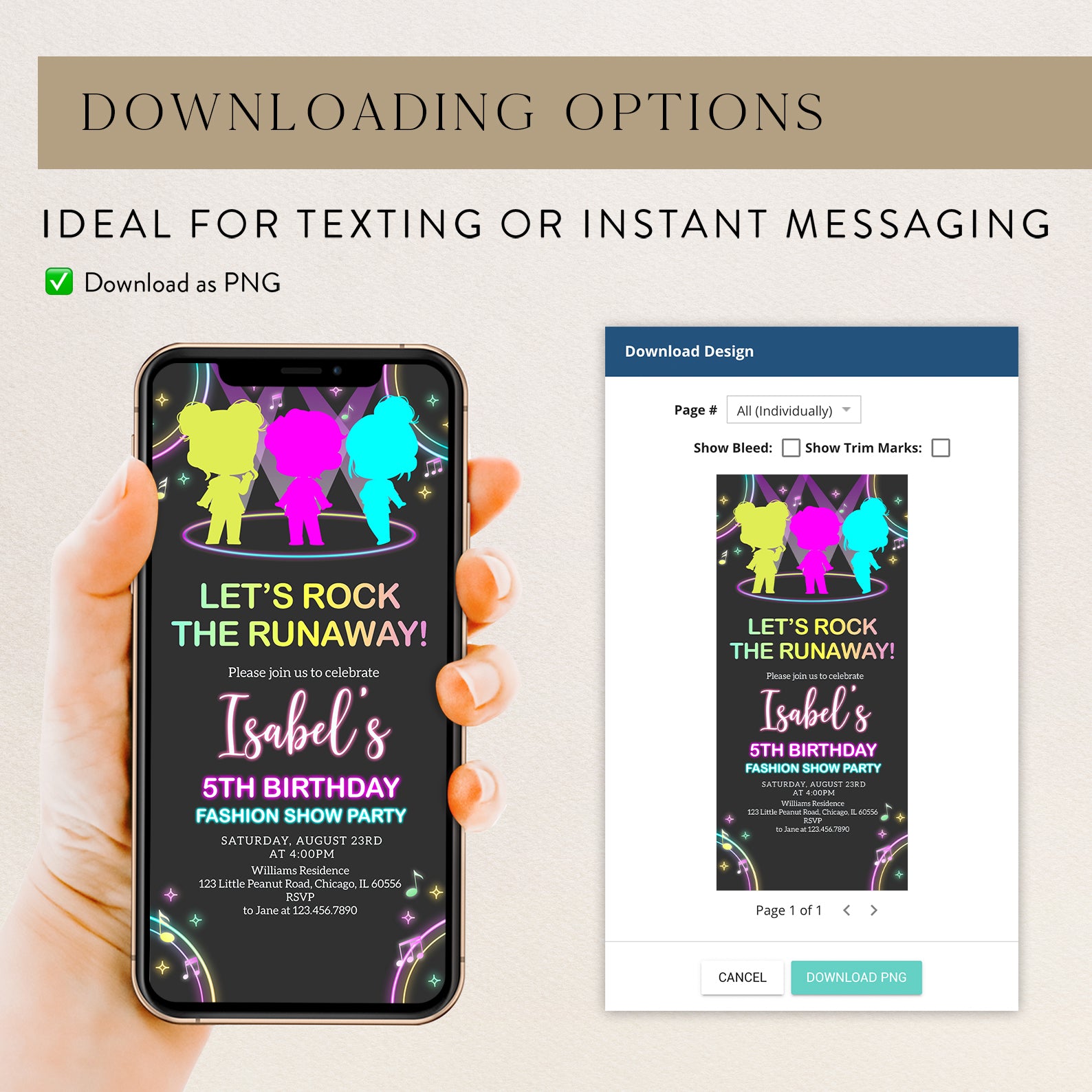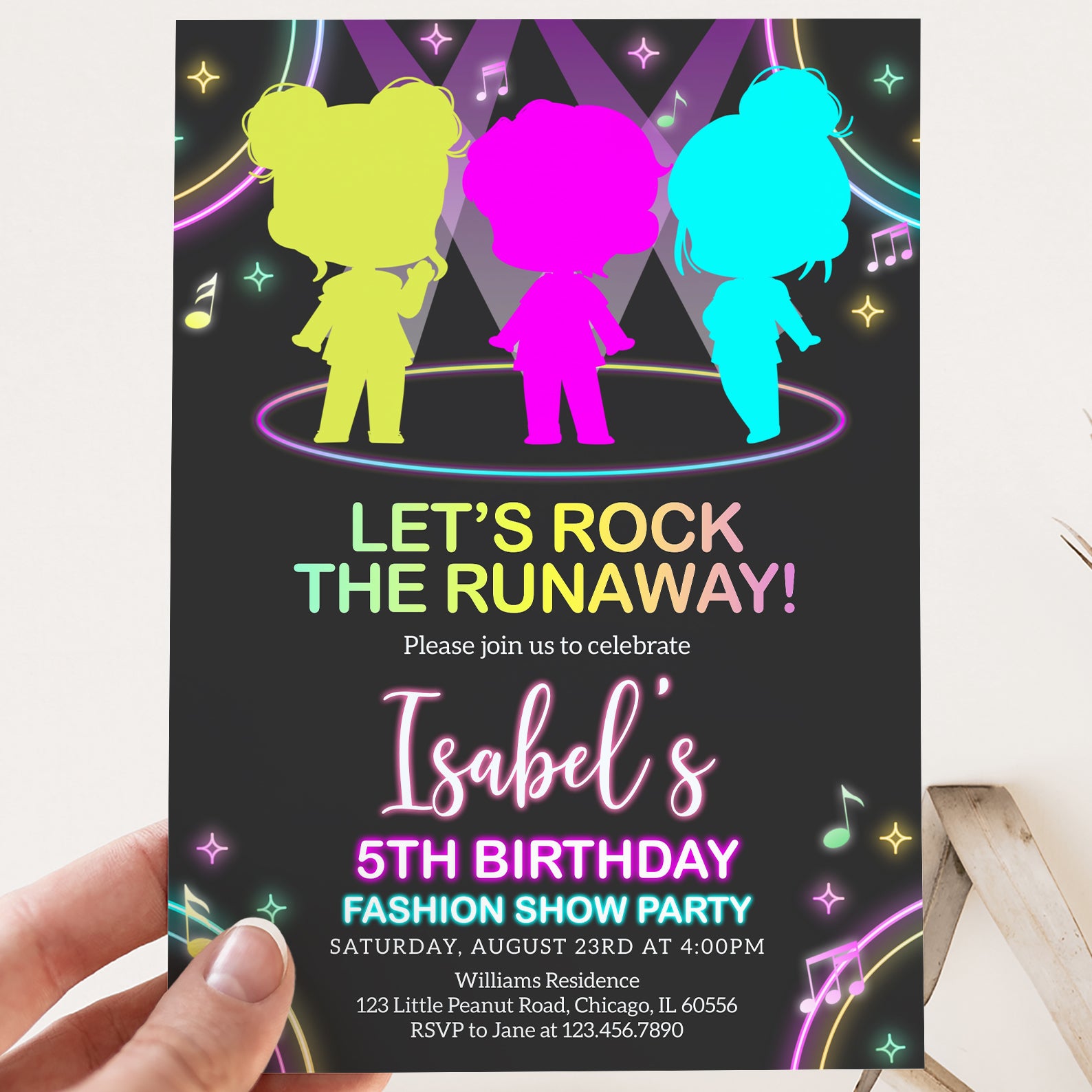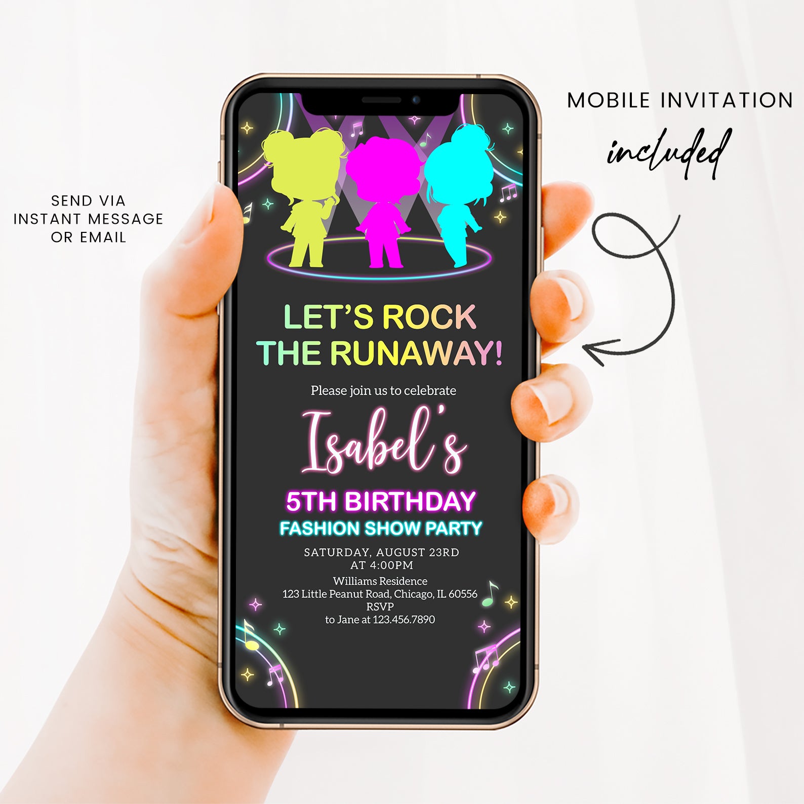 Get ready to strut your stuff with our fabulous "Let's Rock the Runway" digital birthday invitation, perfect for your little fashionista's fifth birthday party! Set against a striking black background, this vibrant design features three stylish girls modeling under dazzling spotlights, surrounded by playful neon lights and musical notes that capture the excitement of a fashion show. With eye-catching neon musical notes and stars adorning the bottom, this invitation sets the stage for a celebration filled with fun, flair, and unforgettable memories. Make your child's special day a runway hit with this stunning invitation!