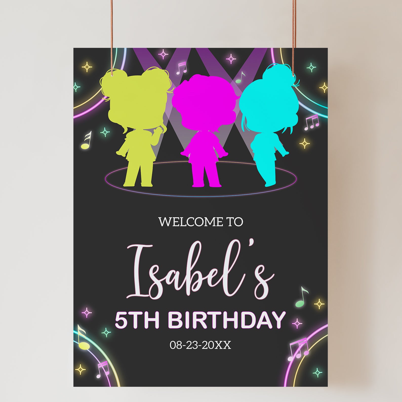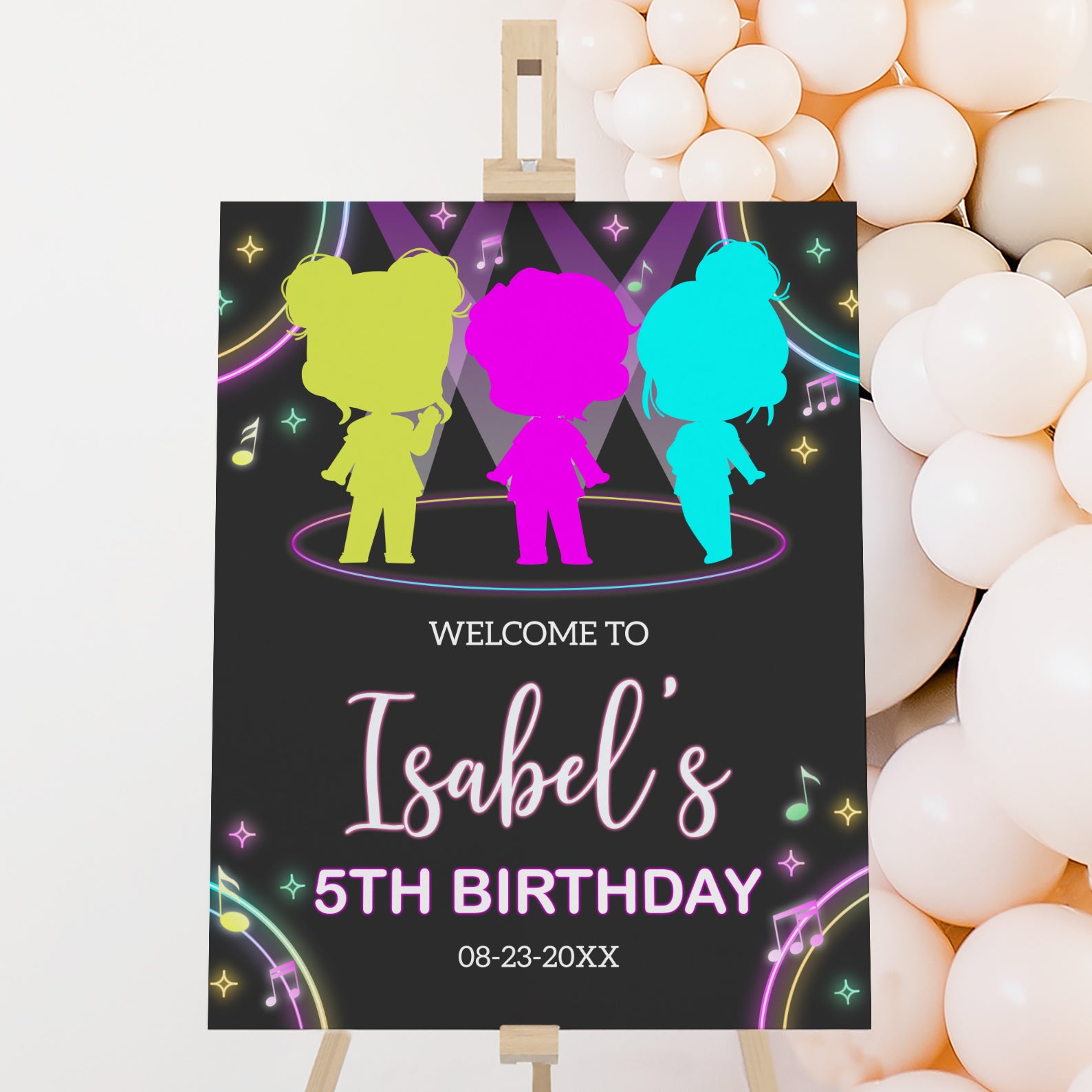 Make a bold entrance with our "Let's Rock the Runway" digital welcome sign – the perfect way to kick off your little fashionista's 5th birthday celebration! Designed with a sleek black backdrop, this stylish sign features three fabulous girls striking poses under glowing spotlights, while neon lights, musical notes, and stars add a playful, high-energy vibe. Whether displayed at the party entrance or dessert table, this sign sets the scene for a fashion-forward celebration full of fun and flair. Personalize it easily to give guests a warm, on-theme greeting as they step into a runway-inspired birthday bash!