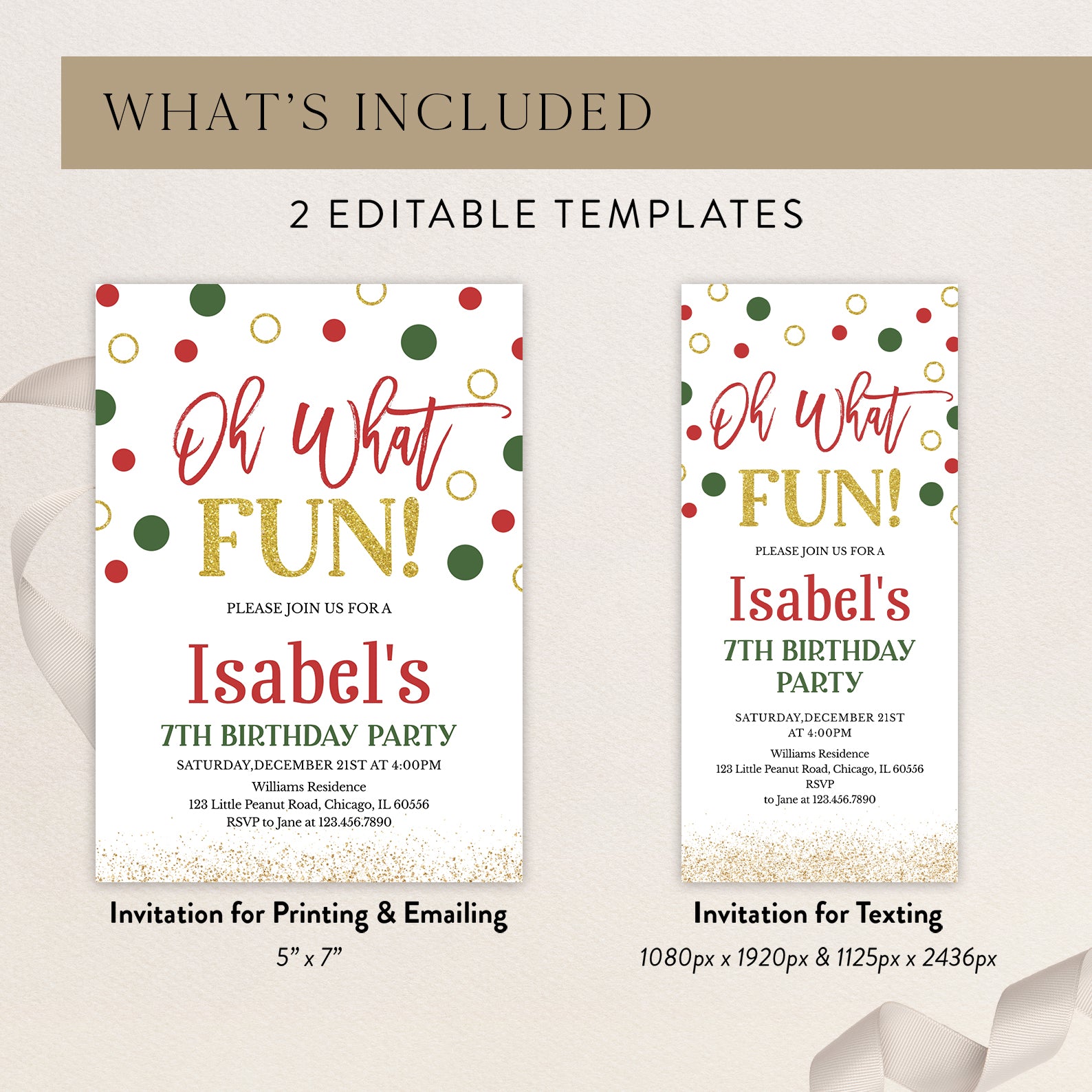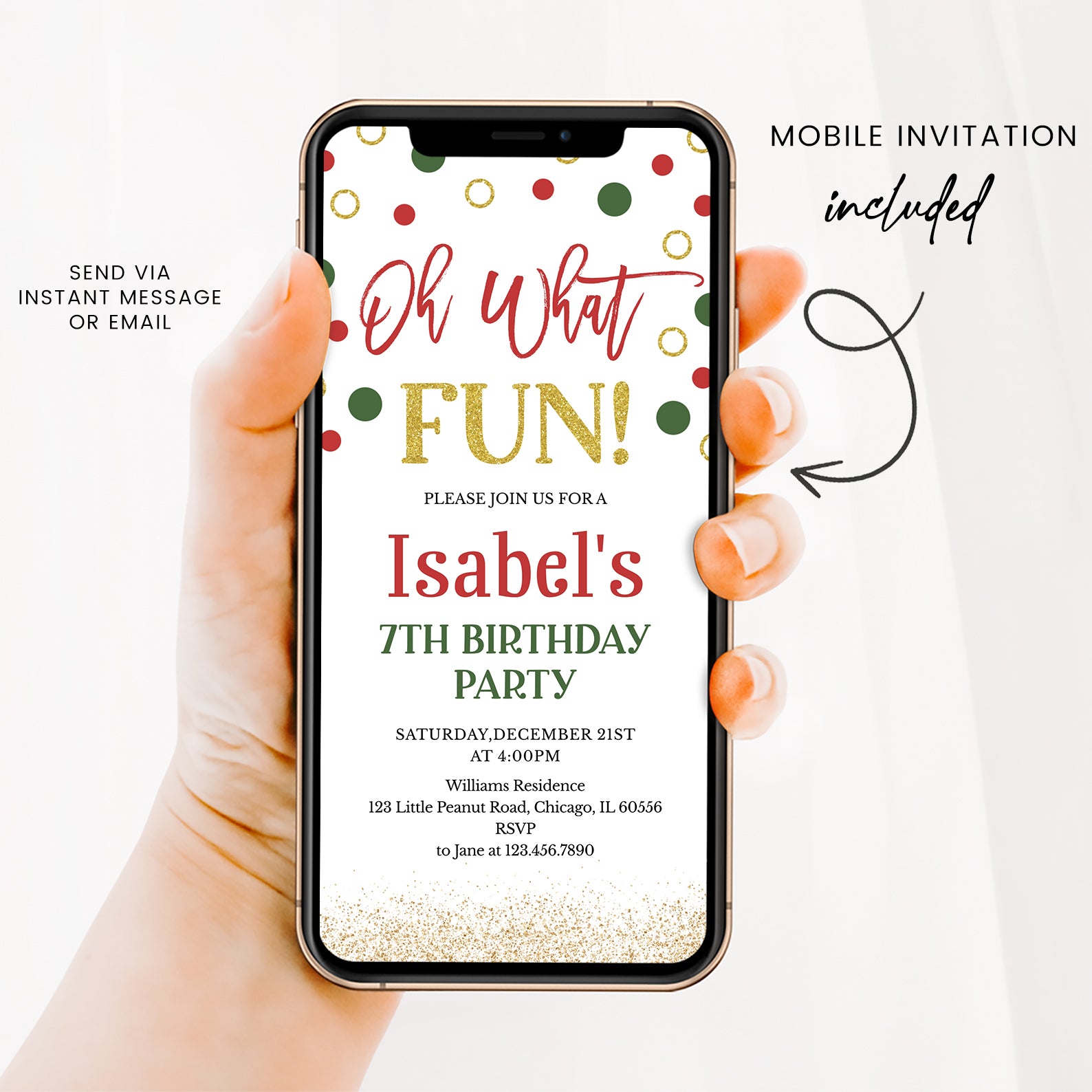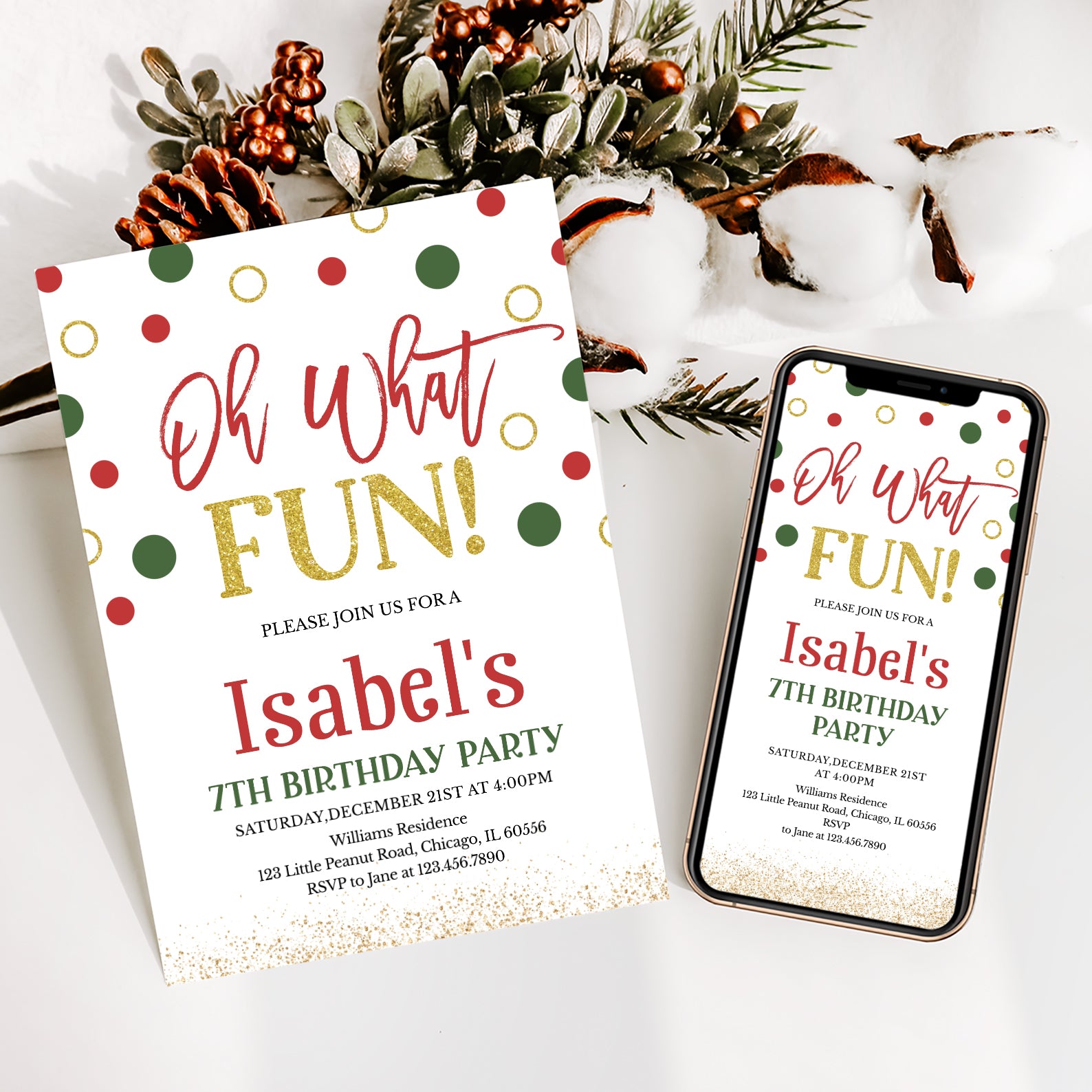 Celebrate your little one's 7th birthday in style with our enchanting "Oh What Fun!" winter birthday digital invitation. Adorned with festive green, red, and gold circles at the top, this invitation sets a joyful tone for your celebration, while elegant gold accents at the bottom add a touch of sophistication. Perfect for winter festivities, this digital invite is easy to customize and share, making it a hassle-free way to gather friends and family for a memorable birthday bash. Get ready to spread the cheer and make this birthday unforgettable!
