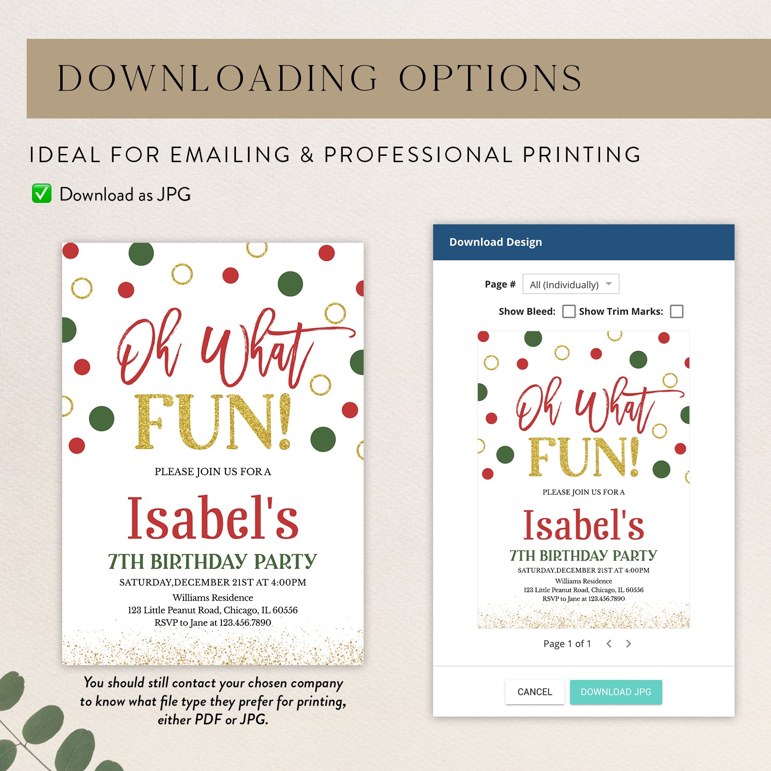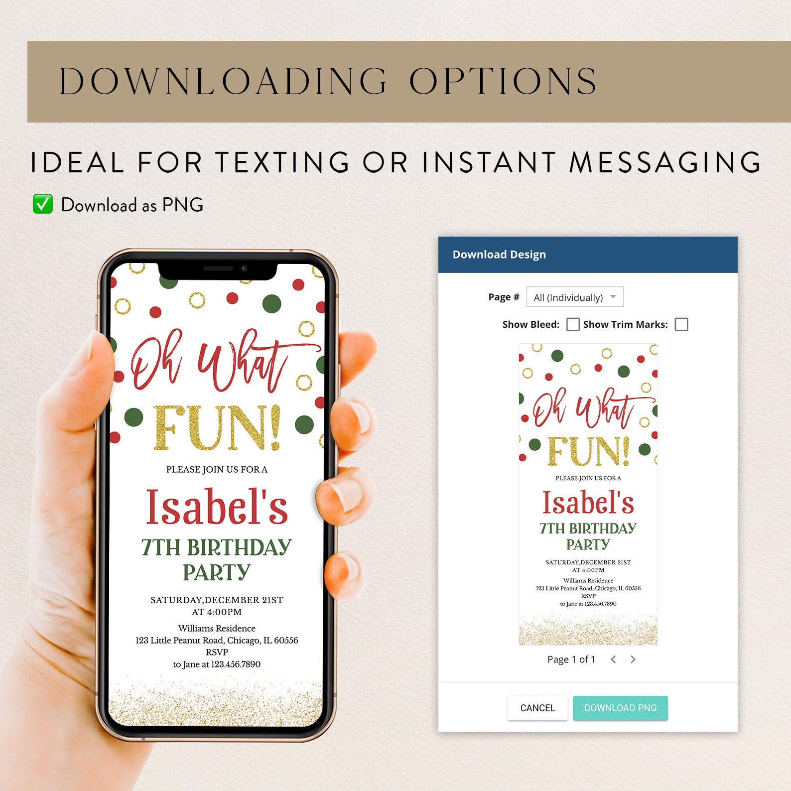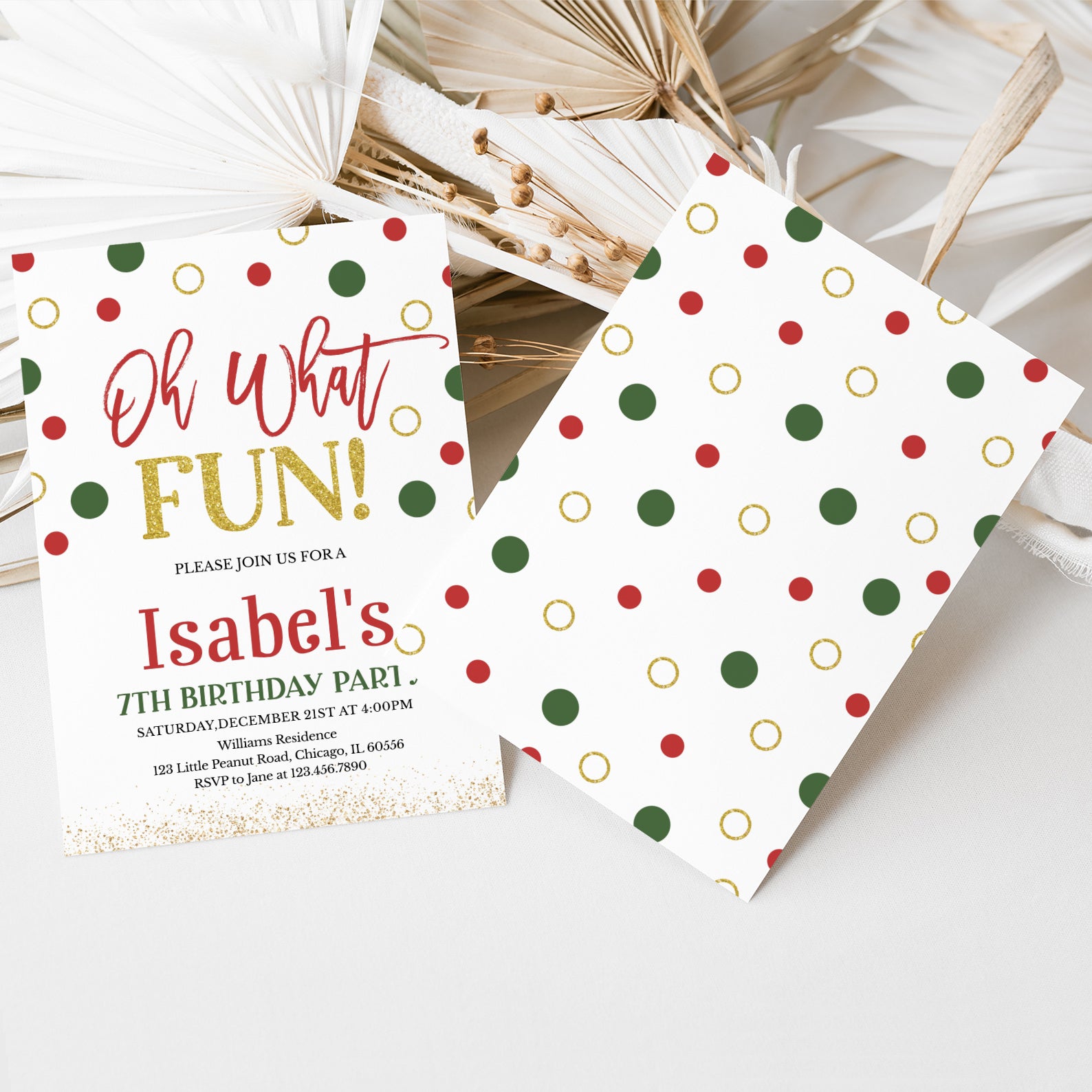 Celebrate your little one's 7th birthday in style with our enchanting "Oh What Fun!" winter birthday digital invitation. Adorned with festive green, red, and gold circles at the top, this invitation sets a joyful tone for your celebration, while elegant gold accents at the bottom add a touch of sophistication. Perfect for winter festivities, this digital invite is easy to customize and share, making it a hassle-free way to gather friends and family for a memorable birthday bash. Get ready to spread the cheer and make this birthday unforgettable!