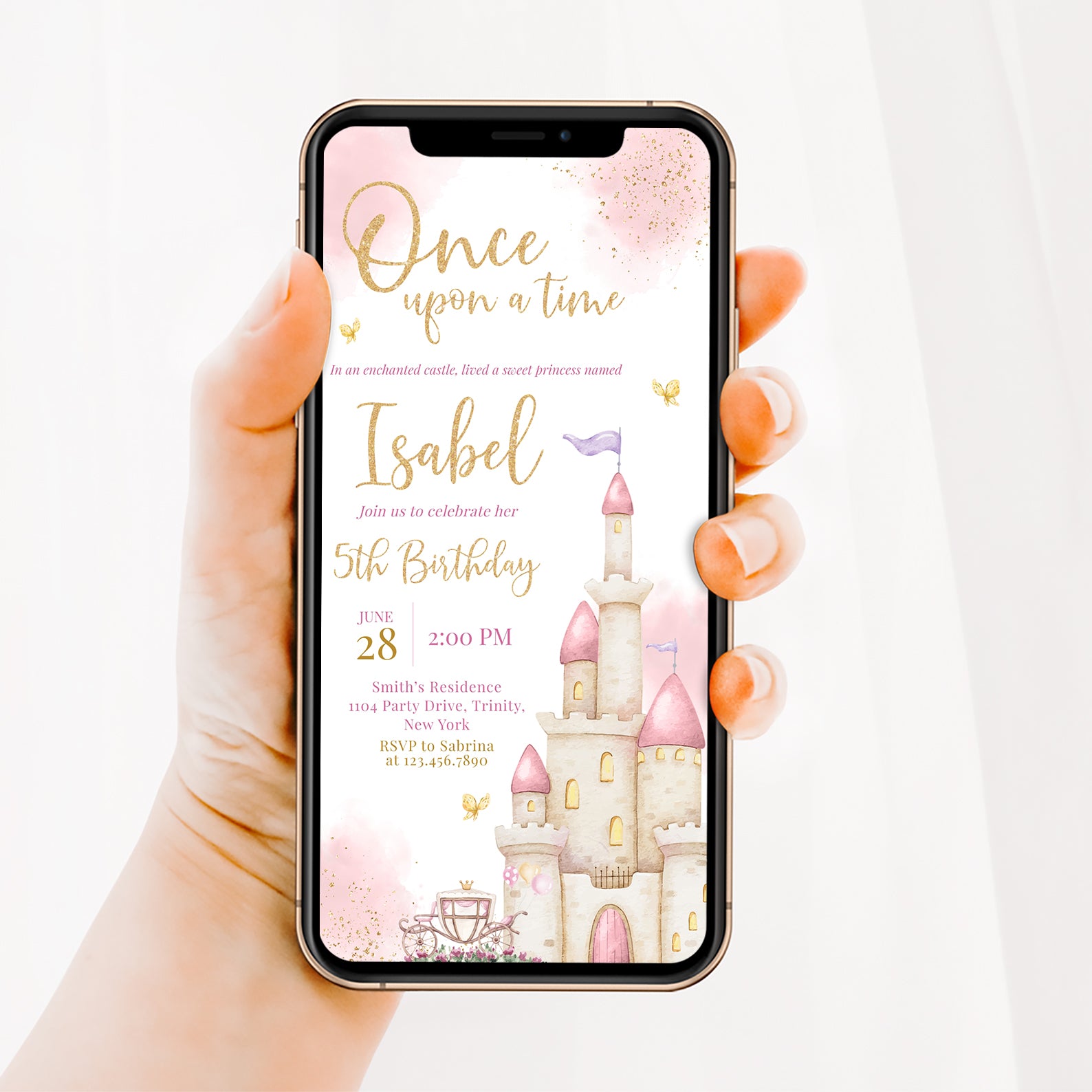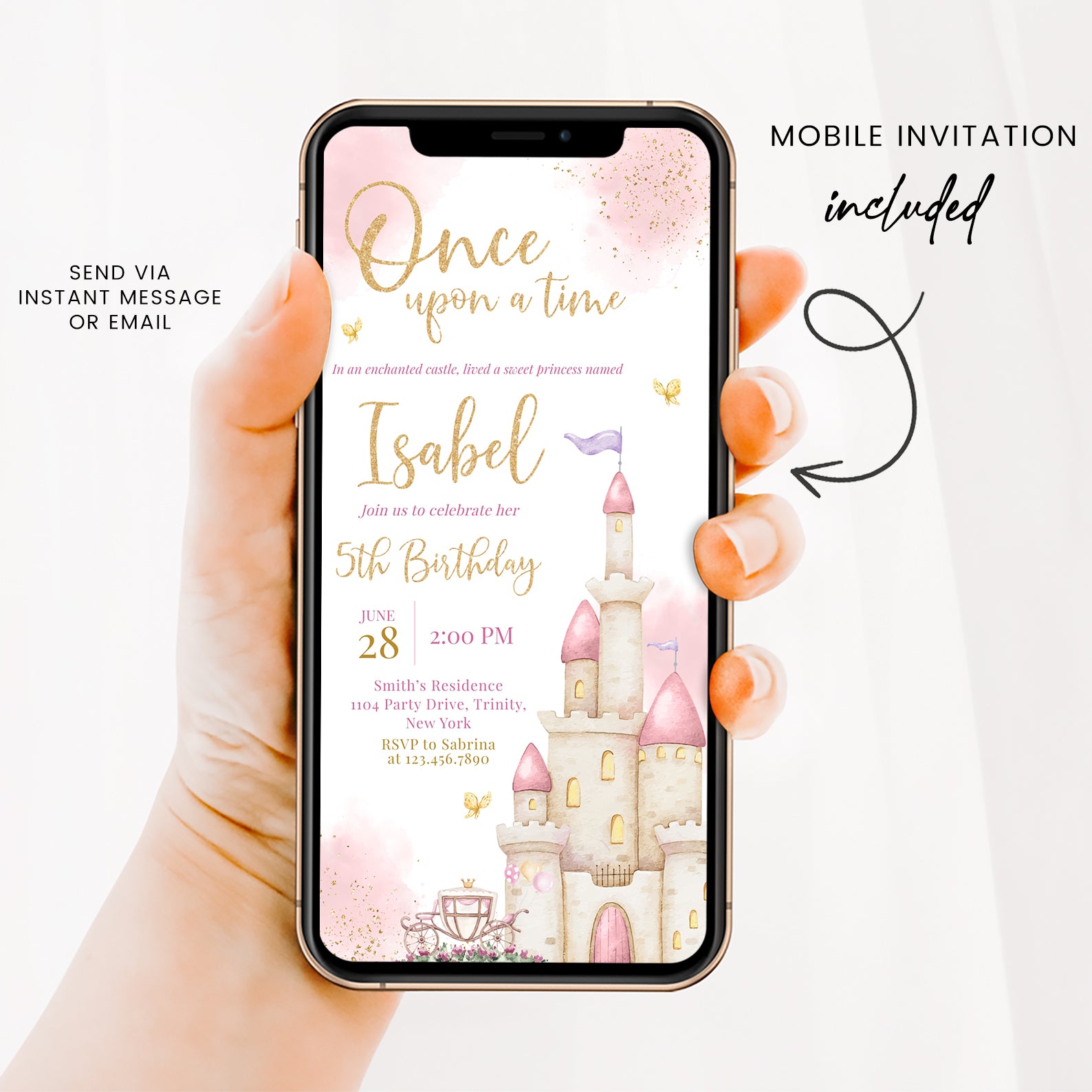 Transform your little one's 5th birthday celebration into a fairytale with our enchanting digital invitation! Featuring a whimsical pink and gold theme, this invitation showcases a stunning pink castle, a charming carriage, and delicate flying gold butterflies that will captivate your guests. Perfectly designed with elegant gold accents, it sets the tone for a magical party filled with joy and wonder. Easy to customize and send, this invitation is the perfect way to invite friends and family to join in the celebration of your child's special day!