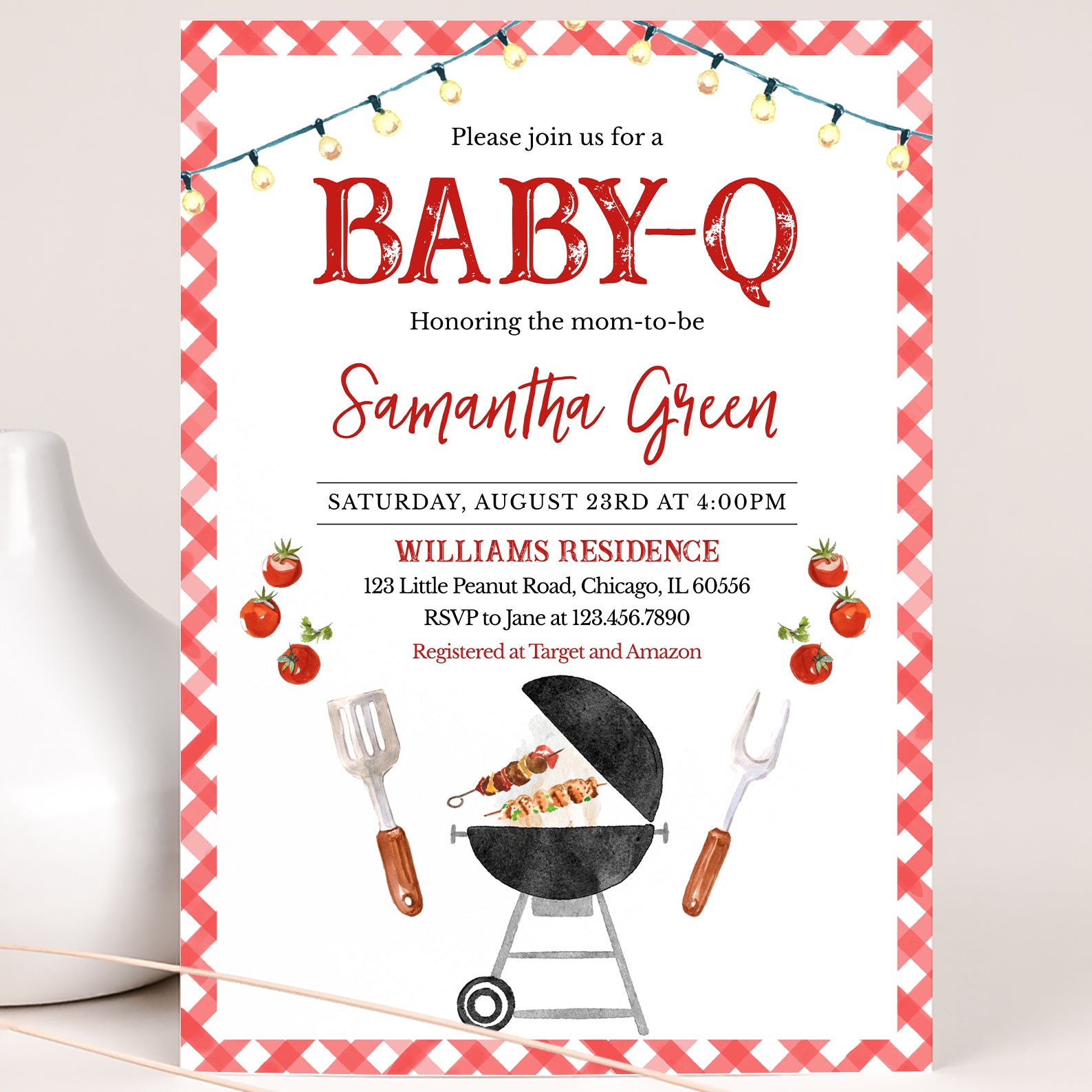 Celebrate your little one's arrival with our vibrant summer baby shower digital invitation, perfect for a red-themed baby-Q! Featuring a charming red picnic pattern border, this invitation sets the scene with a whimsical hanging light bulb at the top. At the bottom, a delightful barbecue grill sizzles with mouthwatering treats, while playful spatula and fork illustrations, accompanied by fresh tomatoes, add a fun touch. Invite your guests to join in the festivities with this eye-catching design that captures the spirit of summer and celebration!