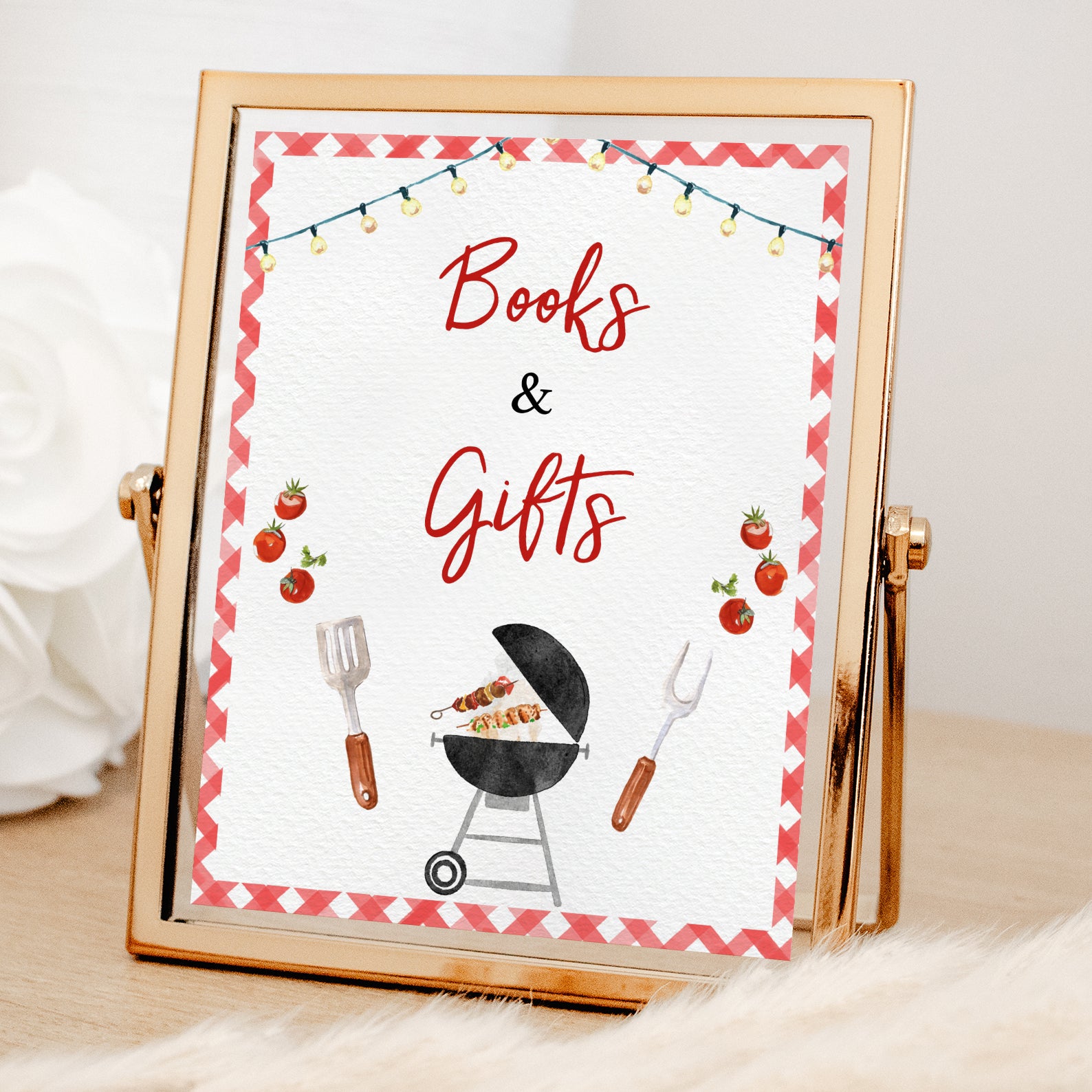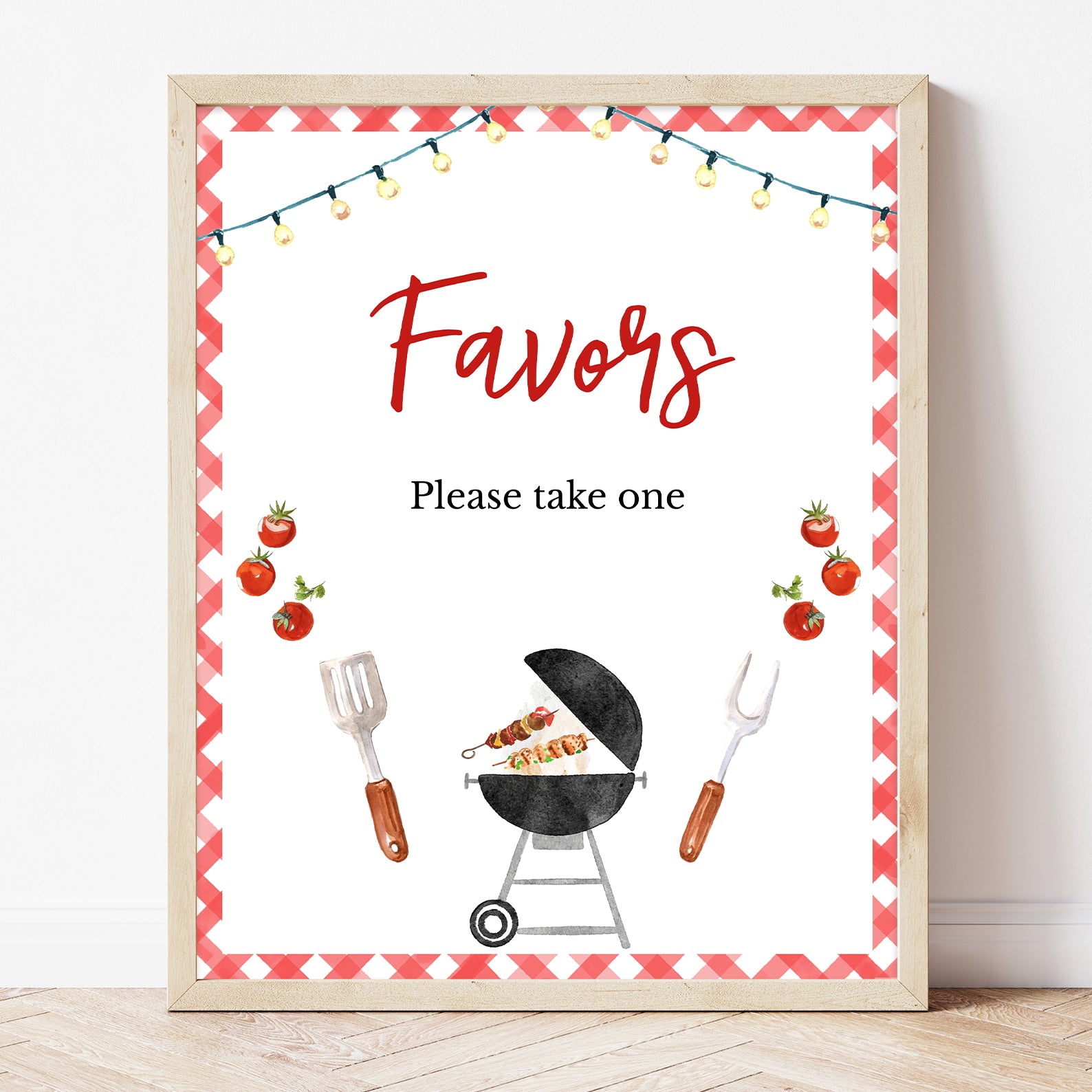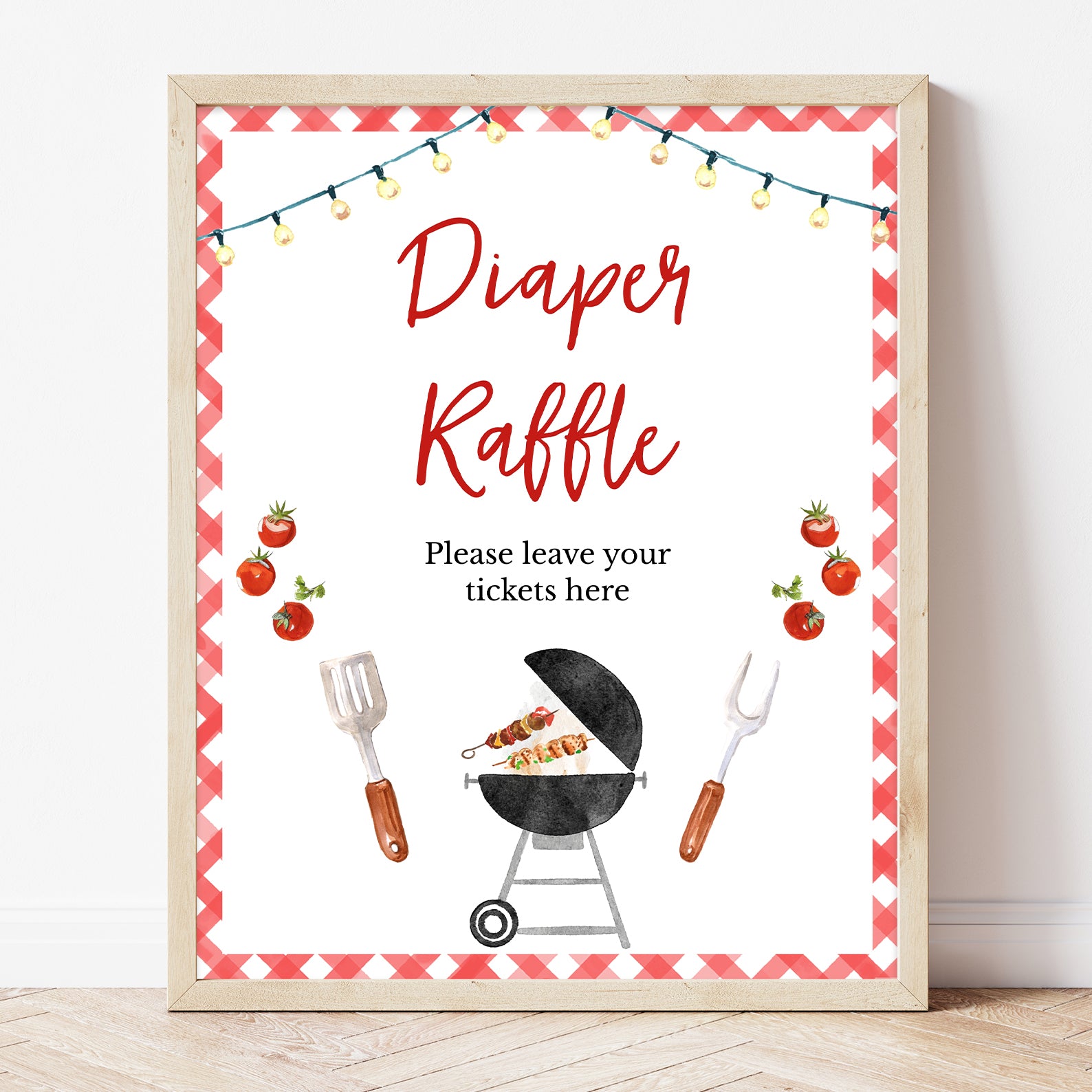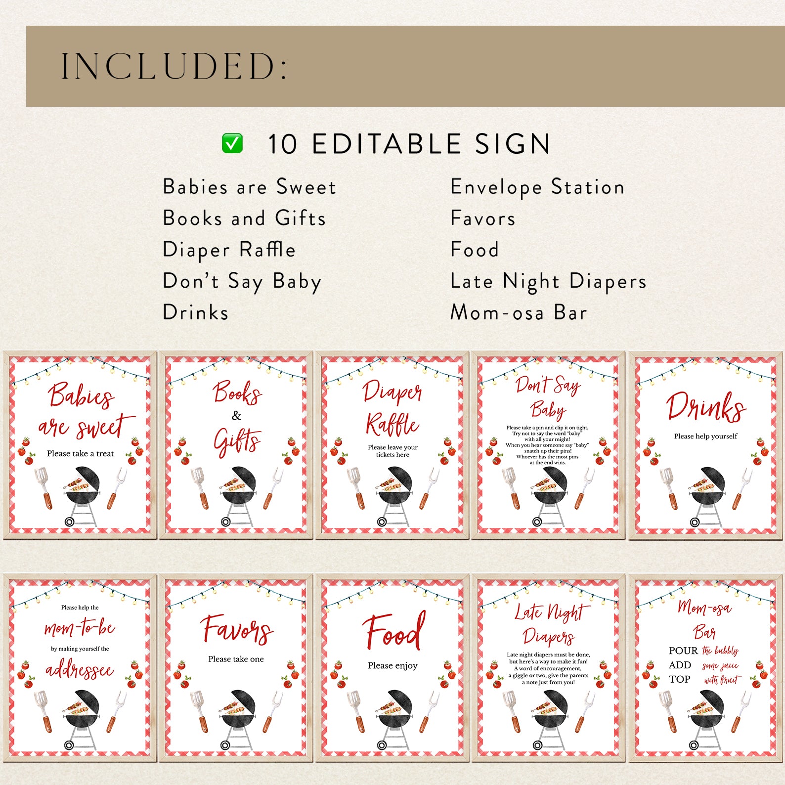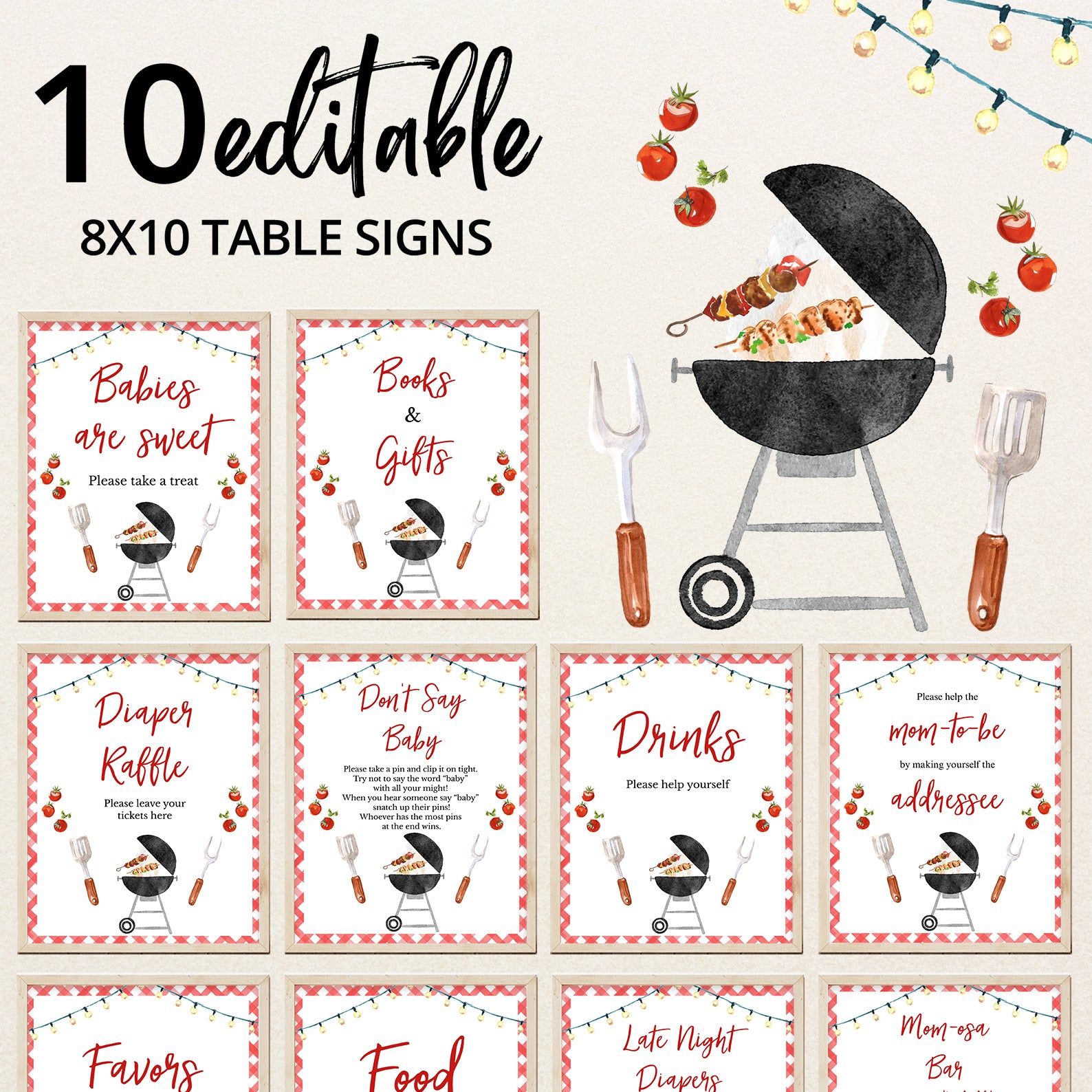 Complete your Baby-Q baby shower with this set of 10 editable table signs! Designed with a classic red picnic pattern border, each sign adds a festive touch to your celebration. Featuring charming BBQ-inspired details like a sizzling grill, spatula and fork illustrations, and fresh tomatoes, these signs guide guests to key stations, including Babies Are Sweet, Books & Gifts, Diaper Raffle, Don't Say Baby, Drinks, Envelope Station, Favors, Food, Late Night Diapers, and Mom-osa Bar. A perfect addition to your summer-themed baby shower!
