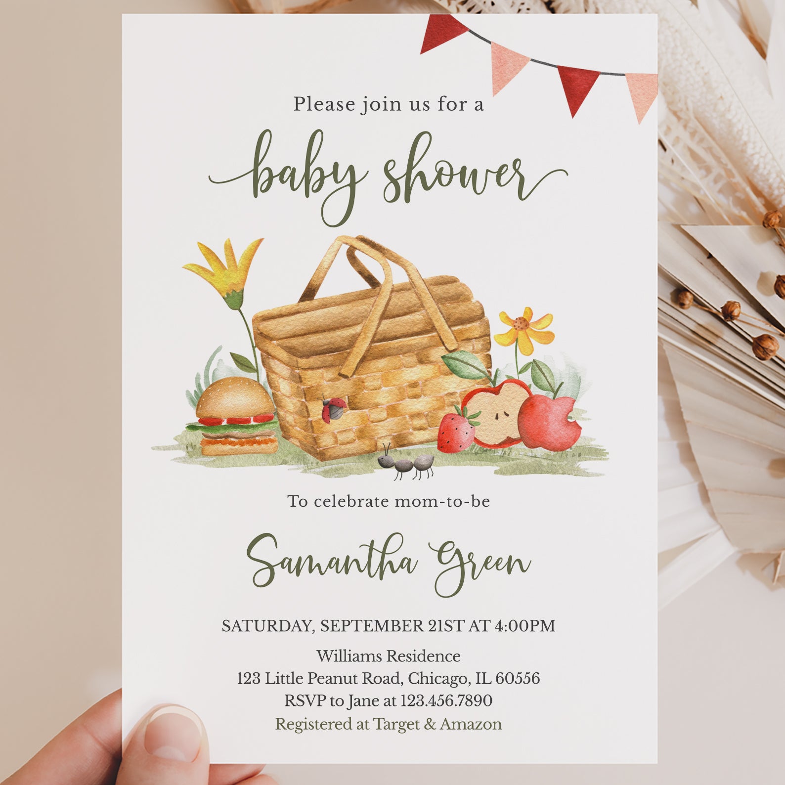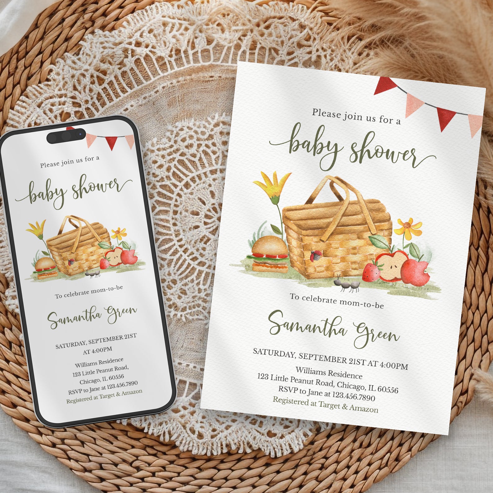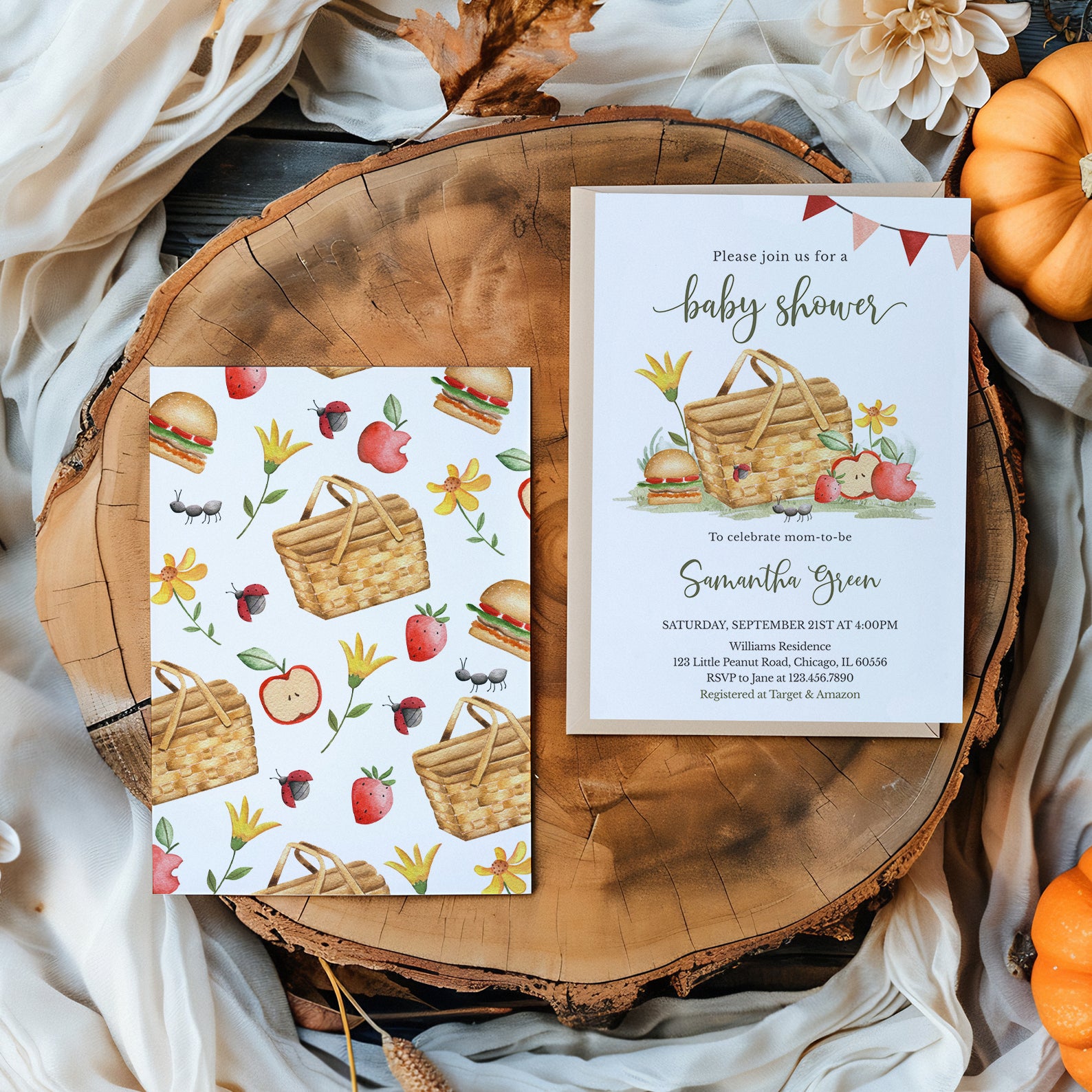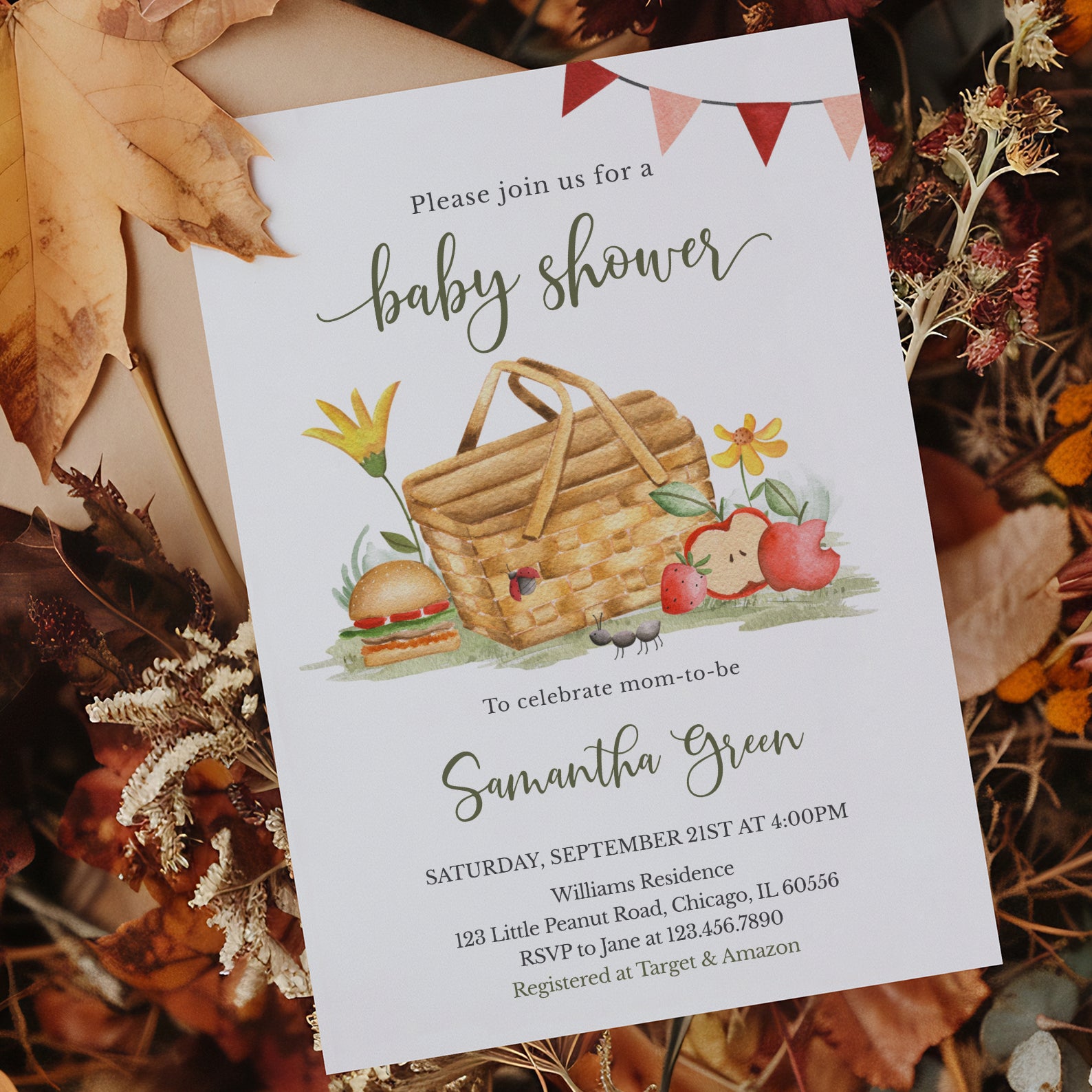 - Purchase this Picnic Fall Baby Shower Invite with Basket, Flowers & Banner template