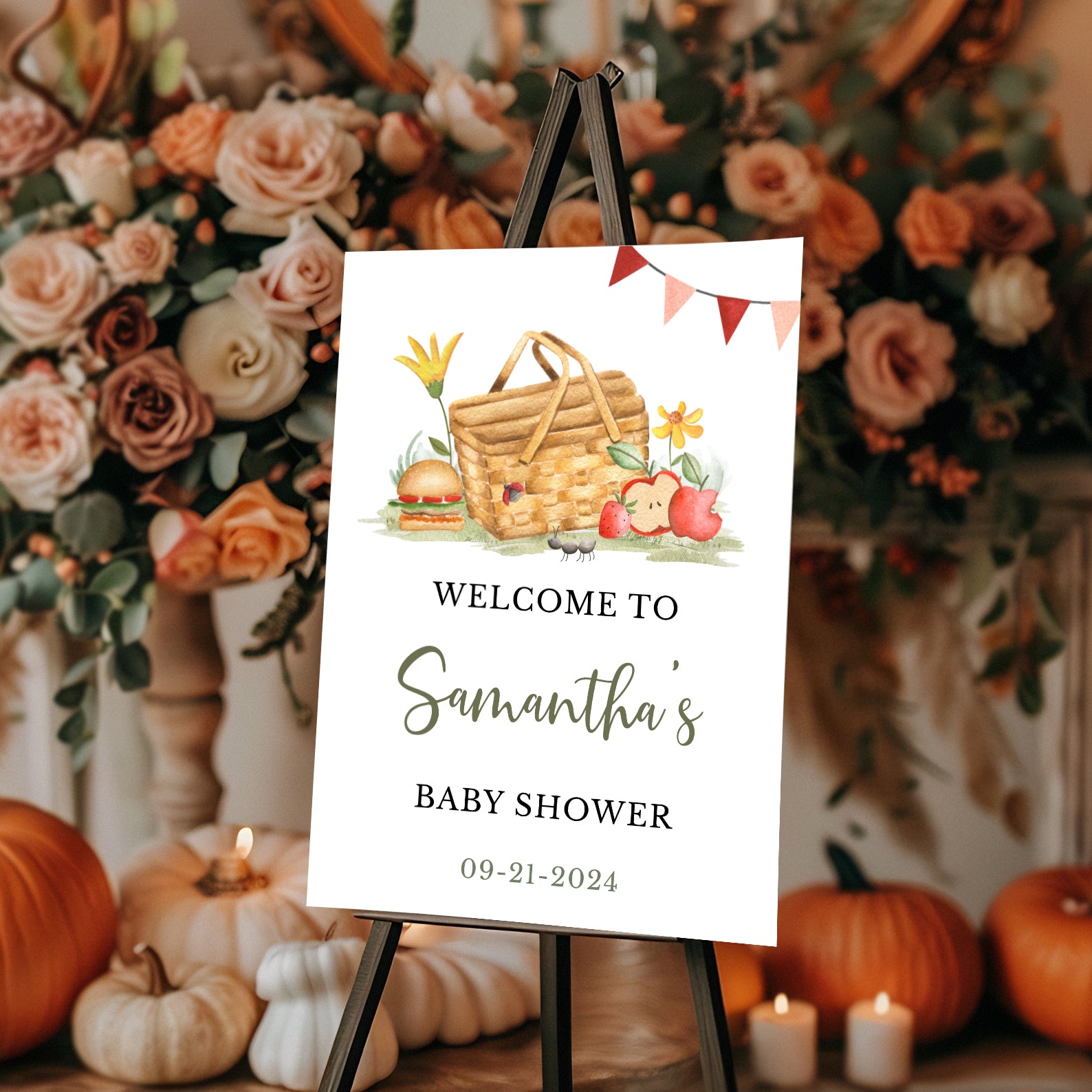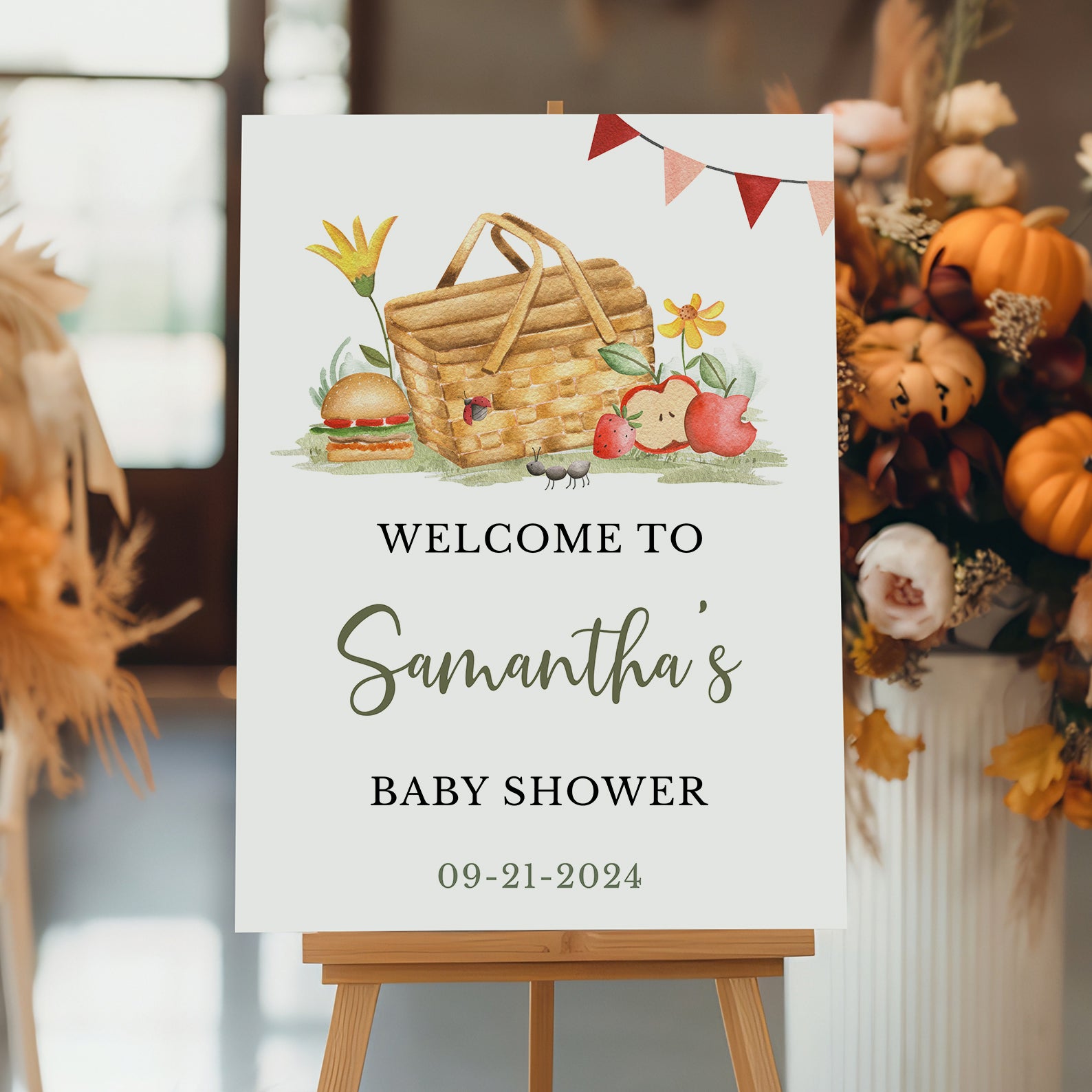 - Purchase this Picnic Fall Baby Shower Welcome Sign with Basket, Flowers & Banner template