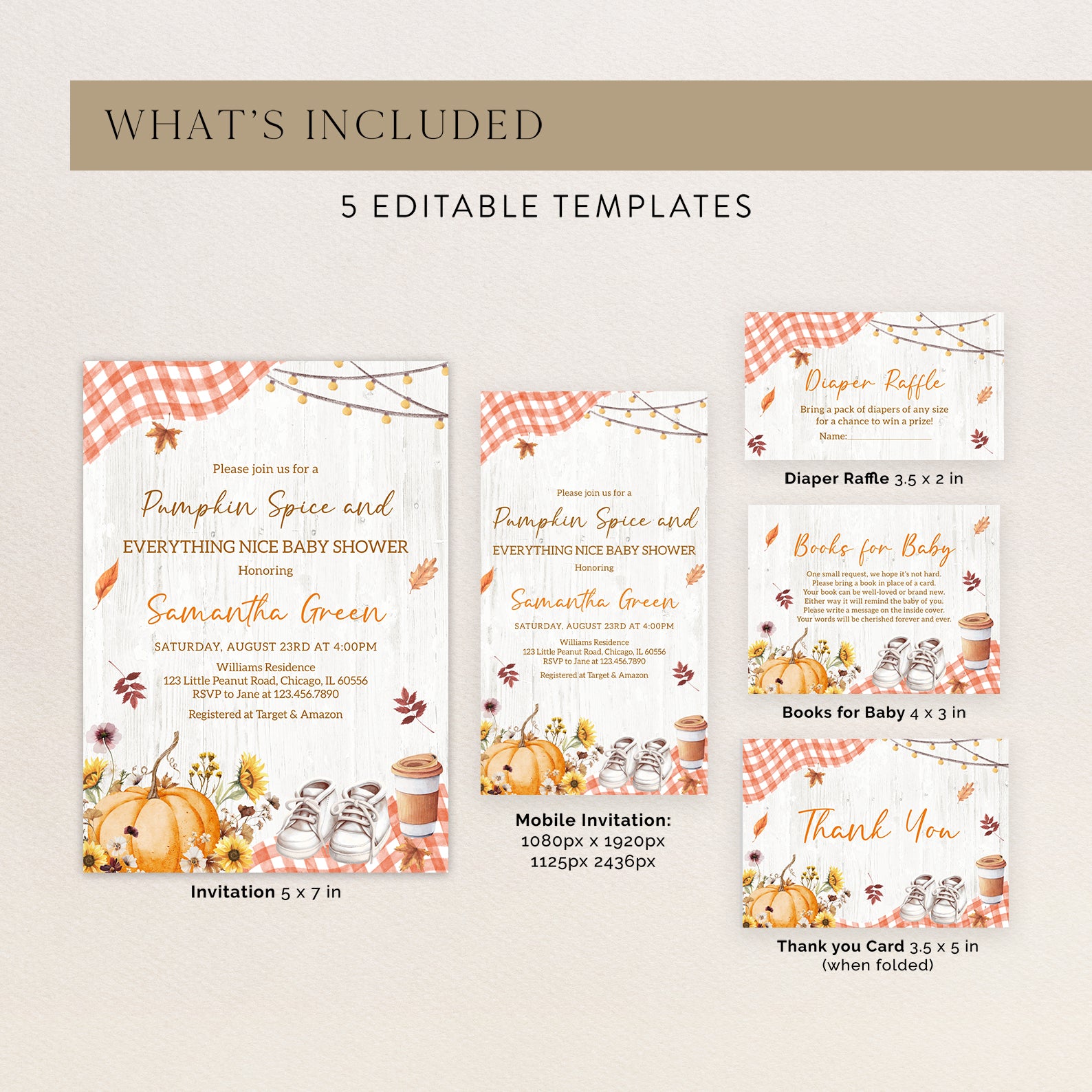 - Purchase this Pumpkin Spice Baby Shower Invite Bundle with Plaid & Pumpkins template