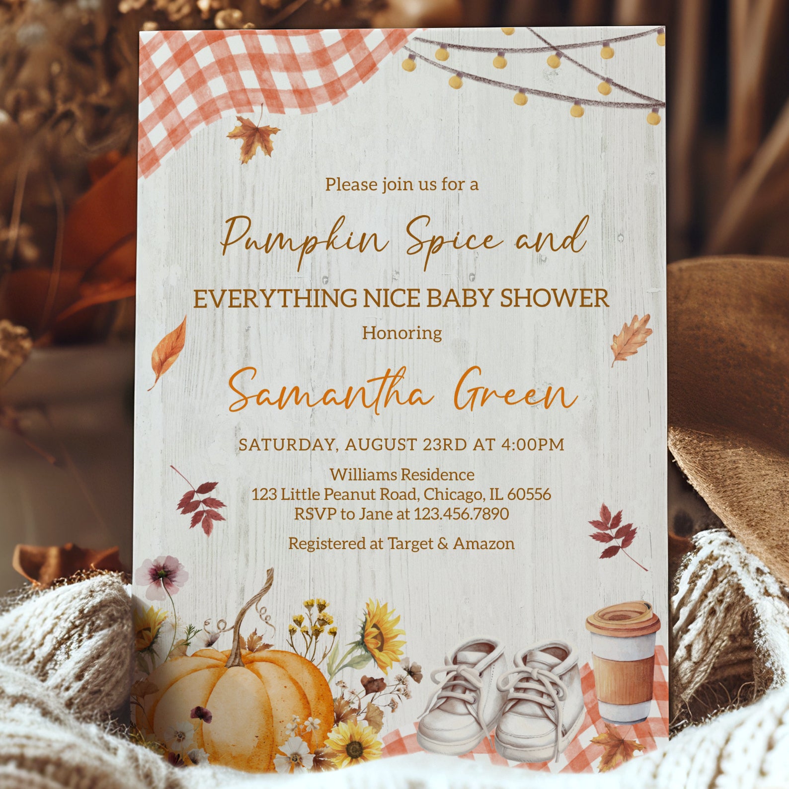 Pumpkin Spice Baby Shower Invite with Plaid & Pumpkins