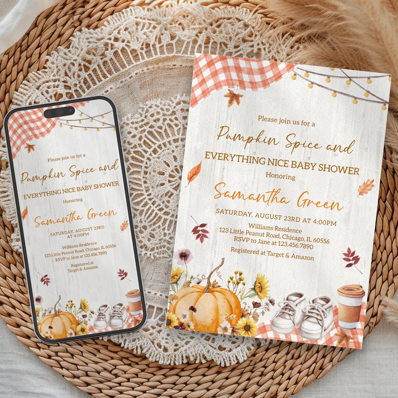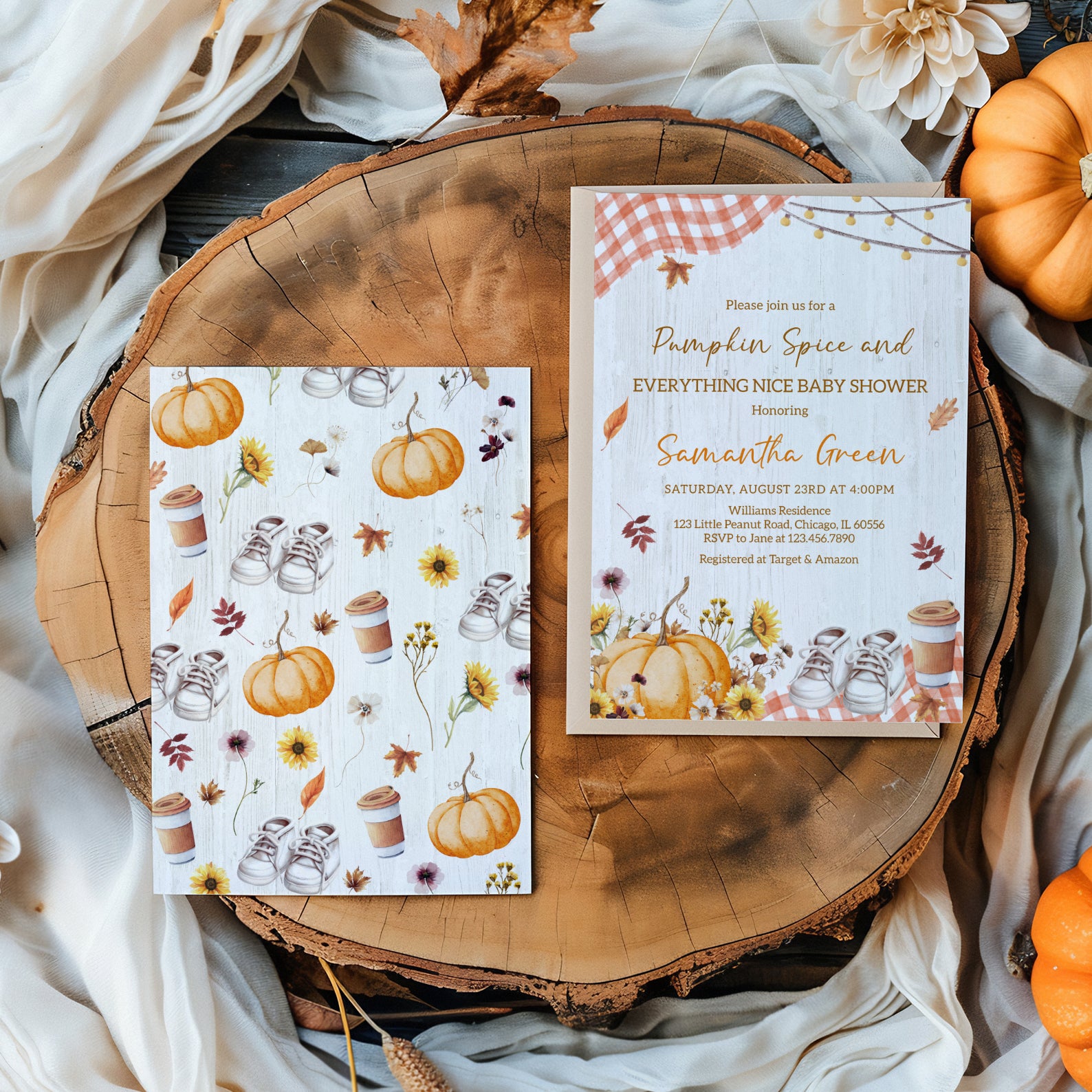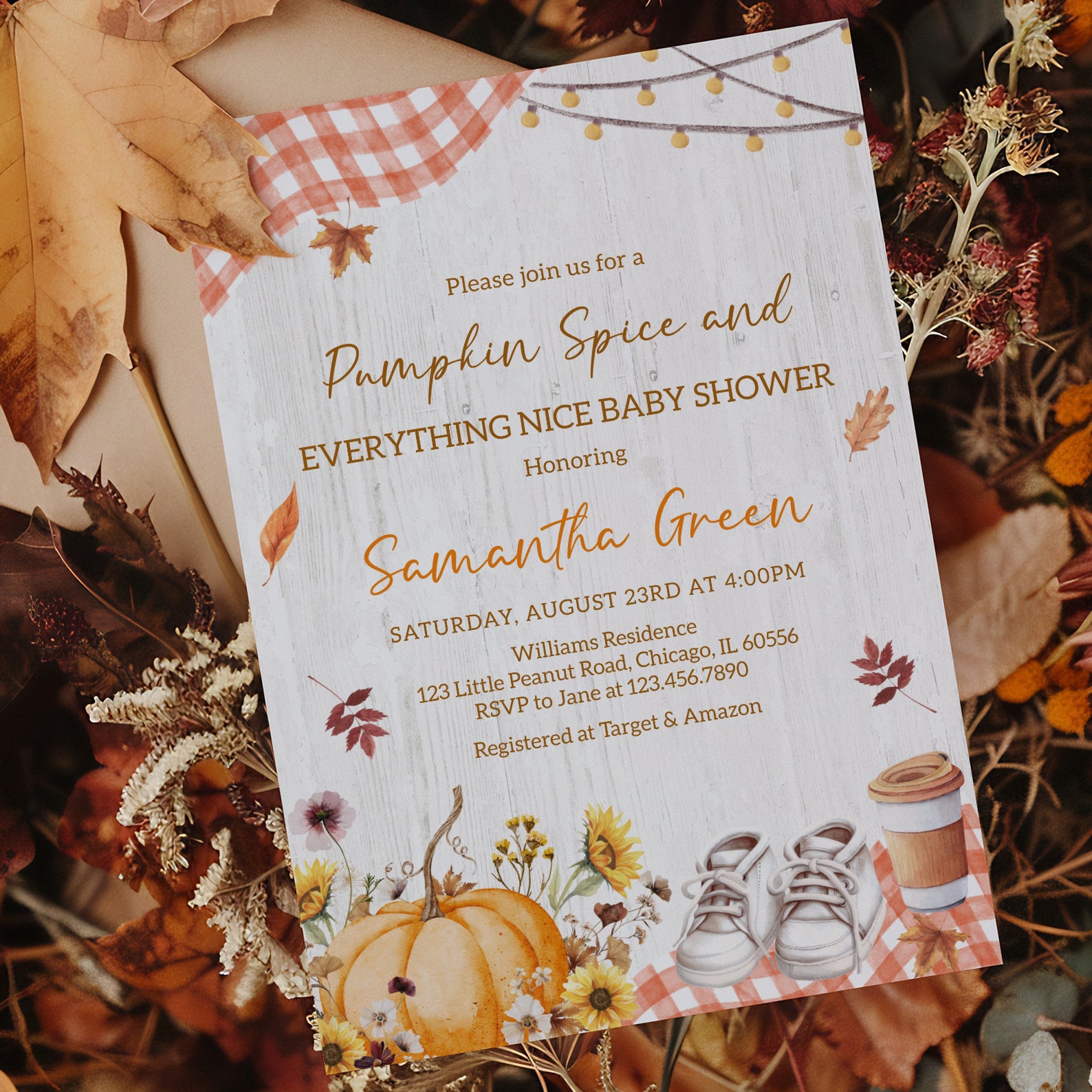 - Purchase this Pumpkin Spice Baby Shower Invite with Plaid & Pumpkins template