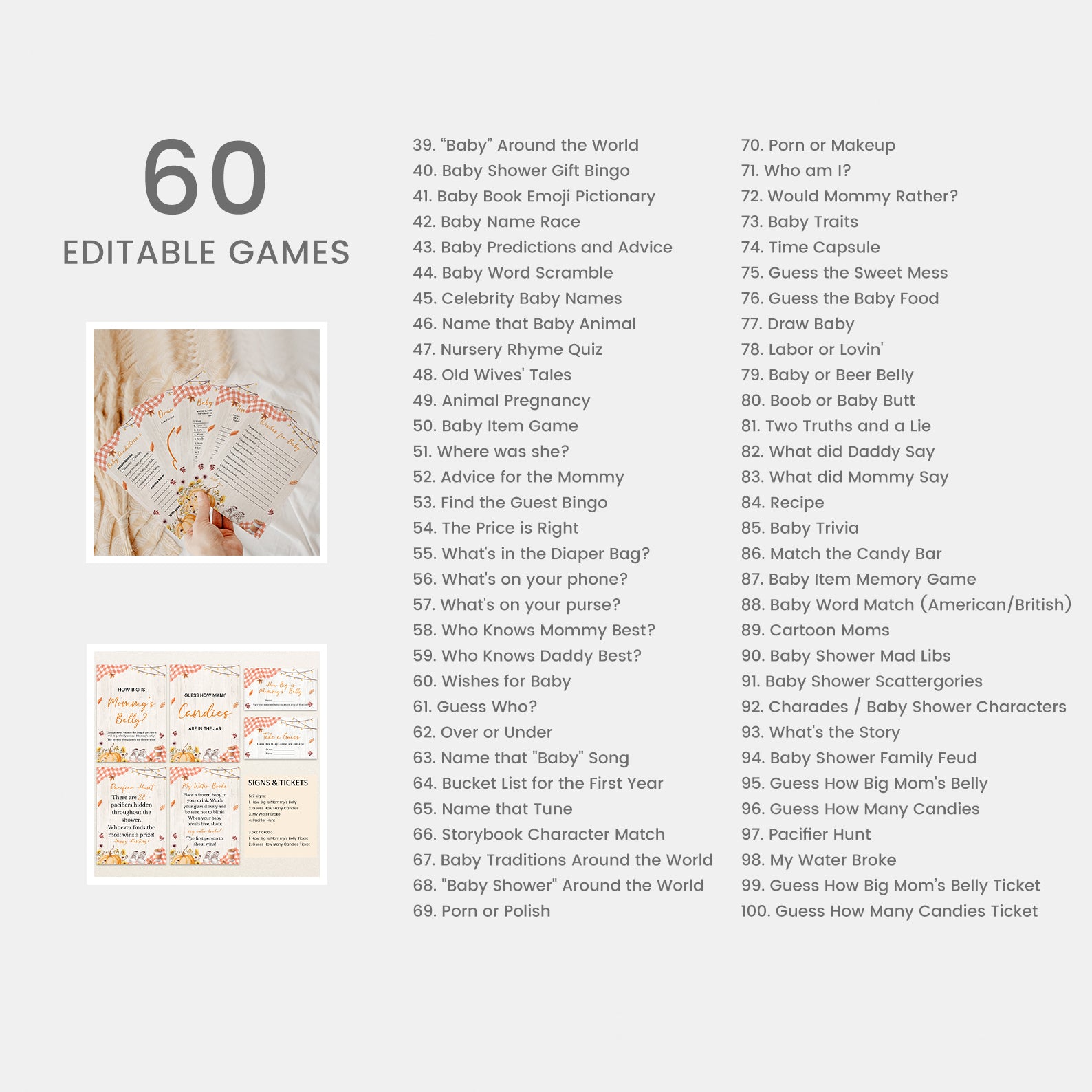 Get everything you need for a festive fall baby shower with our Mega Bundle! Styled with pumpkins, plaid picnic blanket, whimsical lights, florals, and autumn leaves, this cozy set includes 100 editable items: invitation, backside, mobile invite, diaper raffle, books for baby, thank you card, welcome sign, table signs, favor tags, food labels, water bottle labels, cupcake toppers, chocolate wrappers, and 60 games. The ultimate package for a memorable pumpkin spice celebration!