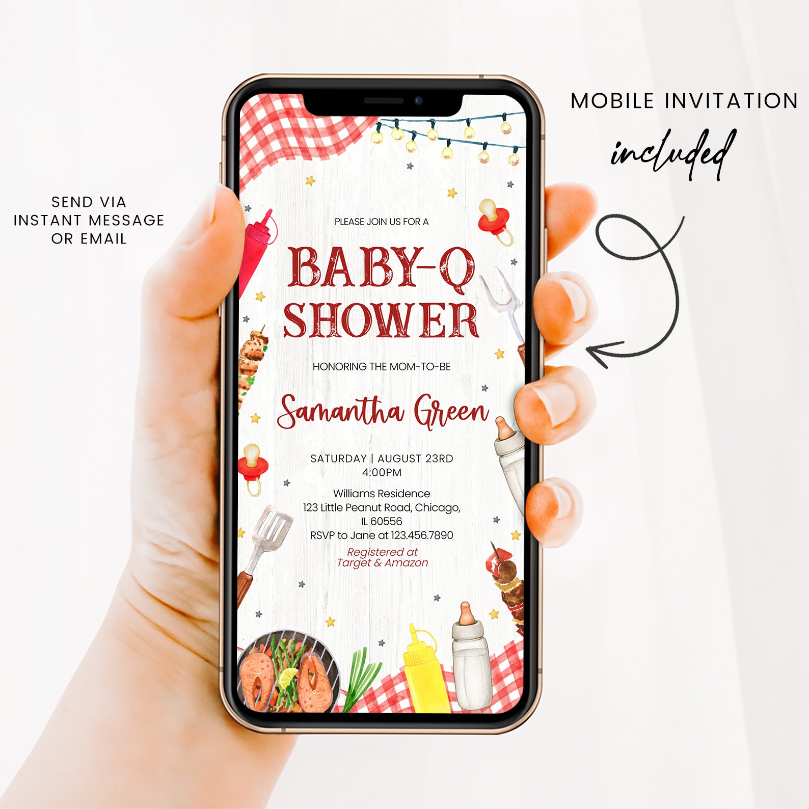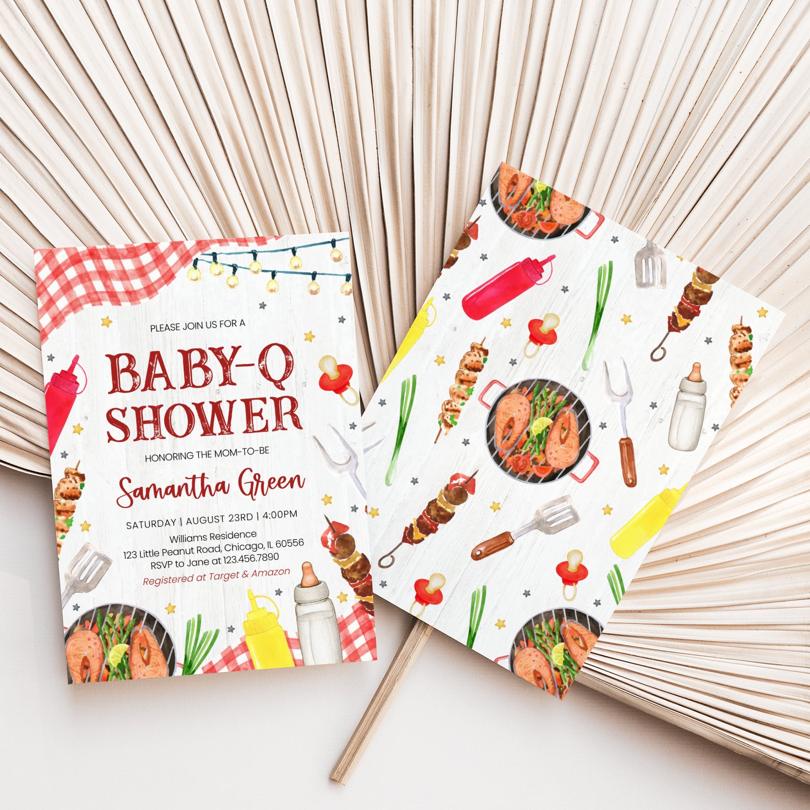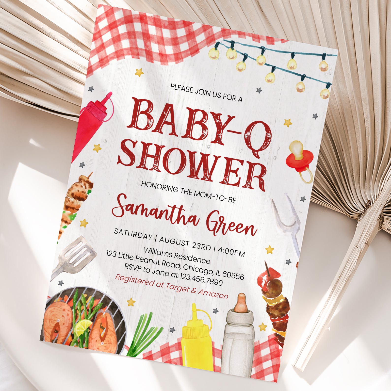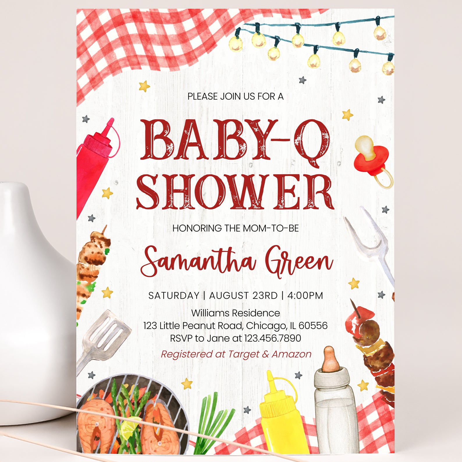 Celebrate your little one’s arrival with our charming summer baby shower digital invitation! This delightful design features a vibrant red plaid picnic cloth, adding a touch of rustic charm, while whimsical stars and hanging light bulbs create a festive atmosphere. Adorned with playful illustrations of barbecue essentials like sauce bottles, a grill, and even a baby bottle, this invitation perfectly captures the spirit of a fun-filled barbecue gathering. Make your baby shower unforgettable with this unique and eye-catching invite that sets the tone for a joyful celebration!
