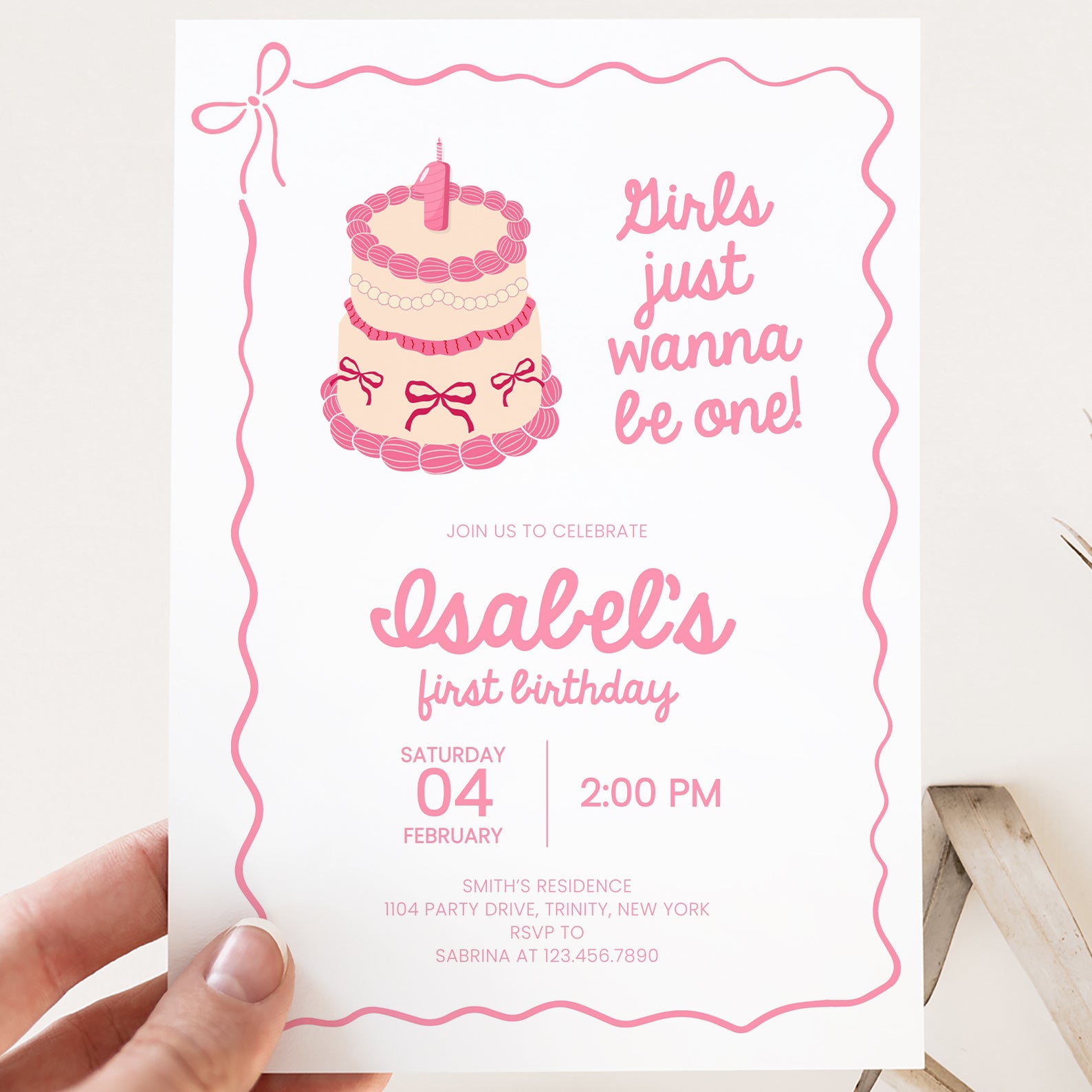 Celebrate your little girl's first birthday in style with our "Girls Just Wanna Be One" digital invitation! Featuring a charming pink cake adorned with a playful red ribbon and a chic wavy ribbon border, this minimalist design perfectly captures the joy of this special milestone. Effortlessly set the tone for a delightful celebration with this elegant invite that will have your guests excited to join the fun. Make her first birthday unforgettable with a touch of sweetness and sophistication!