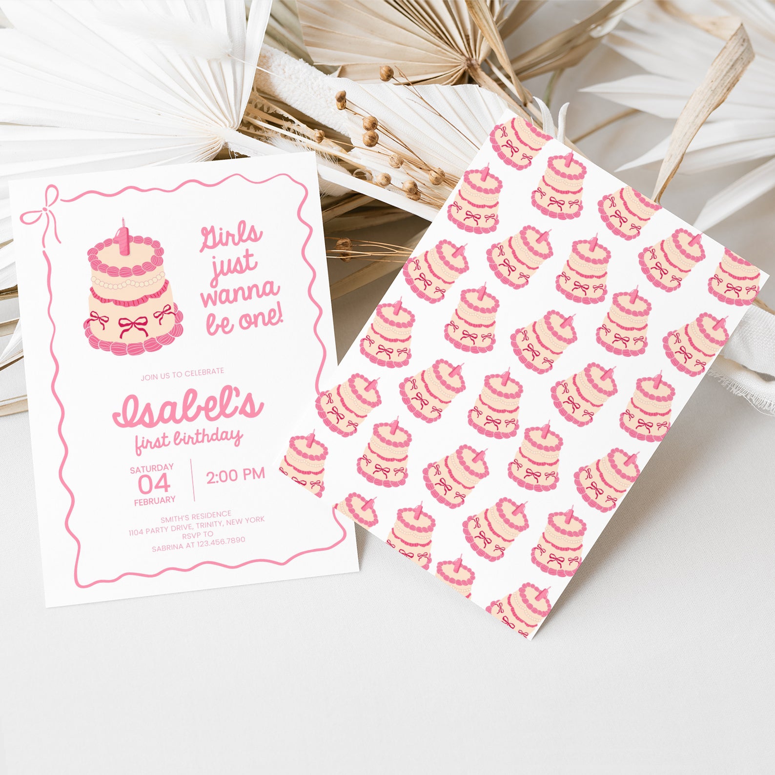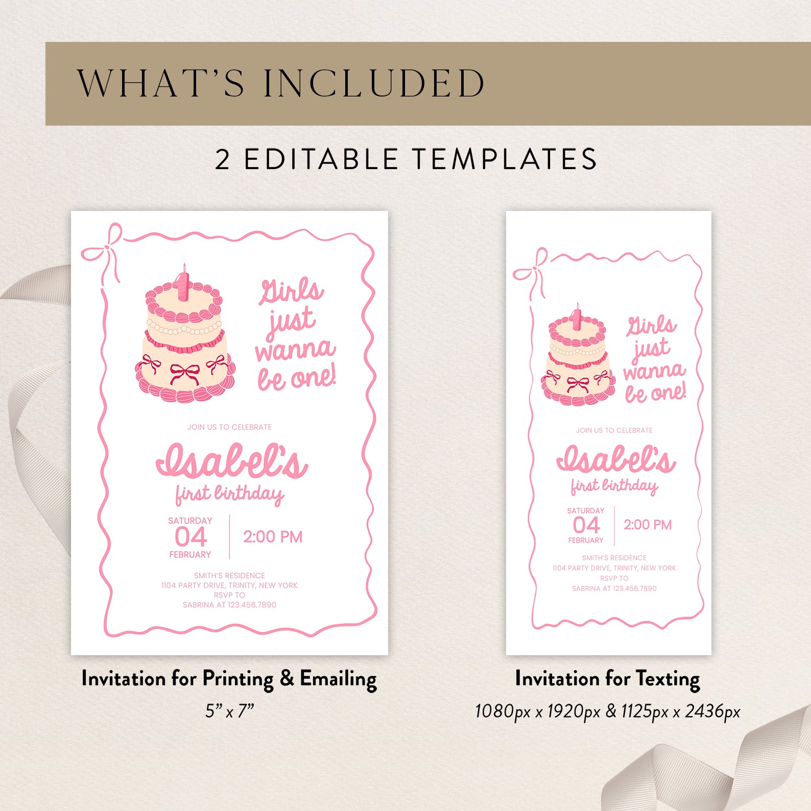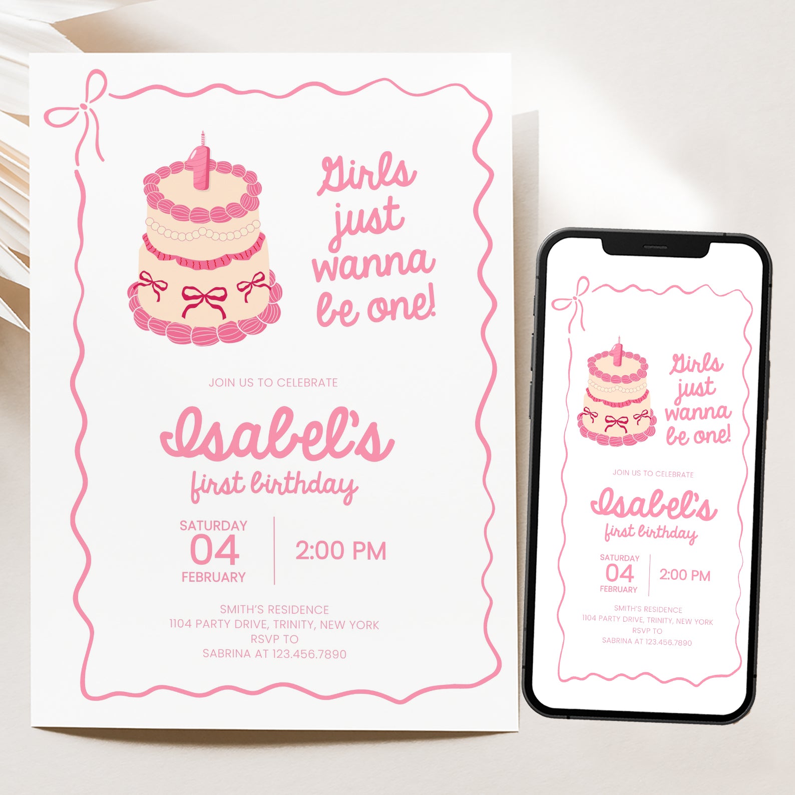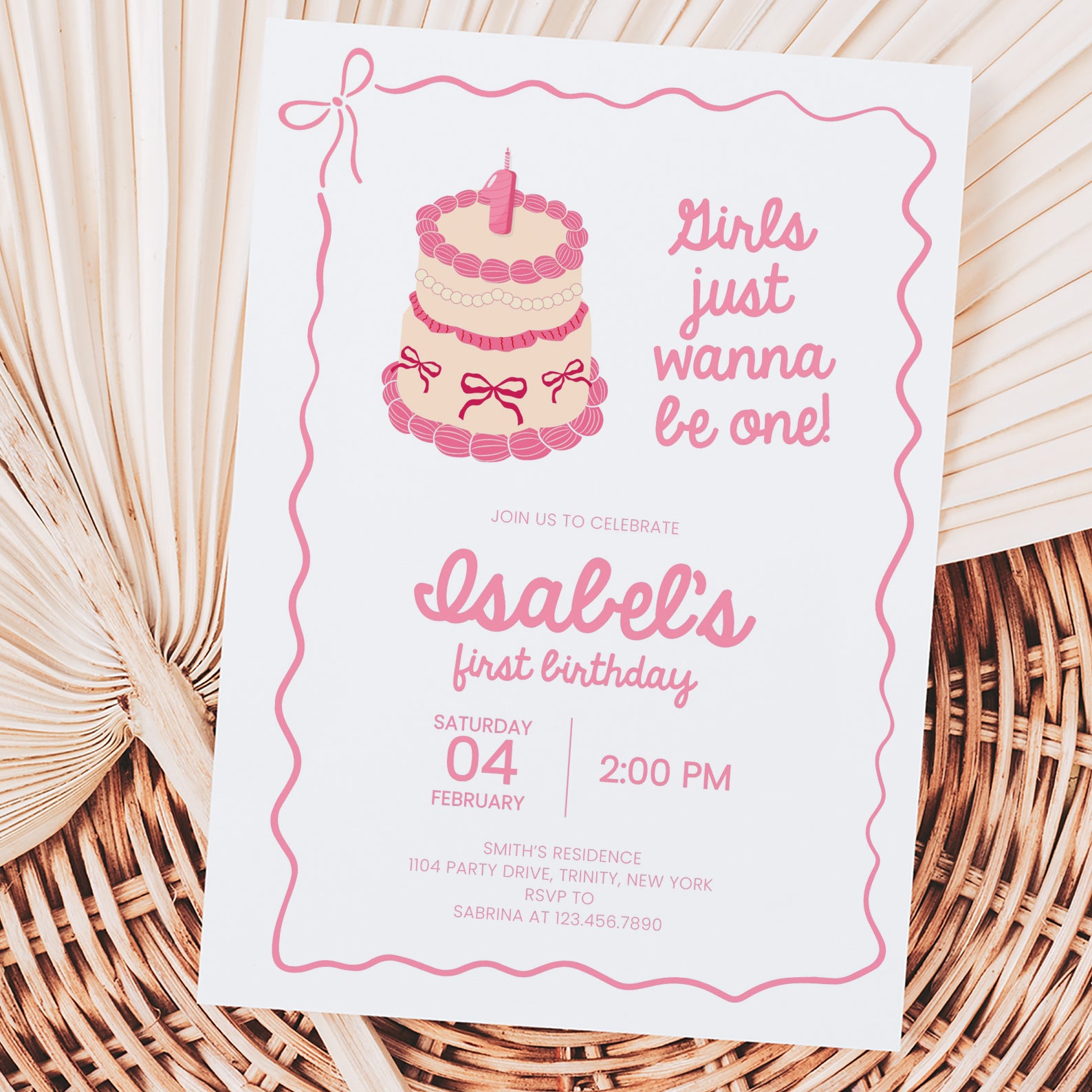 - Purchase this Girls Just Wanna Be One: Pink First Birthday Invite template
