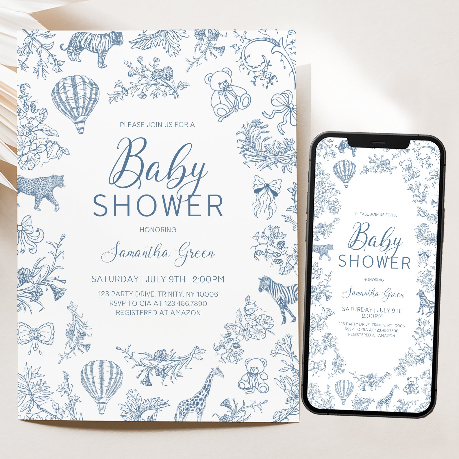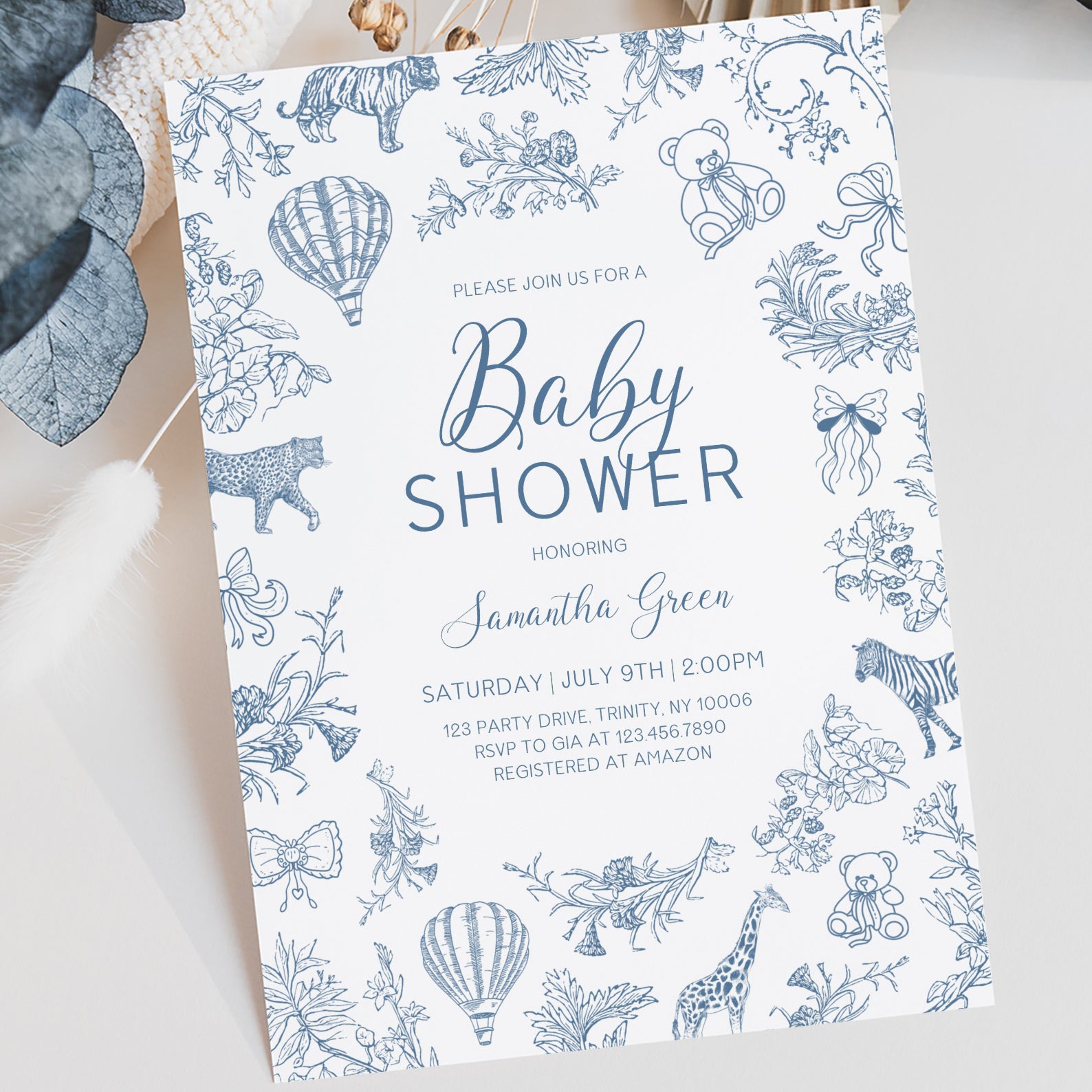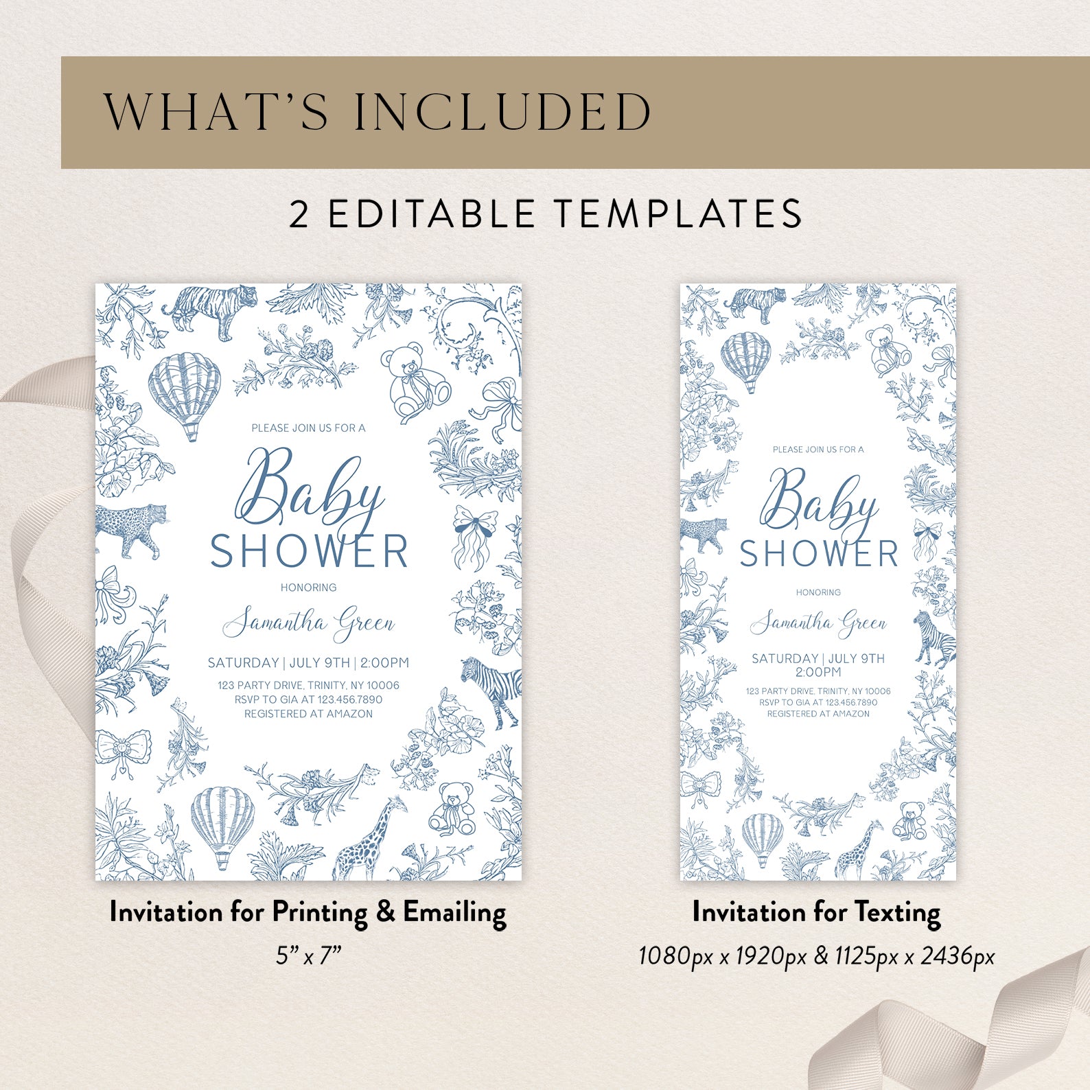 - Purchase this Blue Safari Baby Shower Invitation Bundle with Toile de Jouy Print template