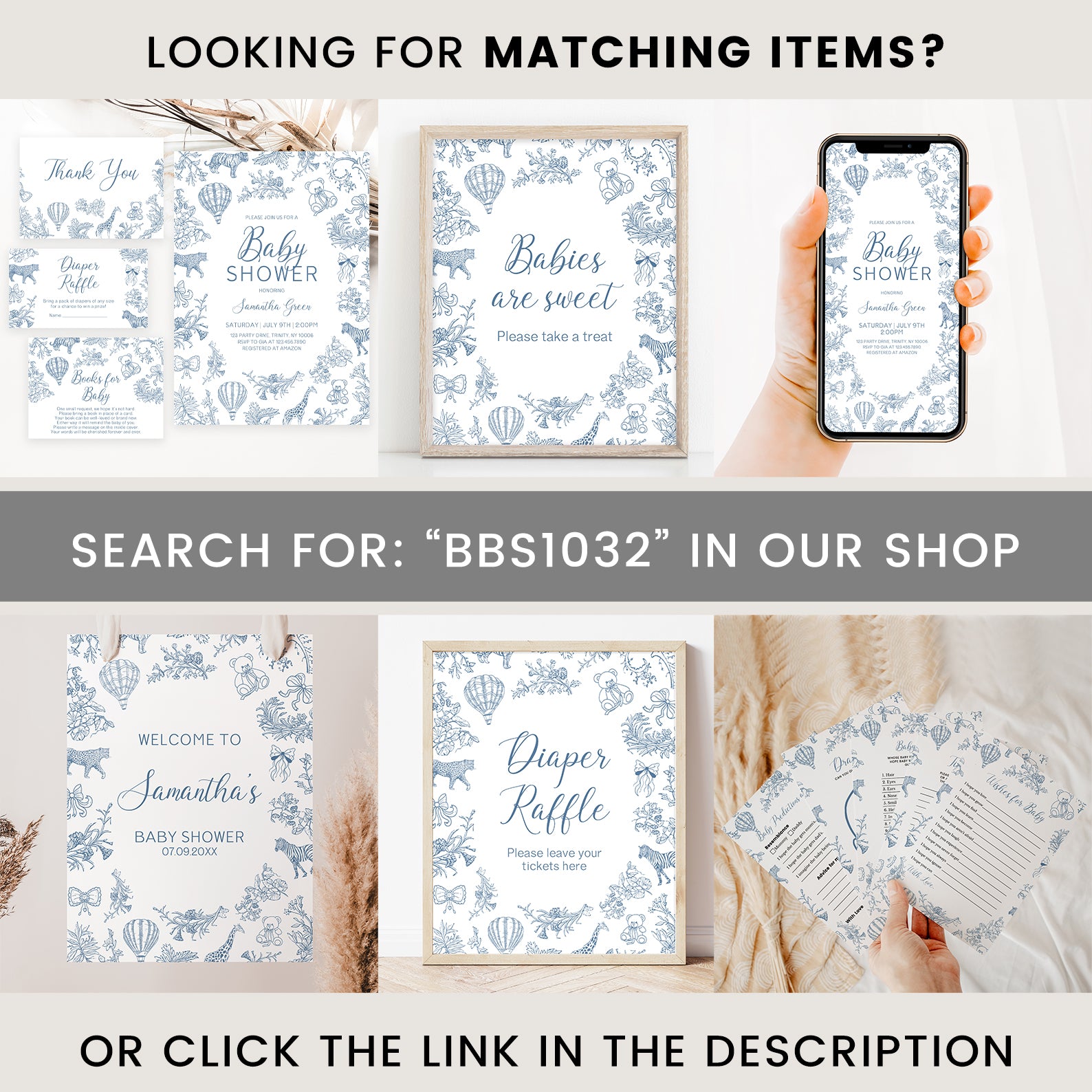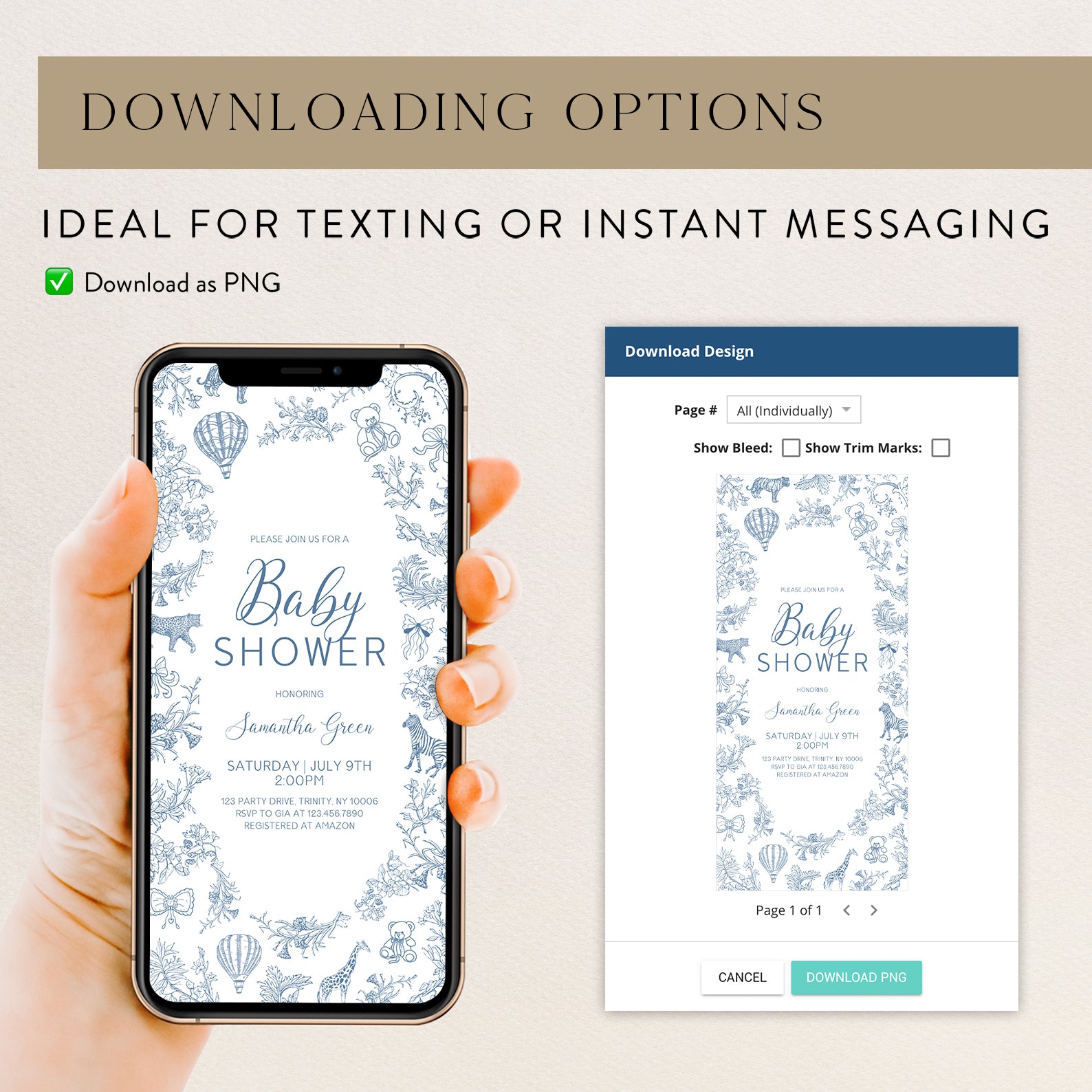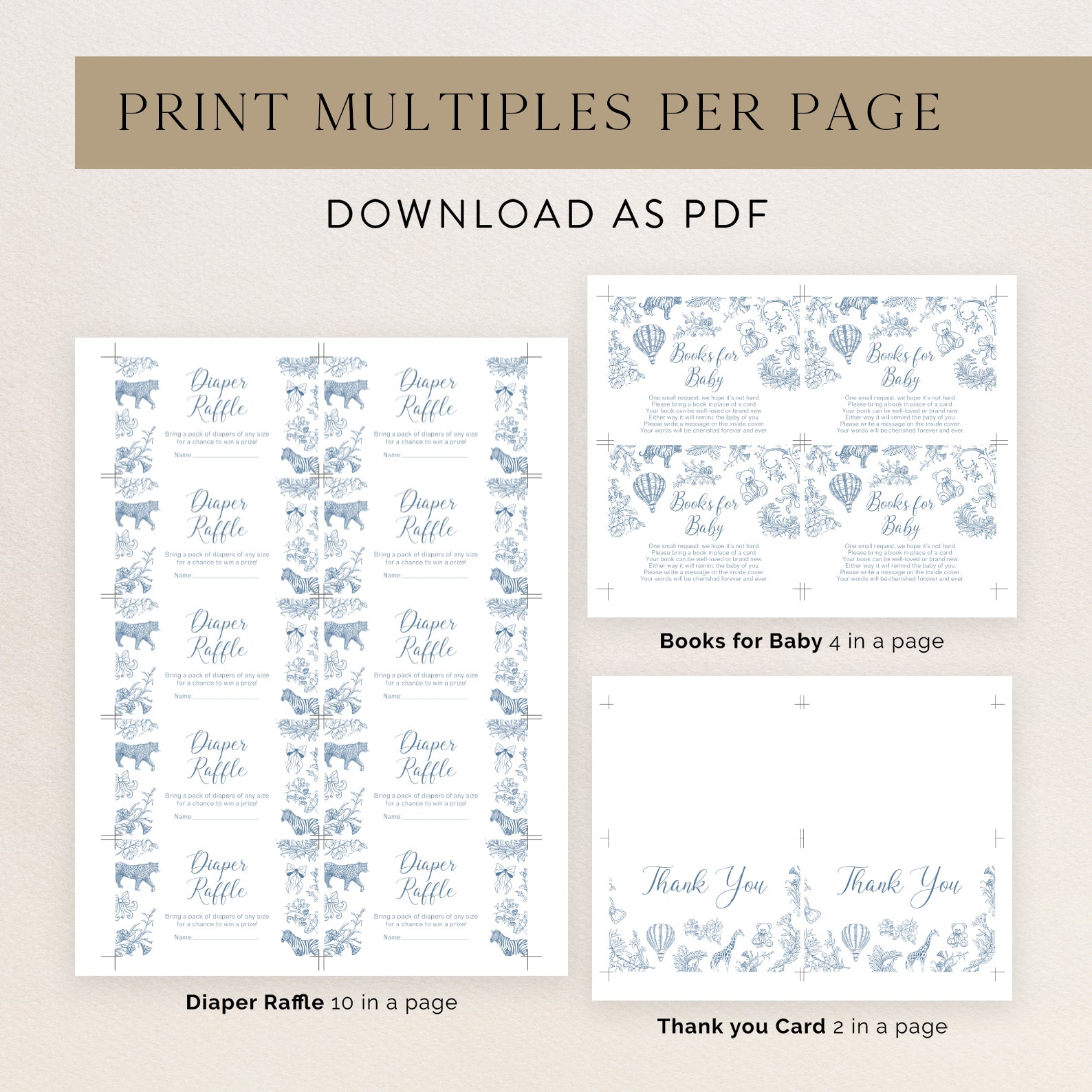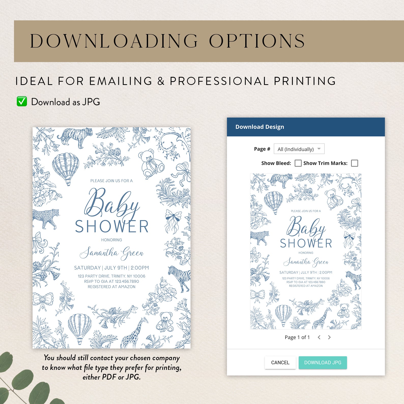 - Purchase this Blue Safari Baby Shower Invitation Bundle with Toile de Jouy Print template