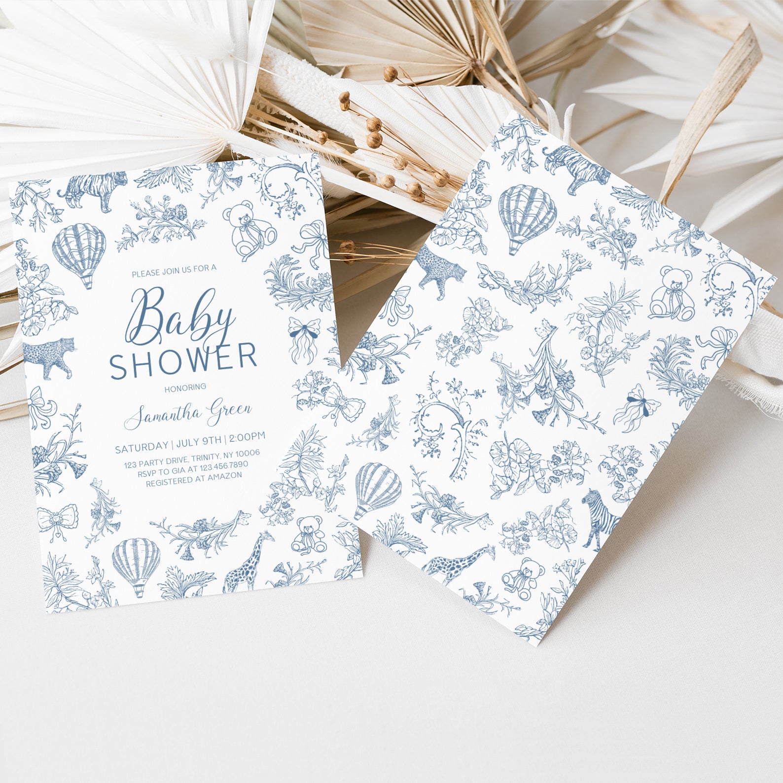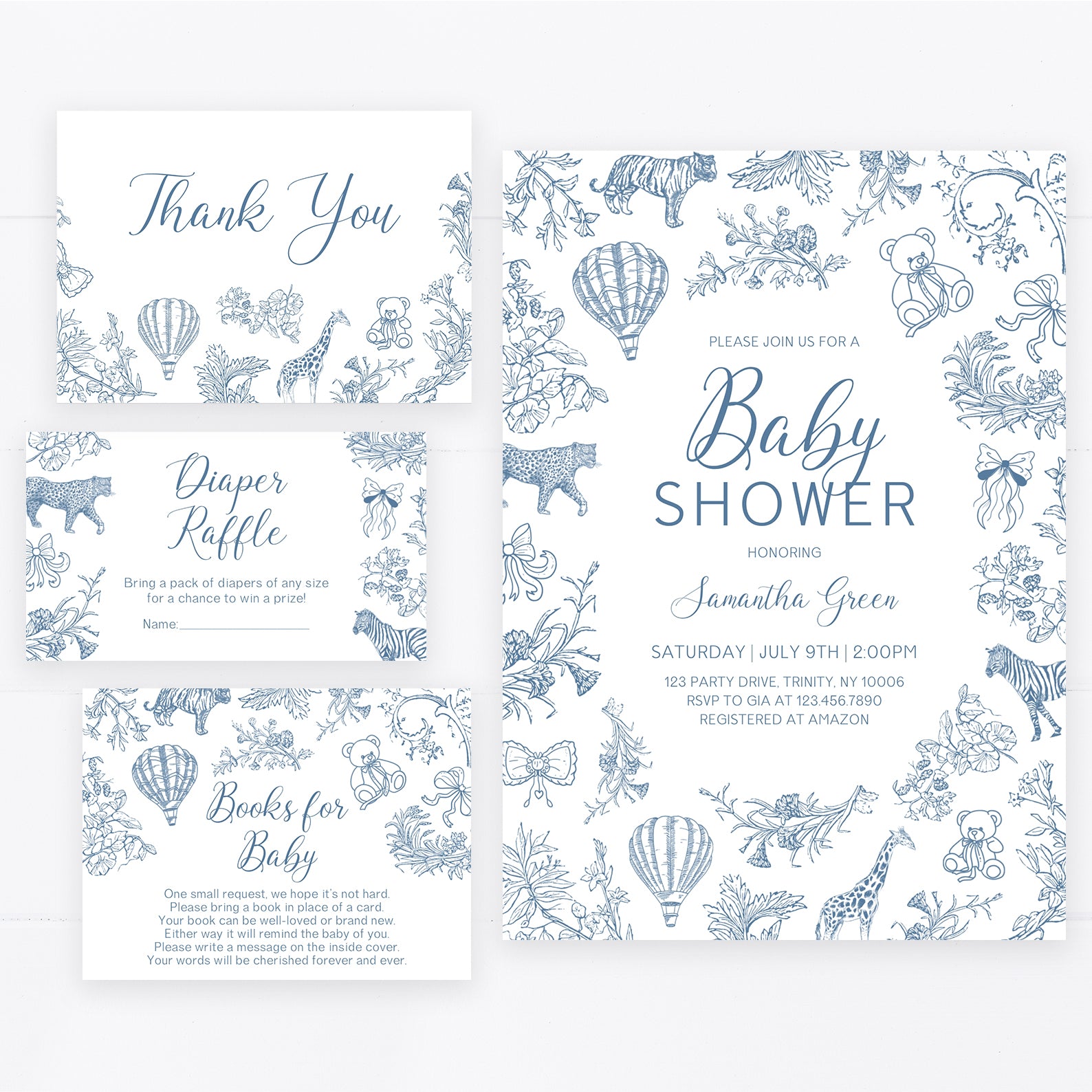 Blue Safari Baby Shower Invitation Bundle with Toile de Jouy Print