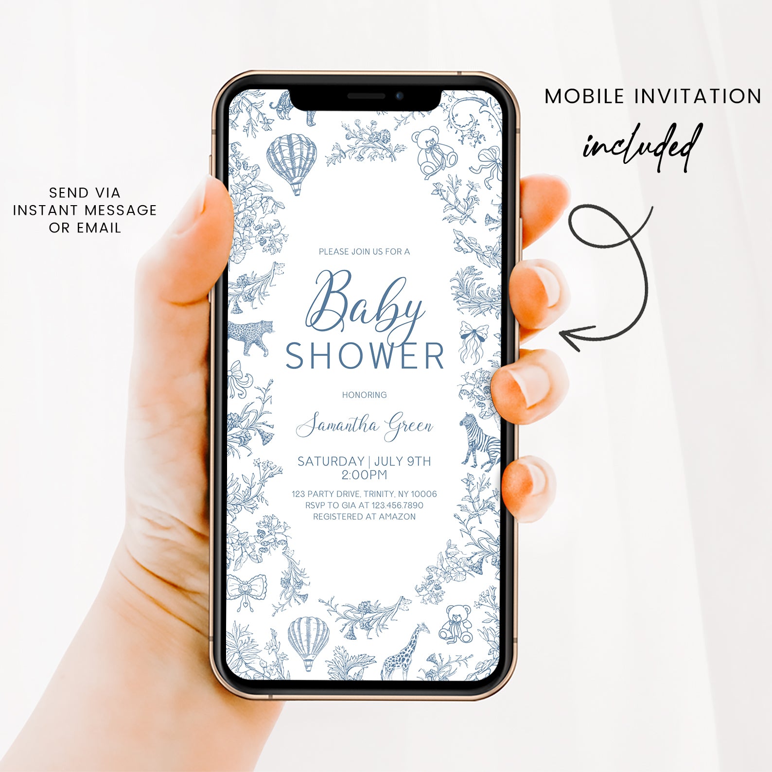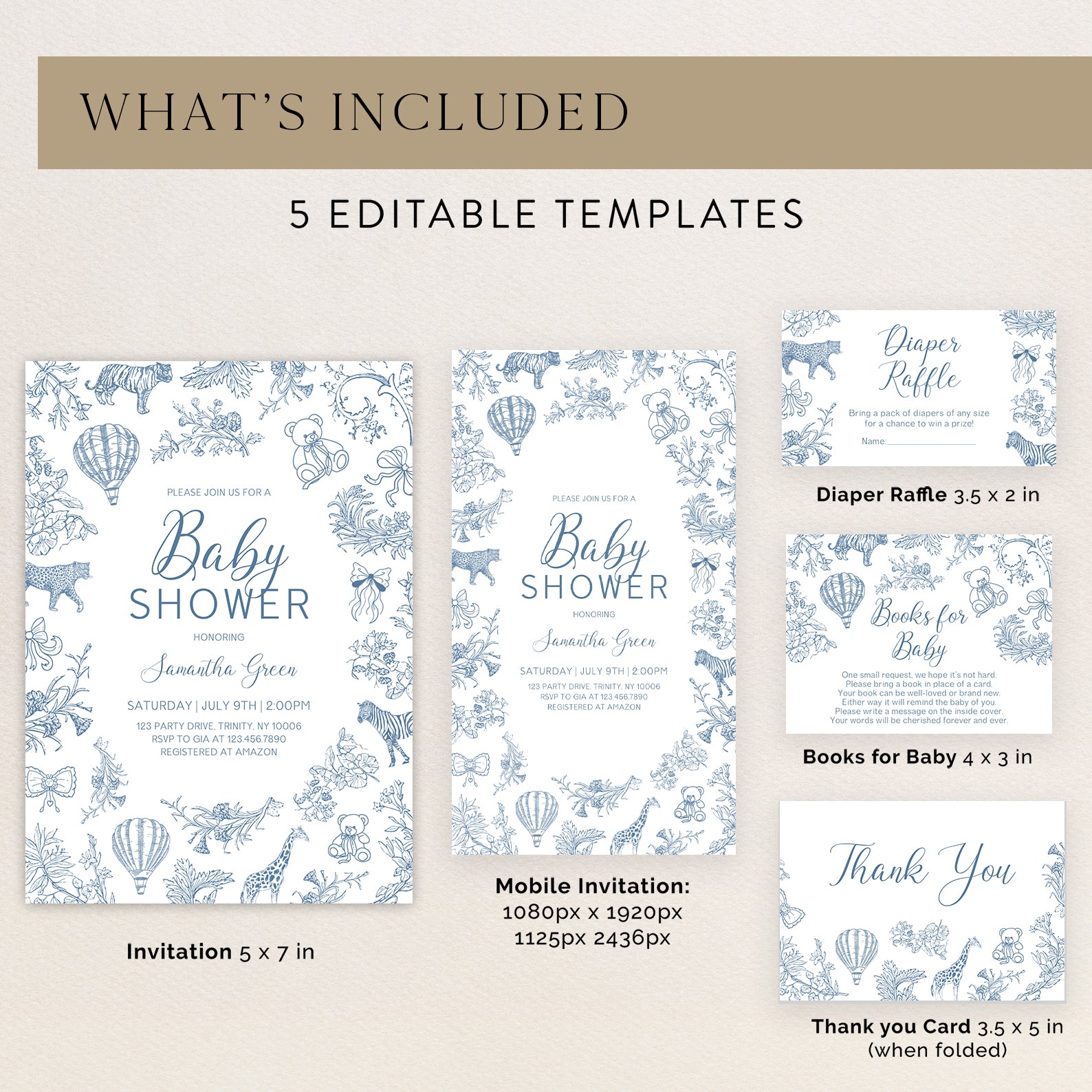 Celebrate your little one's arrival with our charming blue-themed baby shower invitation bundle. Featuring delightful toile de jouy patterns with safari animals, trees, roses, and more, this set includes the invitation, mobile invite, diaper raffle, books for baby, and thank you card. Easy to customize and share, it combines elegance and fun, setting the perfect tone for your memorable celebration!