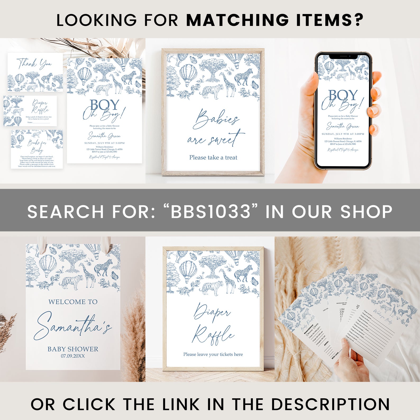 - Purchase this Blue Safari Toile Baby Shower Digital Game Bundle for a Baby Boy template