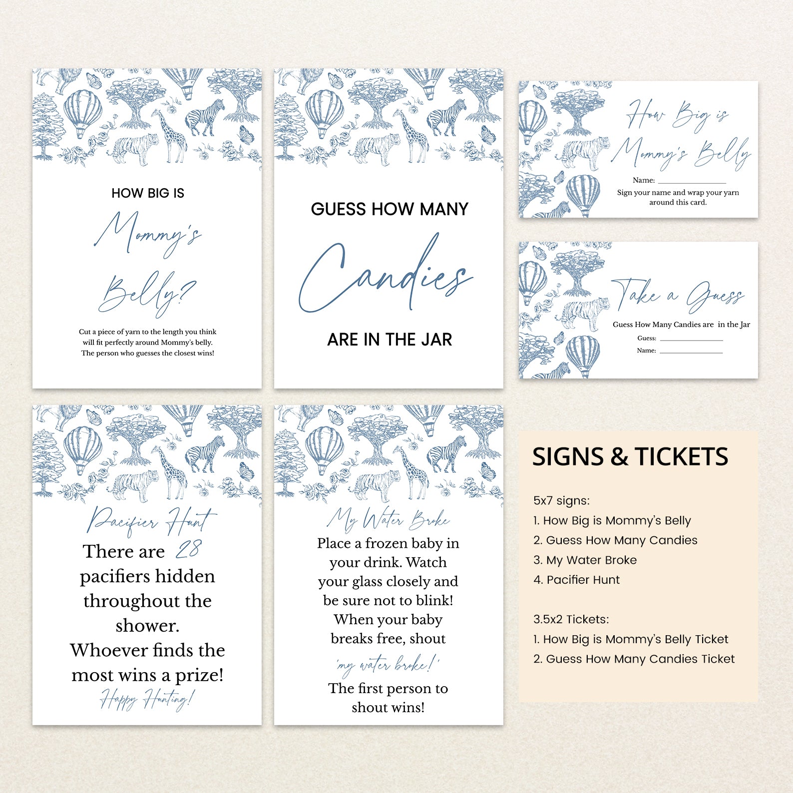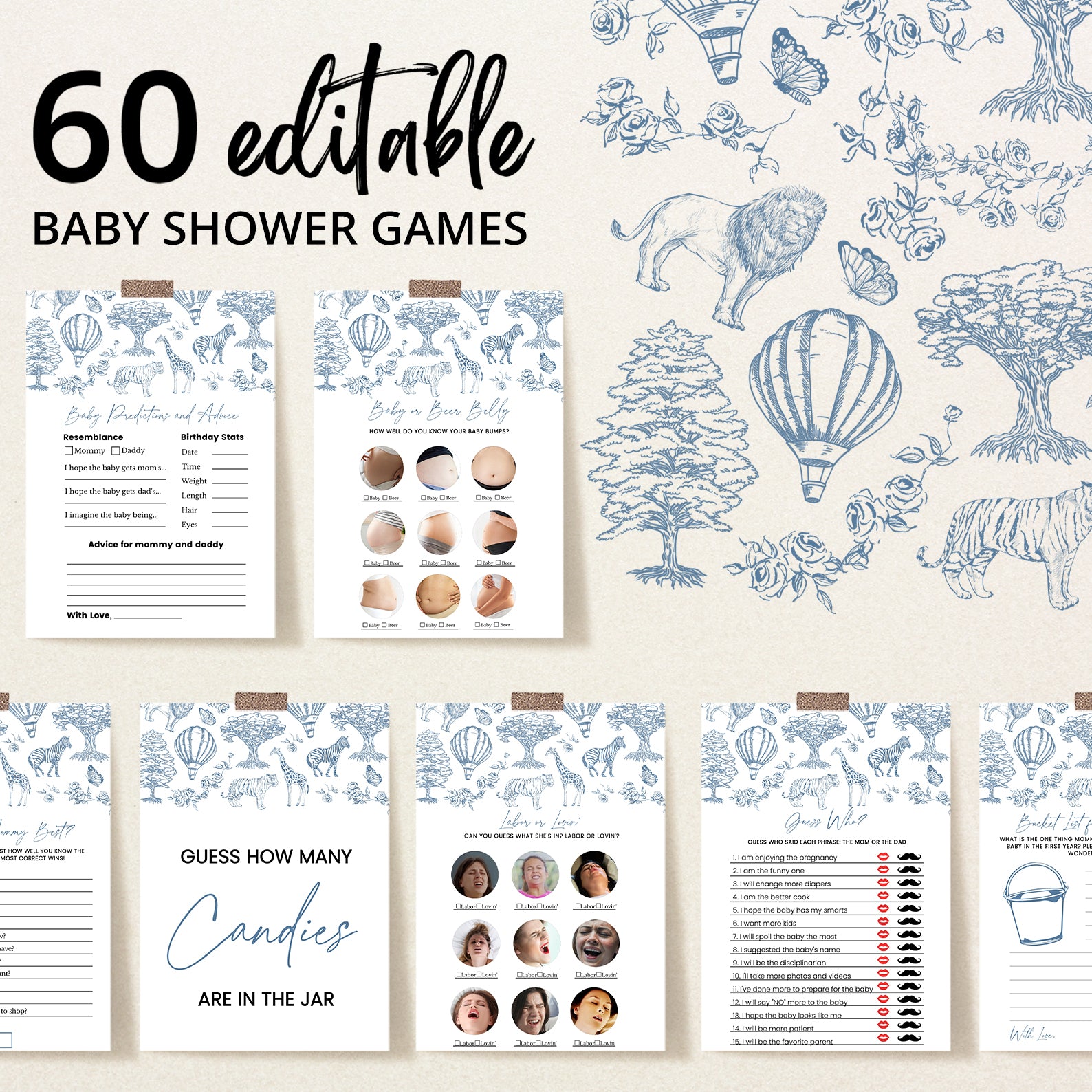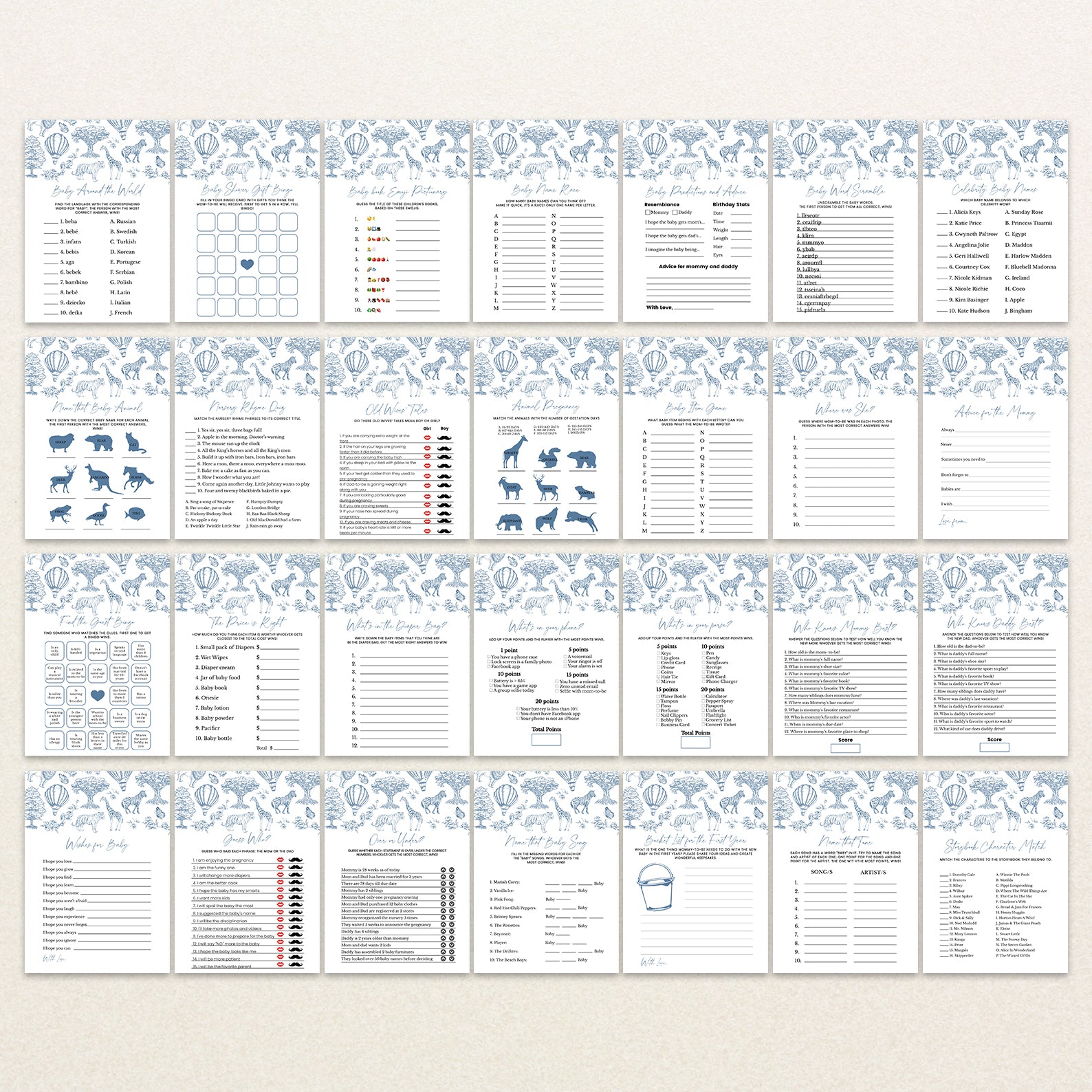 Celebrate your little one's upcoming arrival with our charming blue boy-themed baby shower game bundle! Featuring an enchanting toile de jouy pattern adorned with adorable safari animals, whimsical trees, delicate roses, and playful hot air balloons, this beautifully illustrated set includes 60 baby shower games to keep your guests entertained. Perfect for adding elegance and fun to your celebration, this bundle brings timeless charm and joyful moments to your special day.