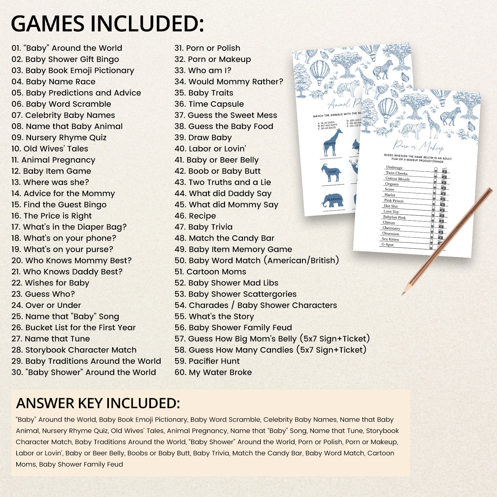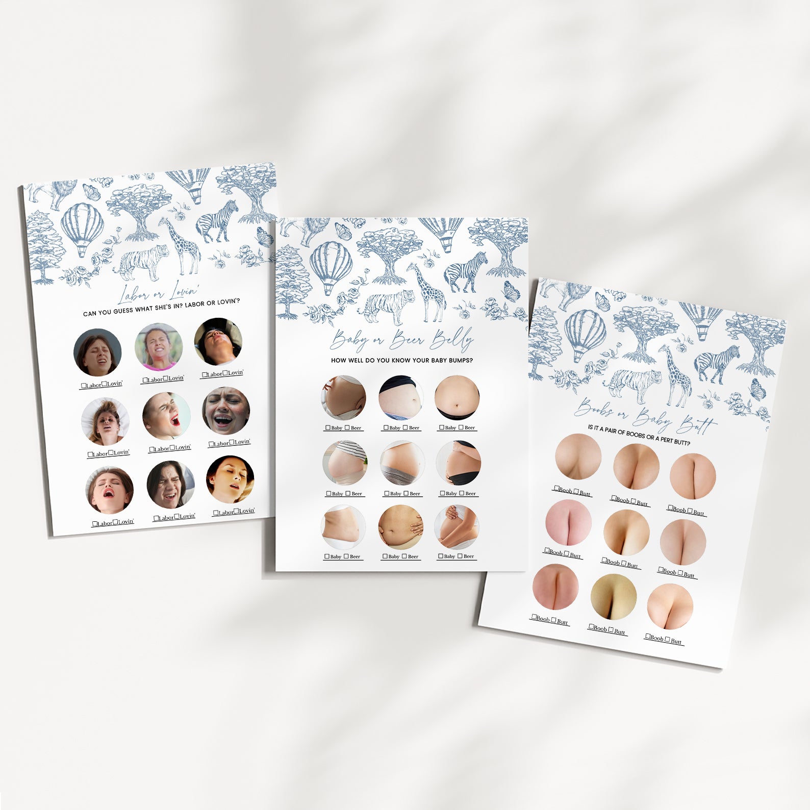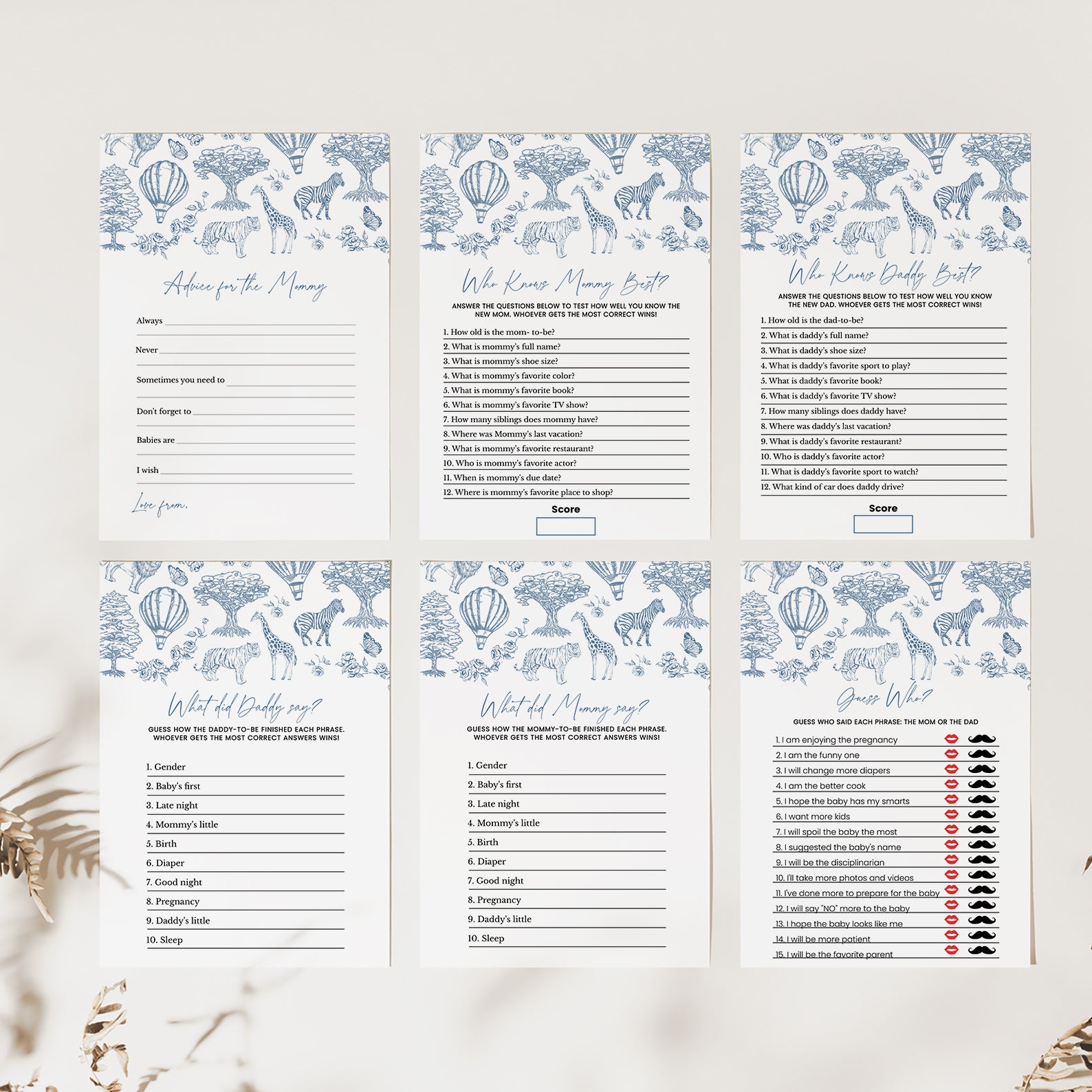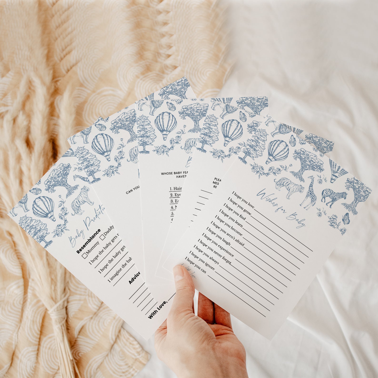 Celebrate your little one's upcoming arrival with our charming blue boy-themed baby shower game bundle! Featuring an enchanting toile de jouy pattern adorned with adorable safari animals, whimsical trees, delicate roses, and playful hot air balloons, this beautifully illustrated set includes 60 baby shower games to keep your guests entertained. Perfect for adding elegance and fun to your celebration, this bundle brings timeless charm and joyful moments to your special day.