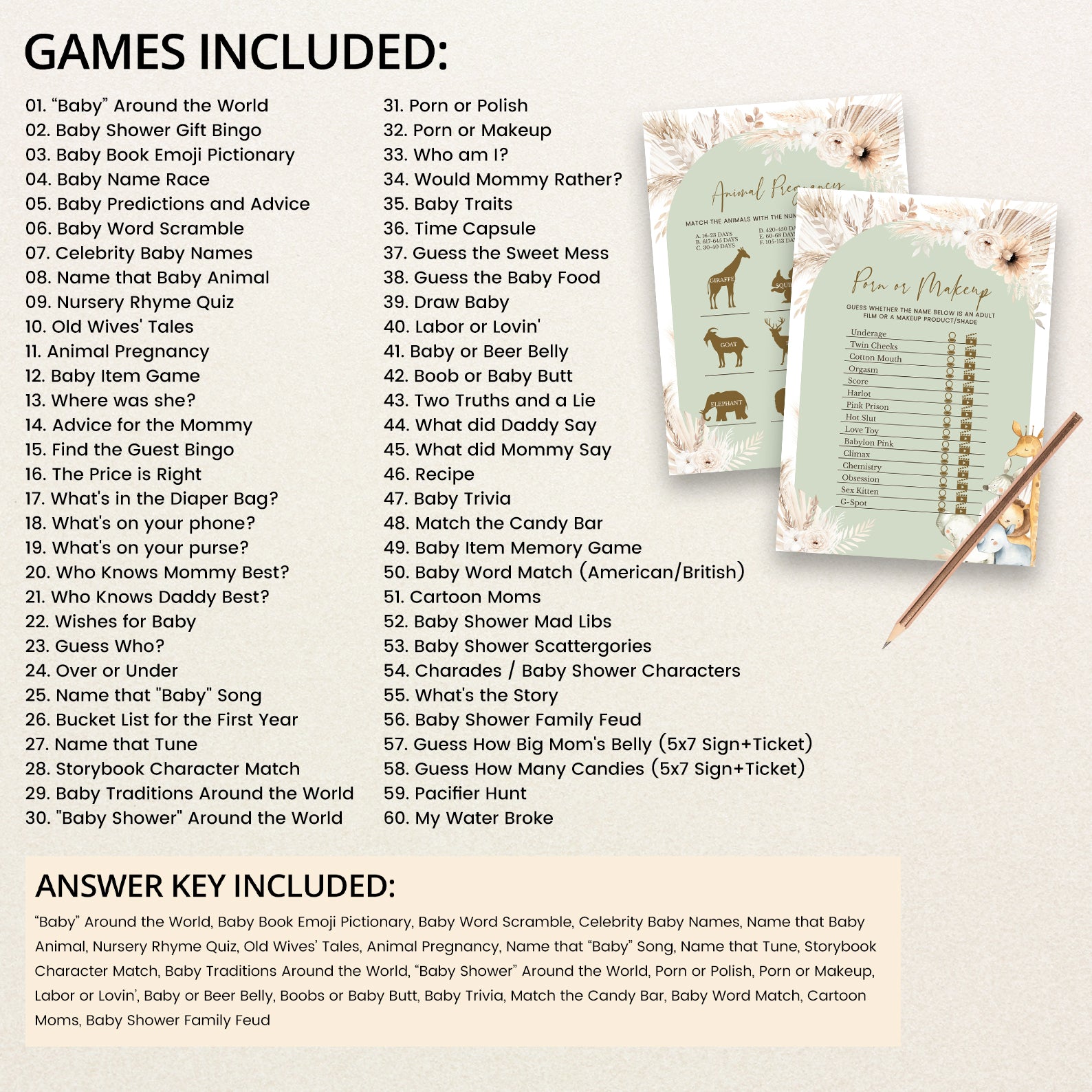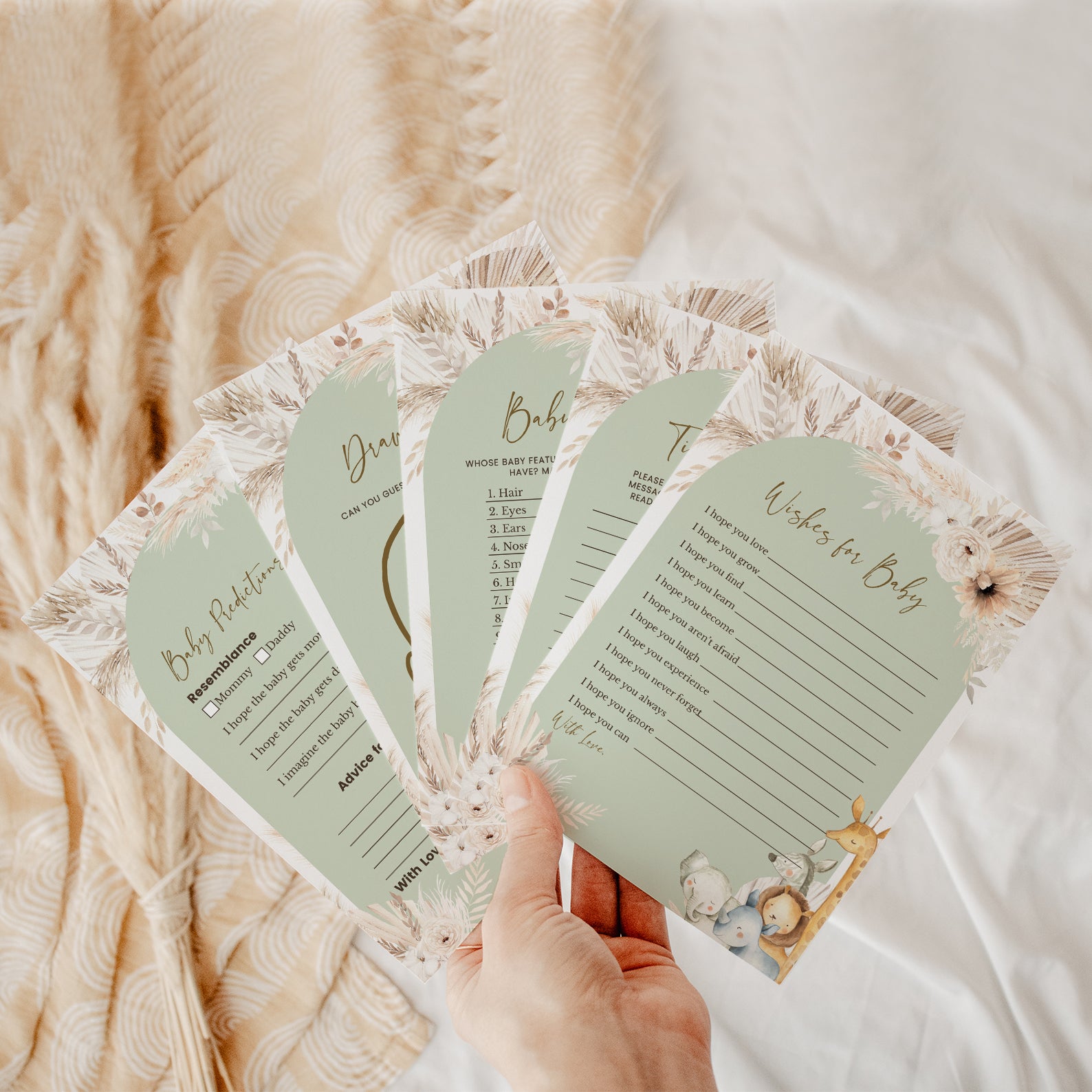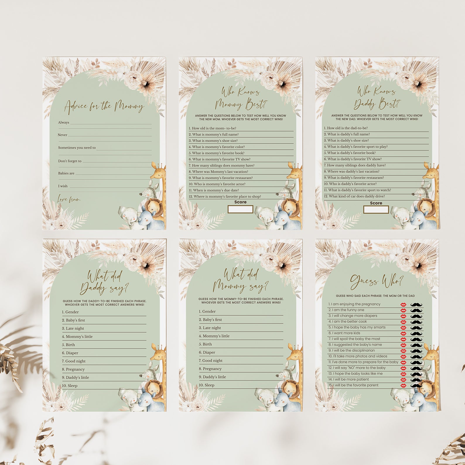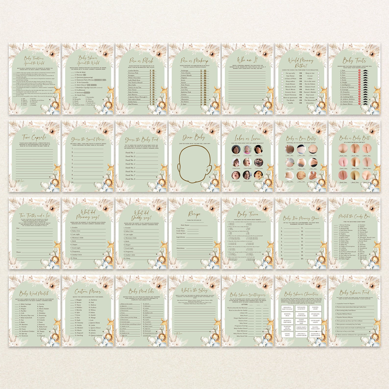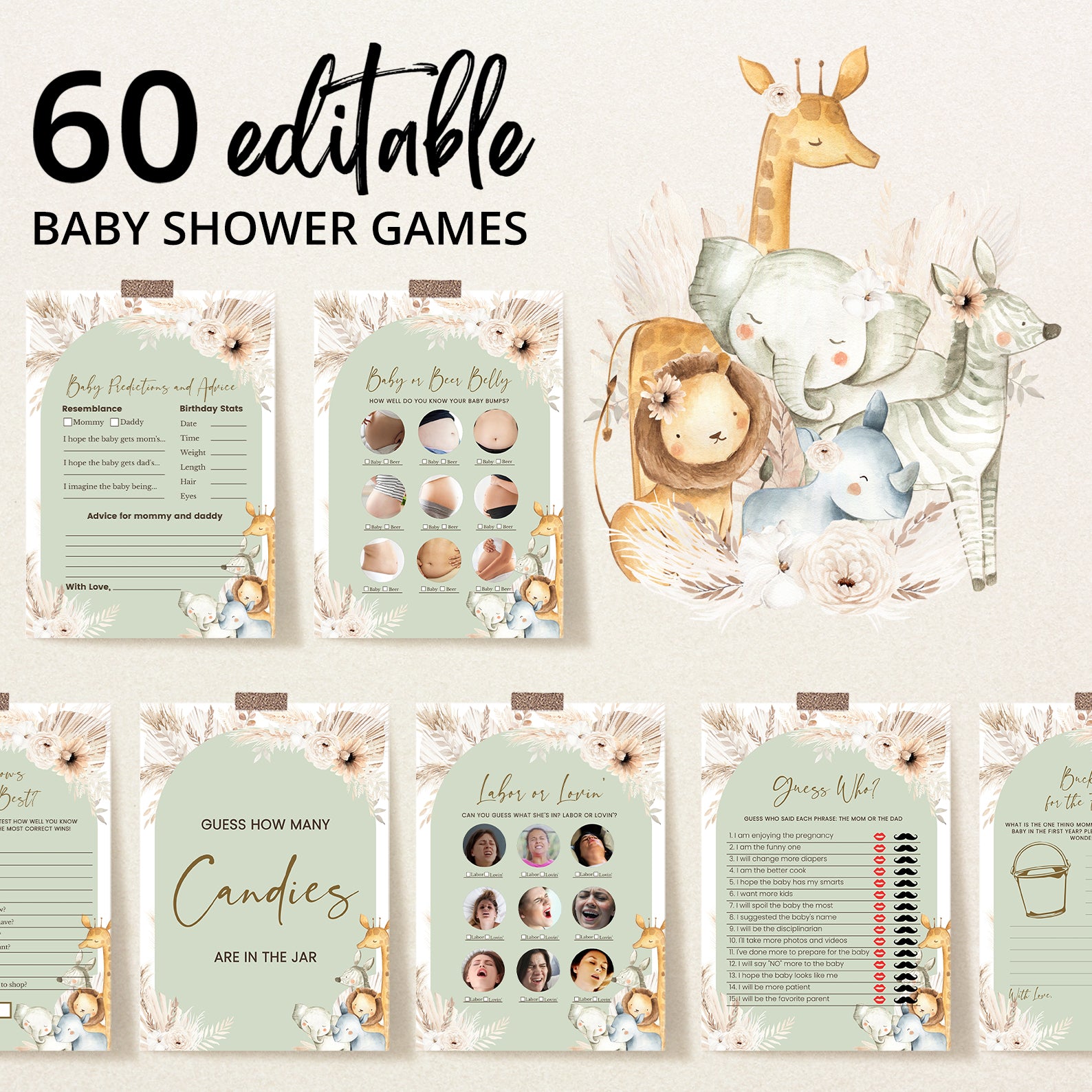 Make your shower extra fun with our Hello Baby game bundle, designed with greenery, florals, and adorable safari animals. This collection includes 60 editable baby shower games, from classics like Bingo and Word Scramble to modern favorites. Easy to personalize and beautifully styled, these games keep guests entertained while perfectly matching your safari-inspired theme, ensuring a joyful and interactive celebration.