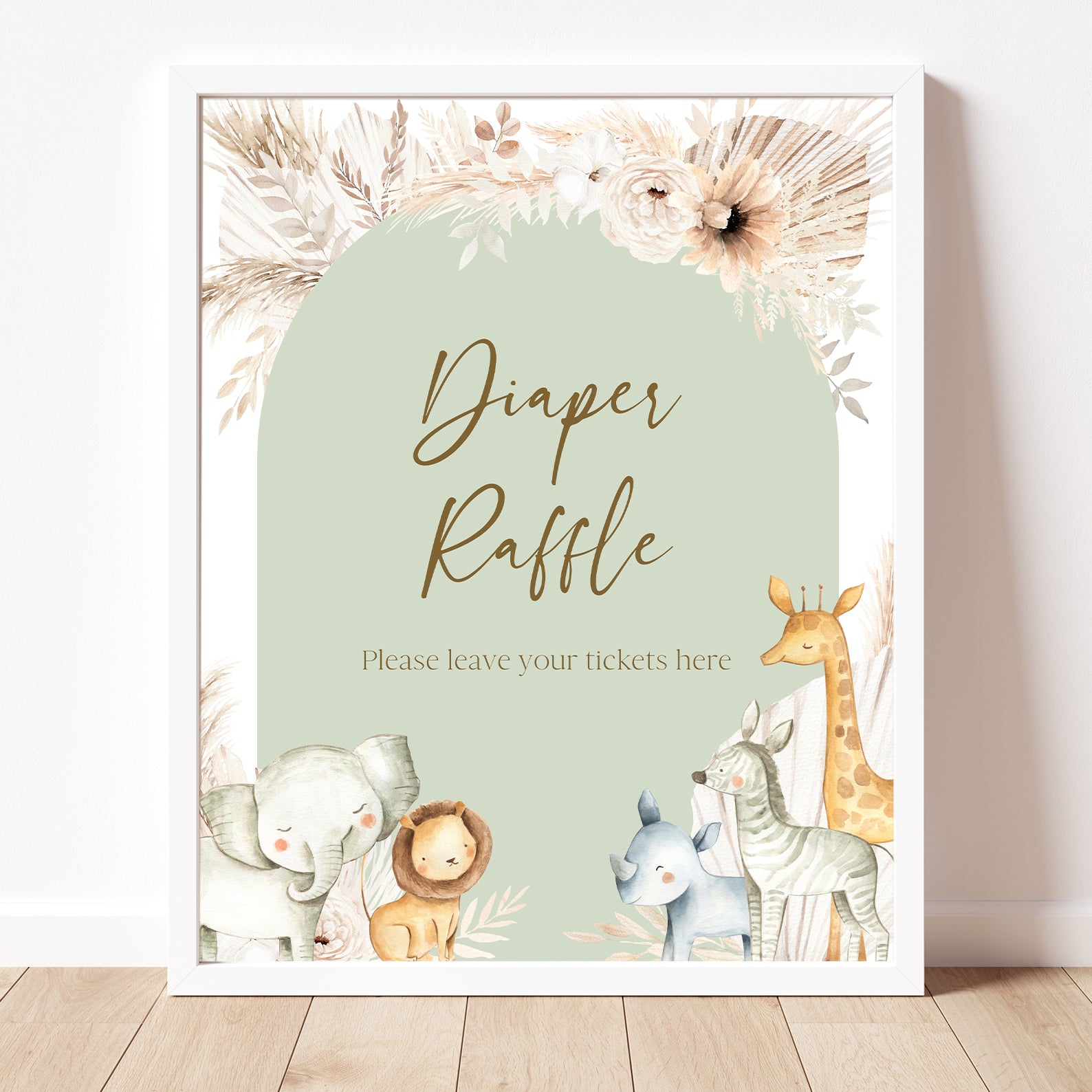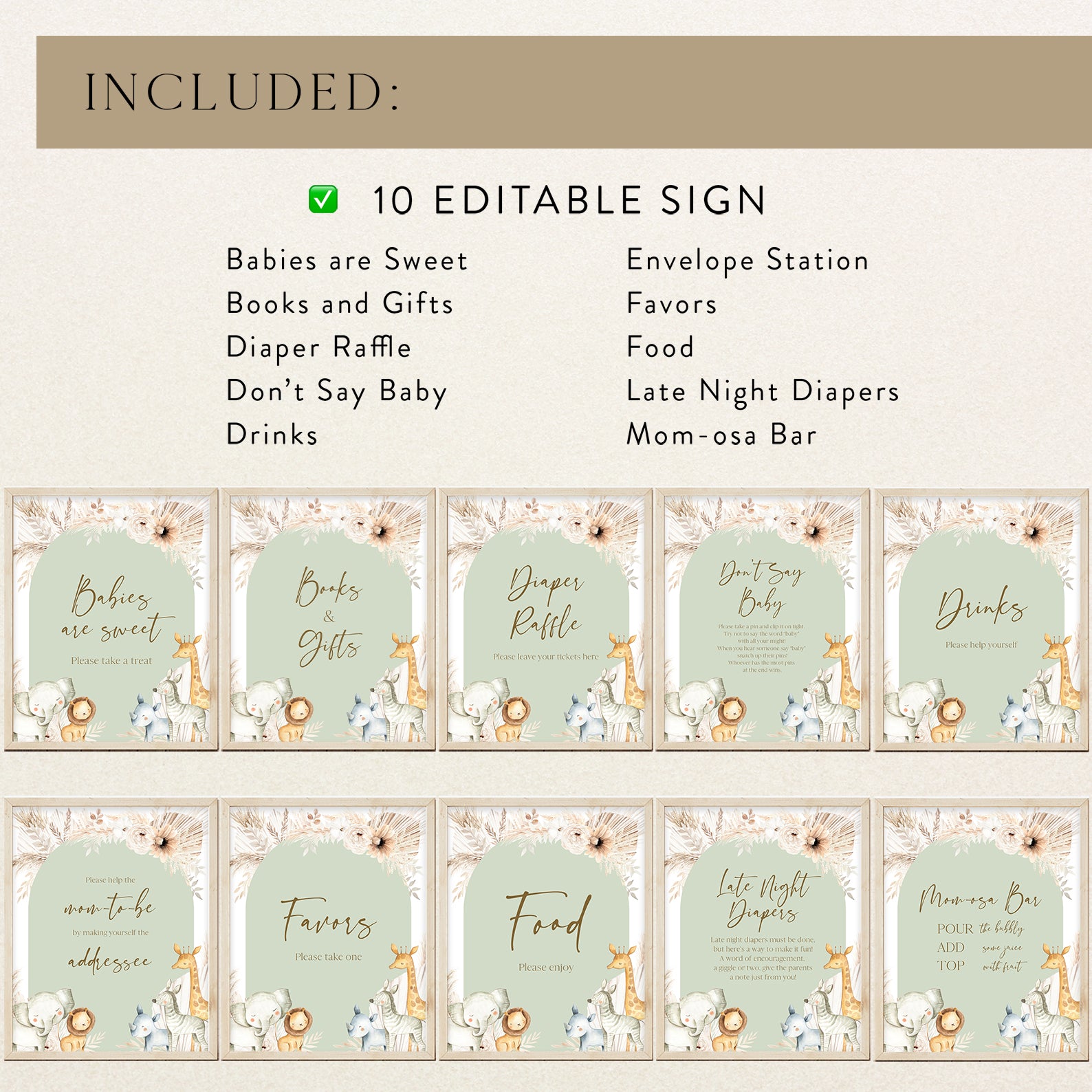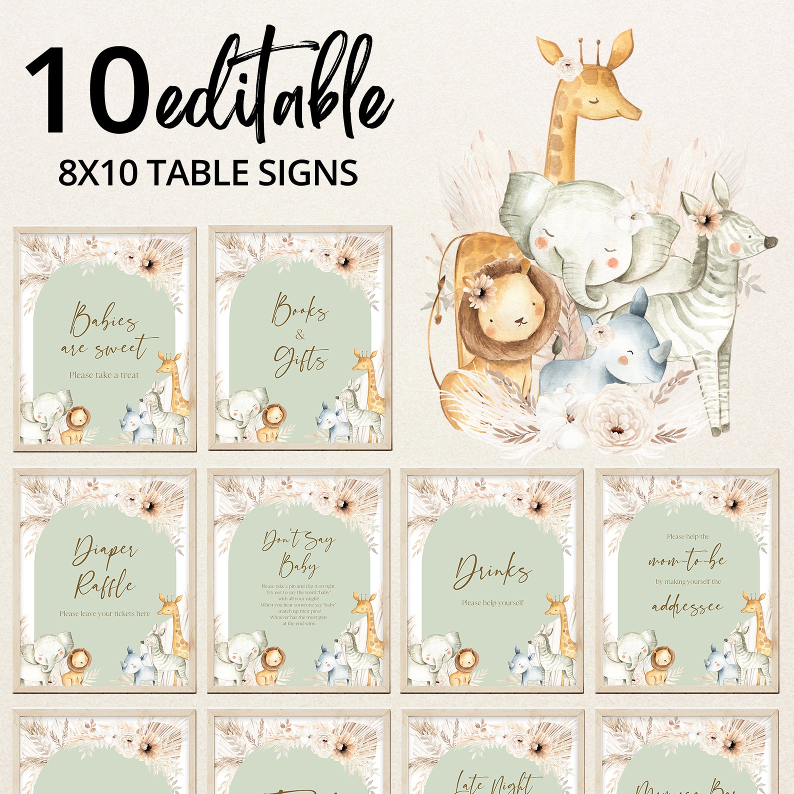 Enhance your shower décor with our Hello Baby table sign bundle, styled with boho greenery, floral accents, and sweet safari animals. This set includes ten editable signs: Babies Are Sweet, Books and Gifts, Diaper Raffle, Don’t Say Baby, Drinks, Envelope Station, Favors, Food, Late Night Diapers, and Mom-osa Bar. With their charming design, these signs add both style and organization to your safari-themed baby shower.