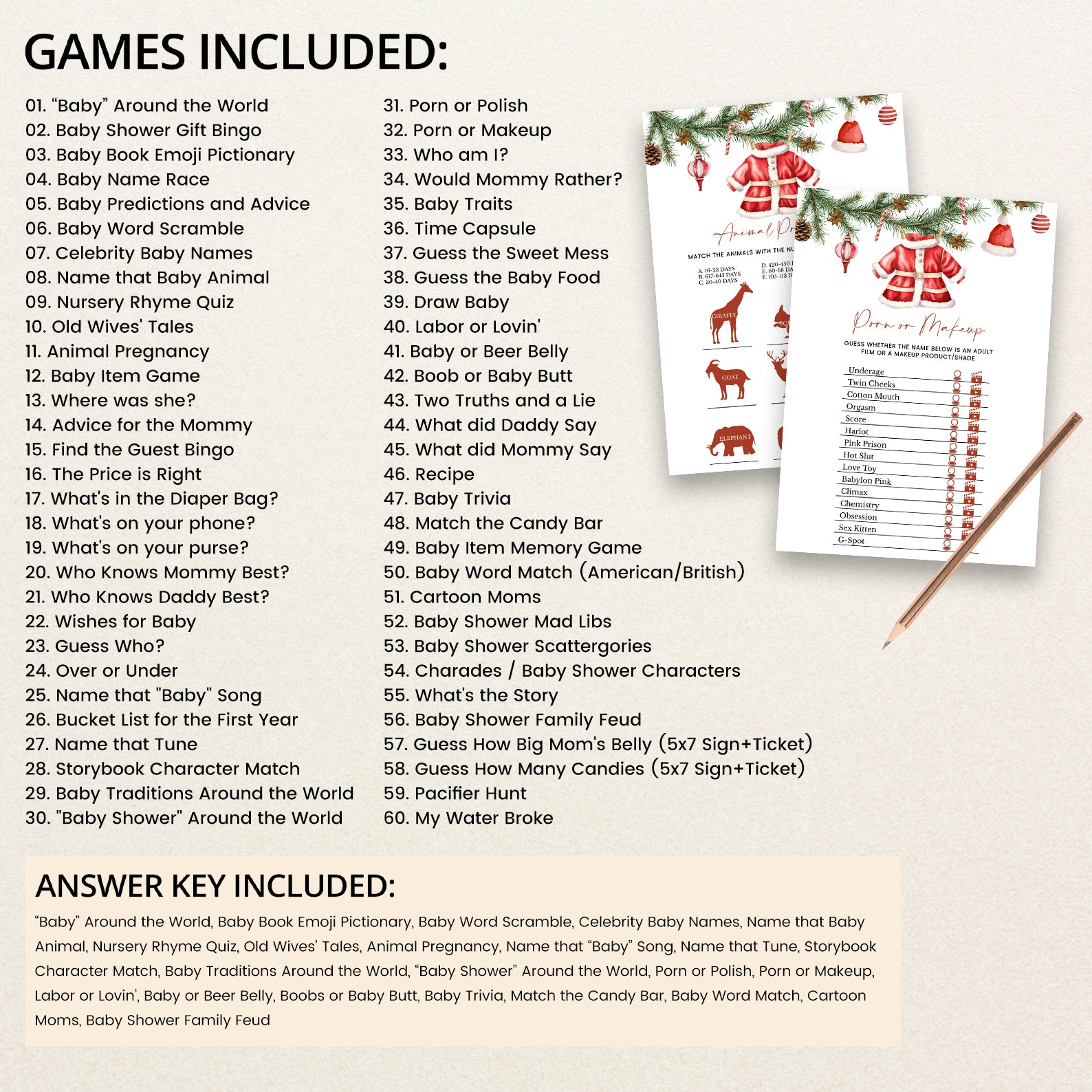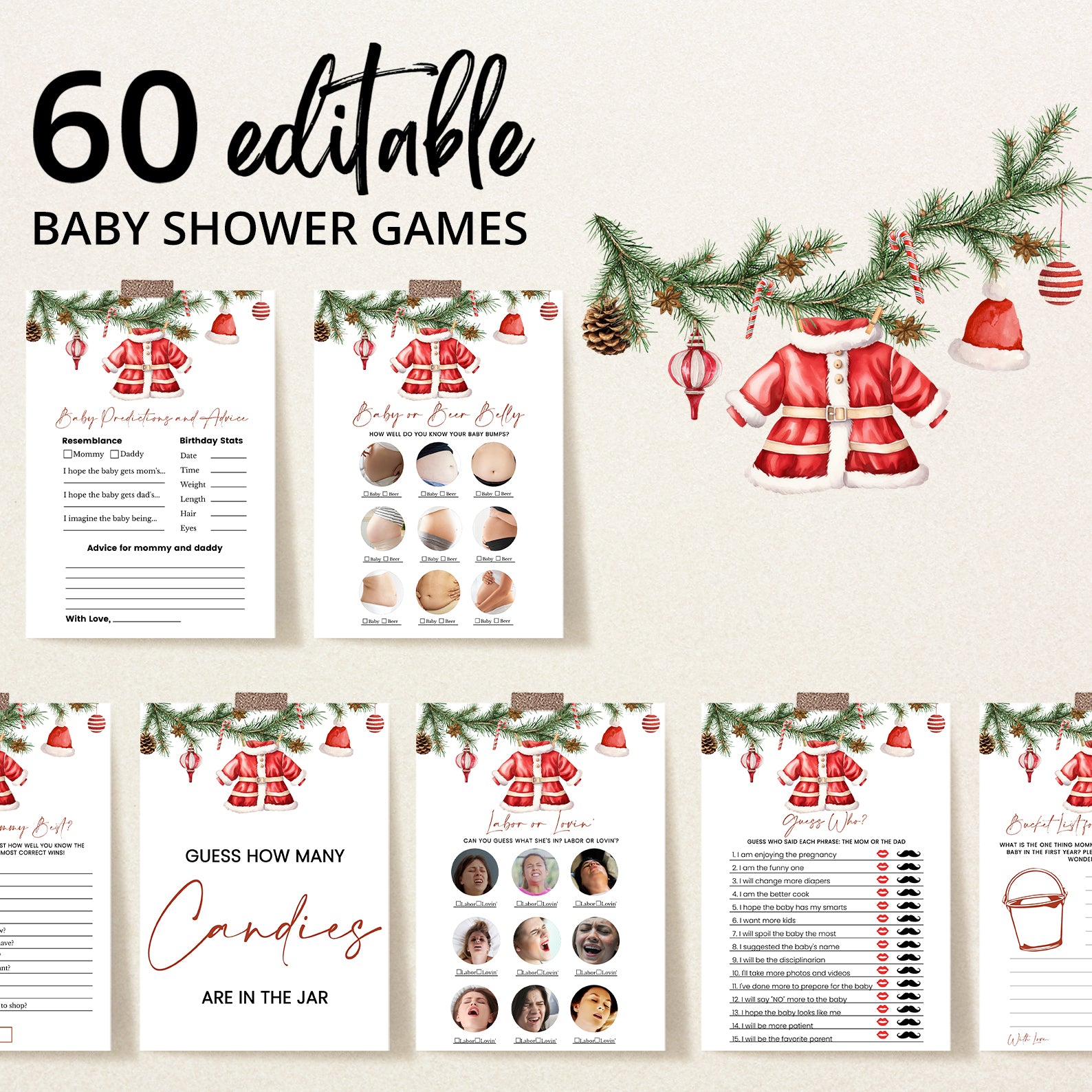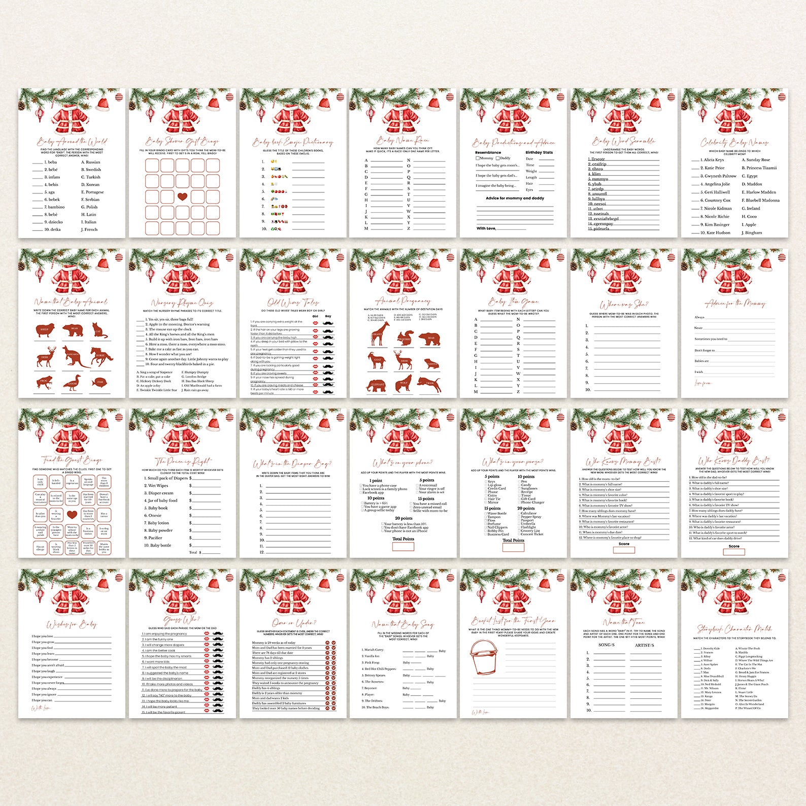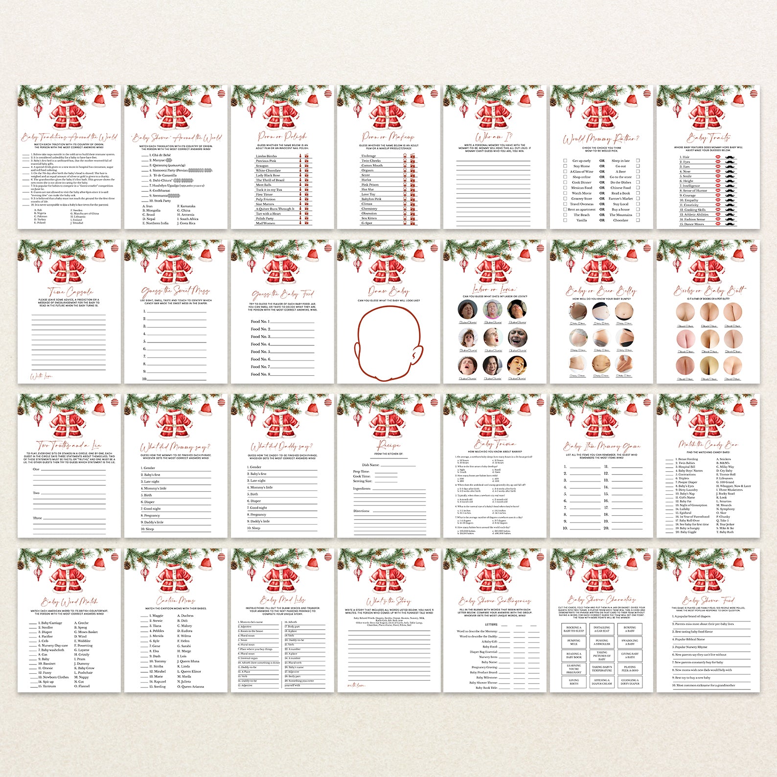 Keep the fun flowing with our winter baby shower game bundle, featuring 60 editable games. Designed with a festive red theme, each game is adorned with seasonal details like a Christmas tree branch, baby Santa outfit, candy cane, and ornaments. Perfect for engaging guests, these activities bring laughter and joy to your celebration, ensuring everyone feels part of the holiday cheer while celebrating your little one’s arrival.