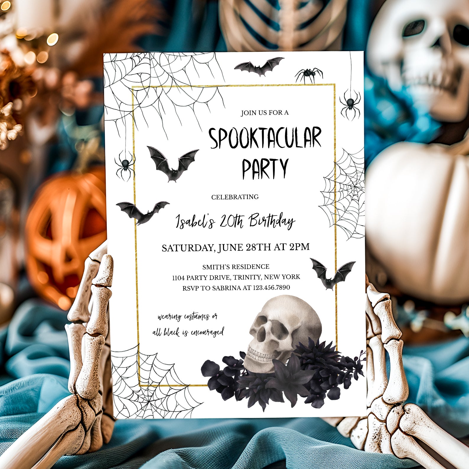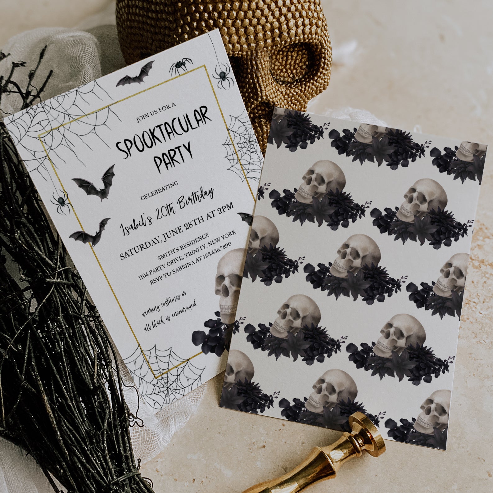 20th Birthday Halloween Invite: Skull, Gold & Gothic Theme