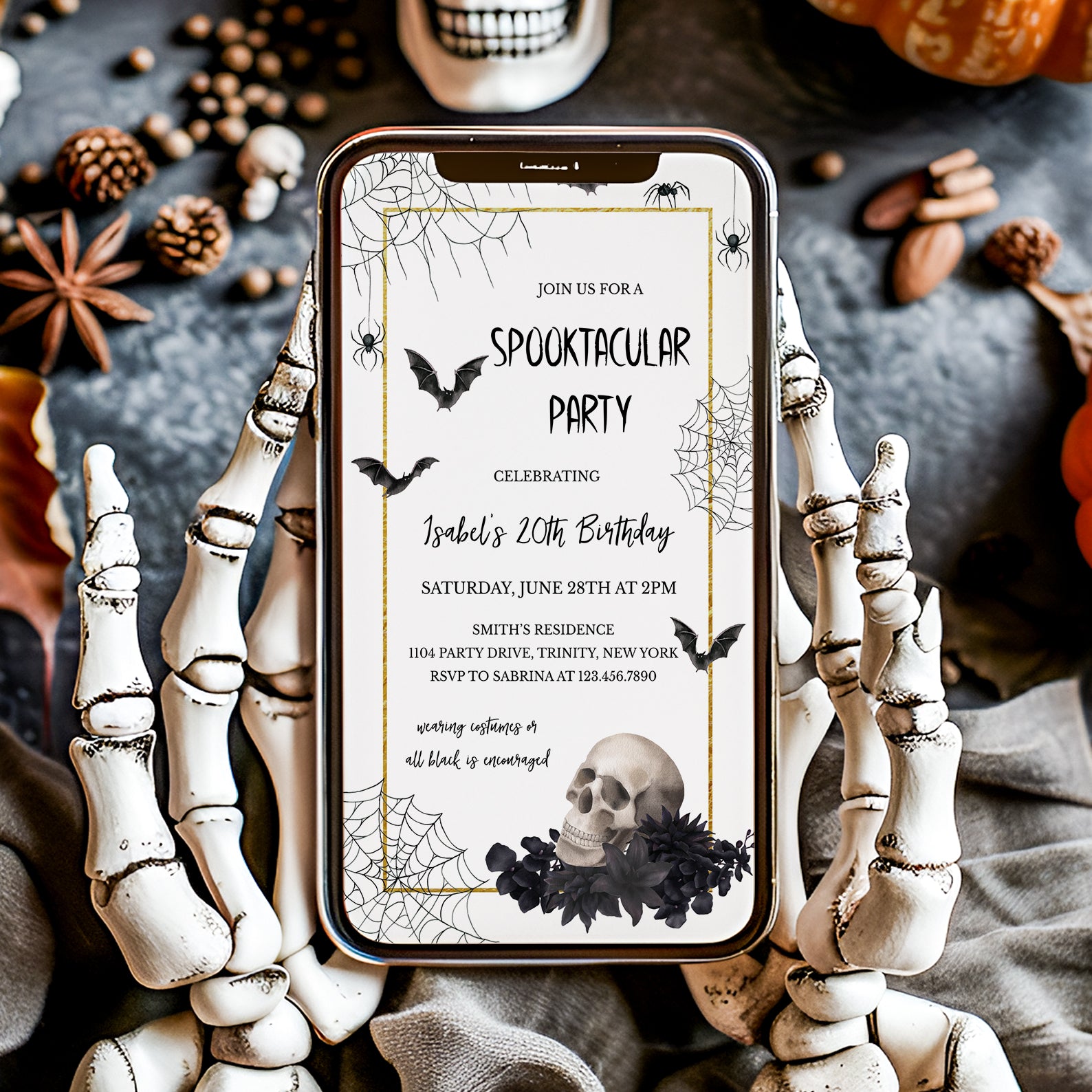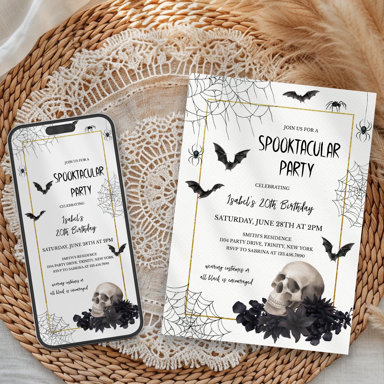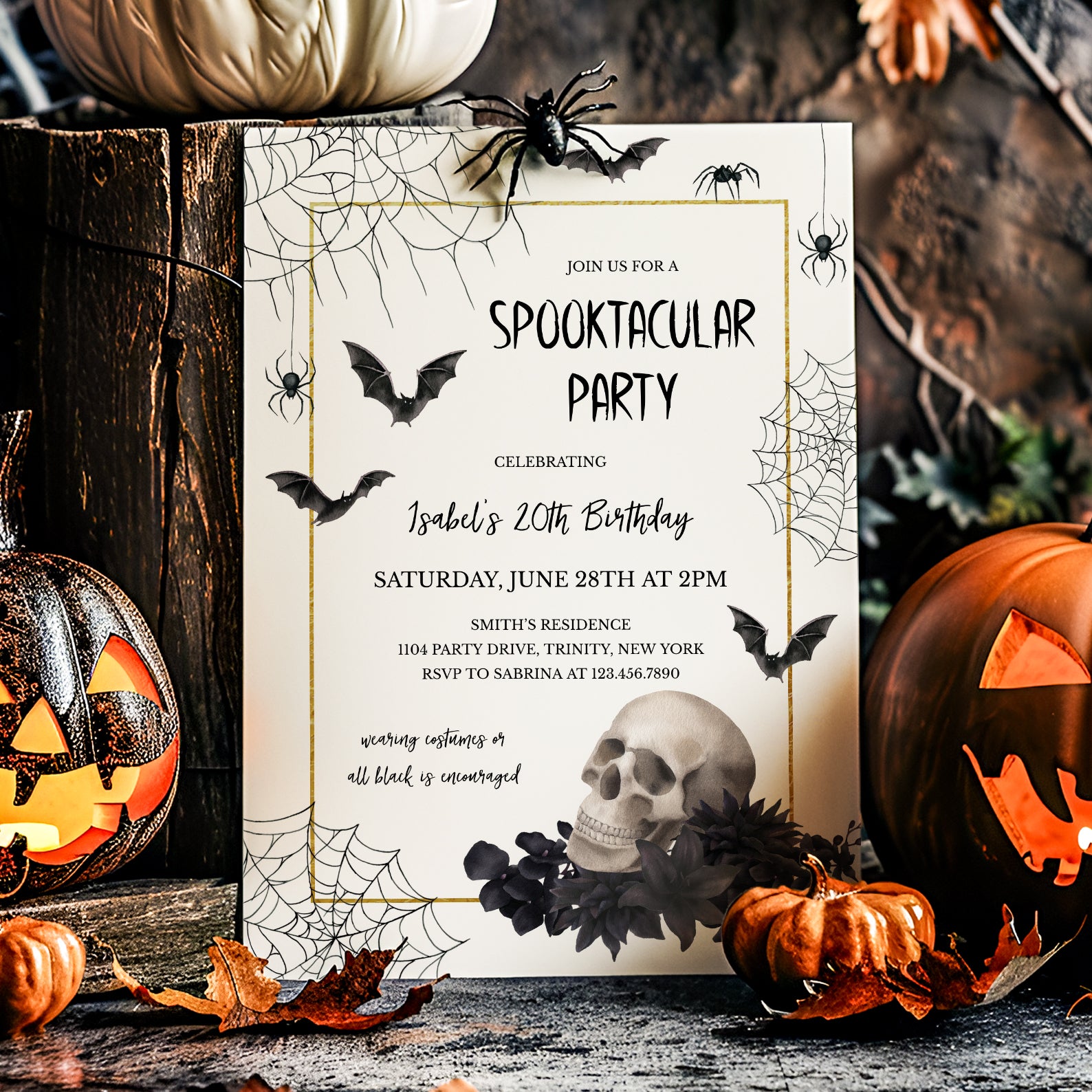 Get ready to celebrate in style with our Spooktacular 20th Birthday Digital Invitation! This eye-catching design features a striking gold vertical rectangle frame that elegantly contrasts against a crisp white background, creating a perfect canvas for your hauntingly fun celebration. Adorned with intricate spider webs, playful falling spiders, and flying bats, this invitation sets the mood for a thrilling party. The finishing touch? A charming skull nestled among black flowers in the bottom corner, adding a touch of gothic flair. Make your milestone birthday unforgettable. Send out these invitations and let the festivities begin!