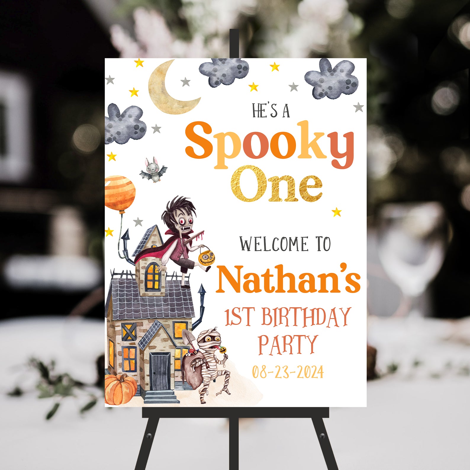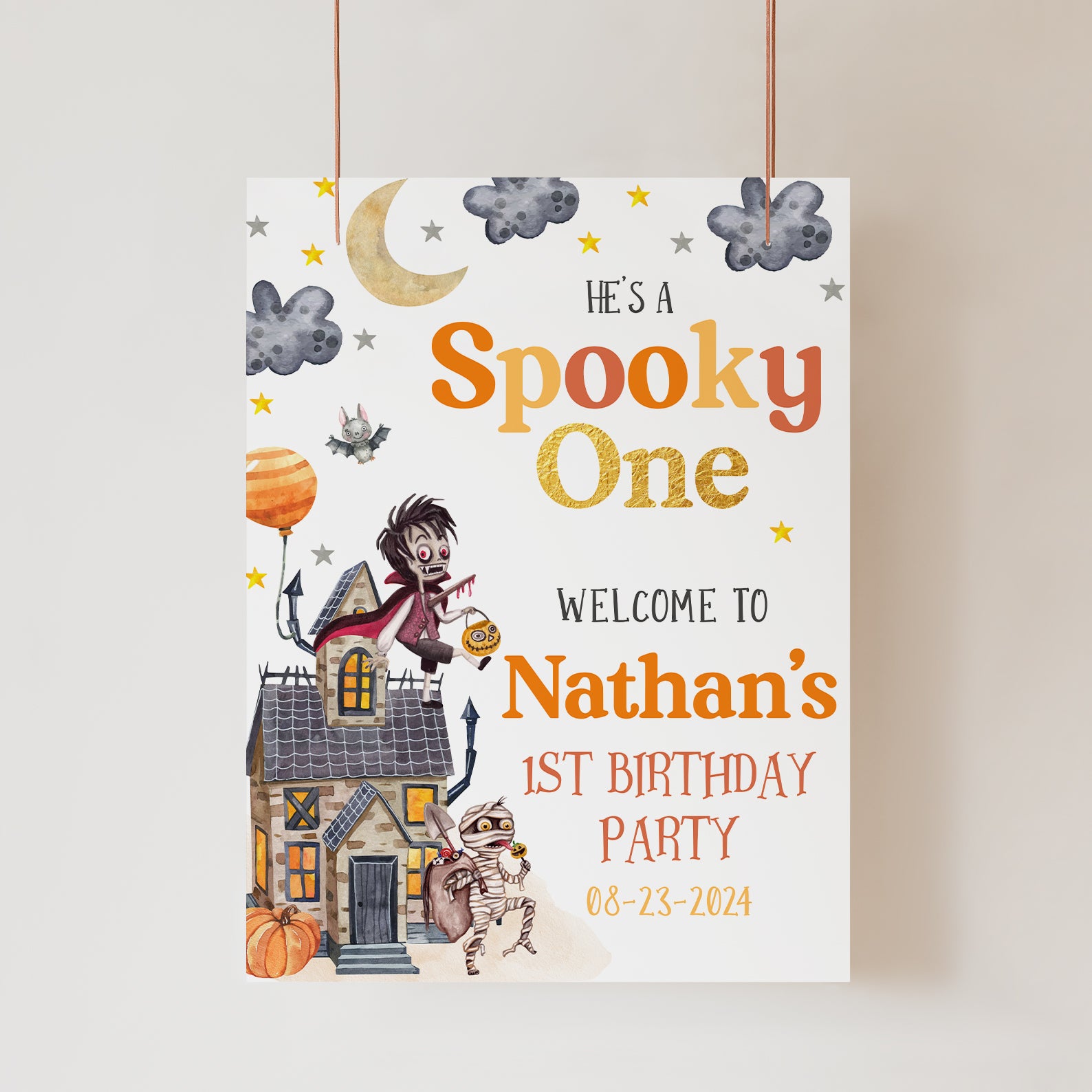 - Purchase this He’s a Spooky One: 1st Halloween Birthday Welcome Sign template
