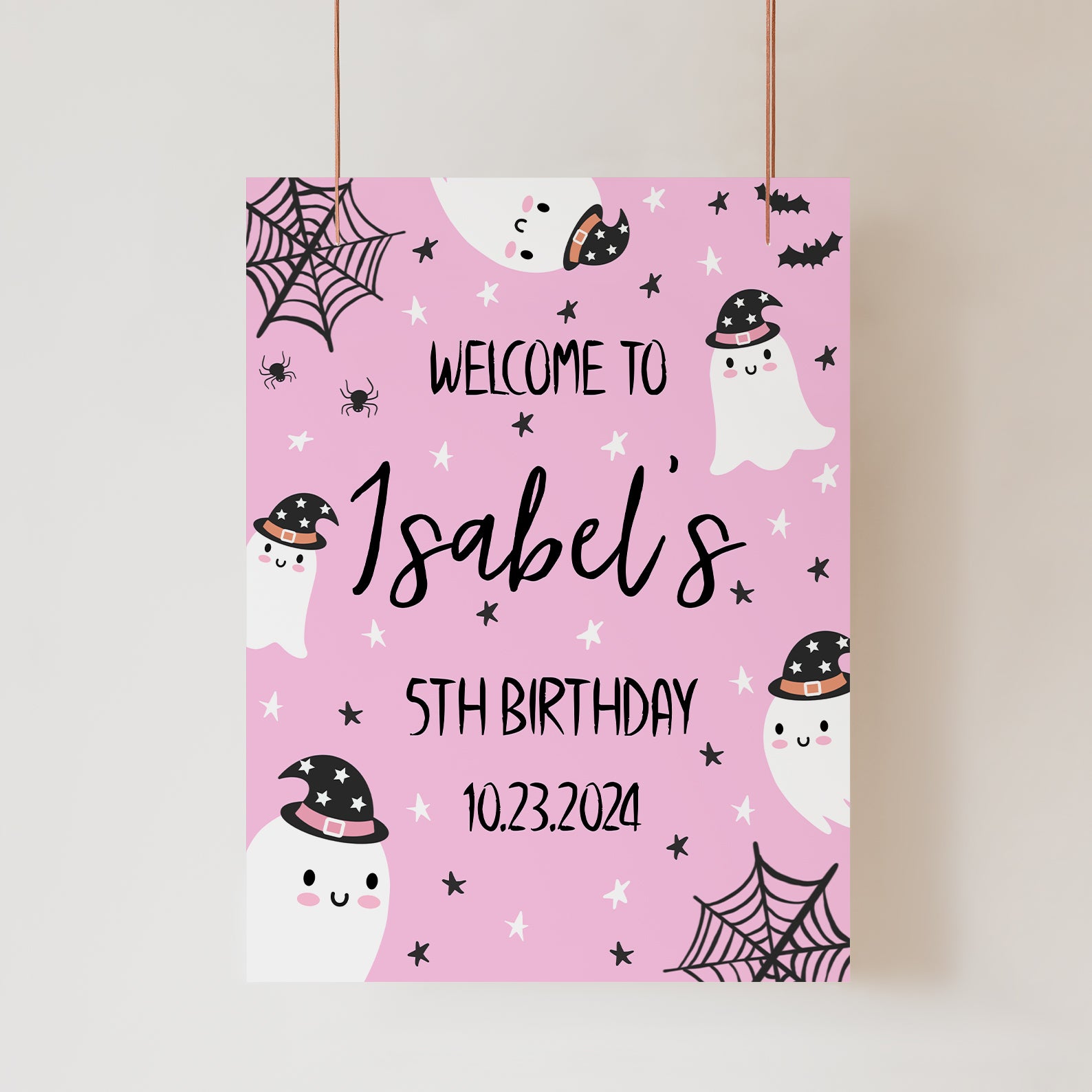 Welcome guests to a spooktacular celebration with this charming 5th Birthday Welcome Sign! Designed with a soft pink background, this festive sign features adorable flying ghosts wearing black and pink witch hats, floating among twinkling stars and playful spiders. Delicate spider webs in the top left and bottom right corners add just the right touch of Halloween magic. Perfect for greeting guests at the entrance or dressing up your party space, this sign sets the mood for a fun-filled boo-themed birthday bash your little one will never forget!