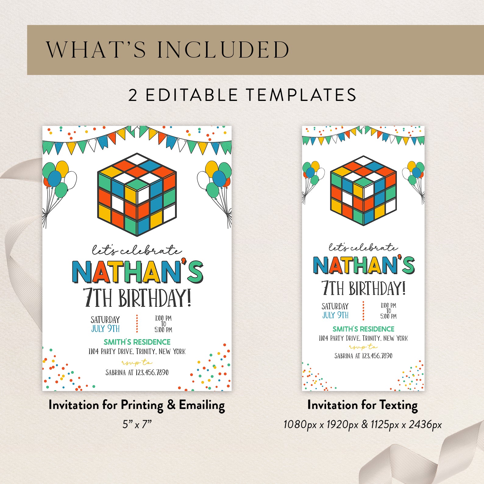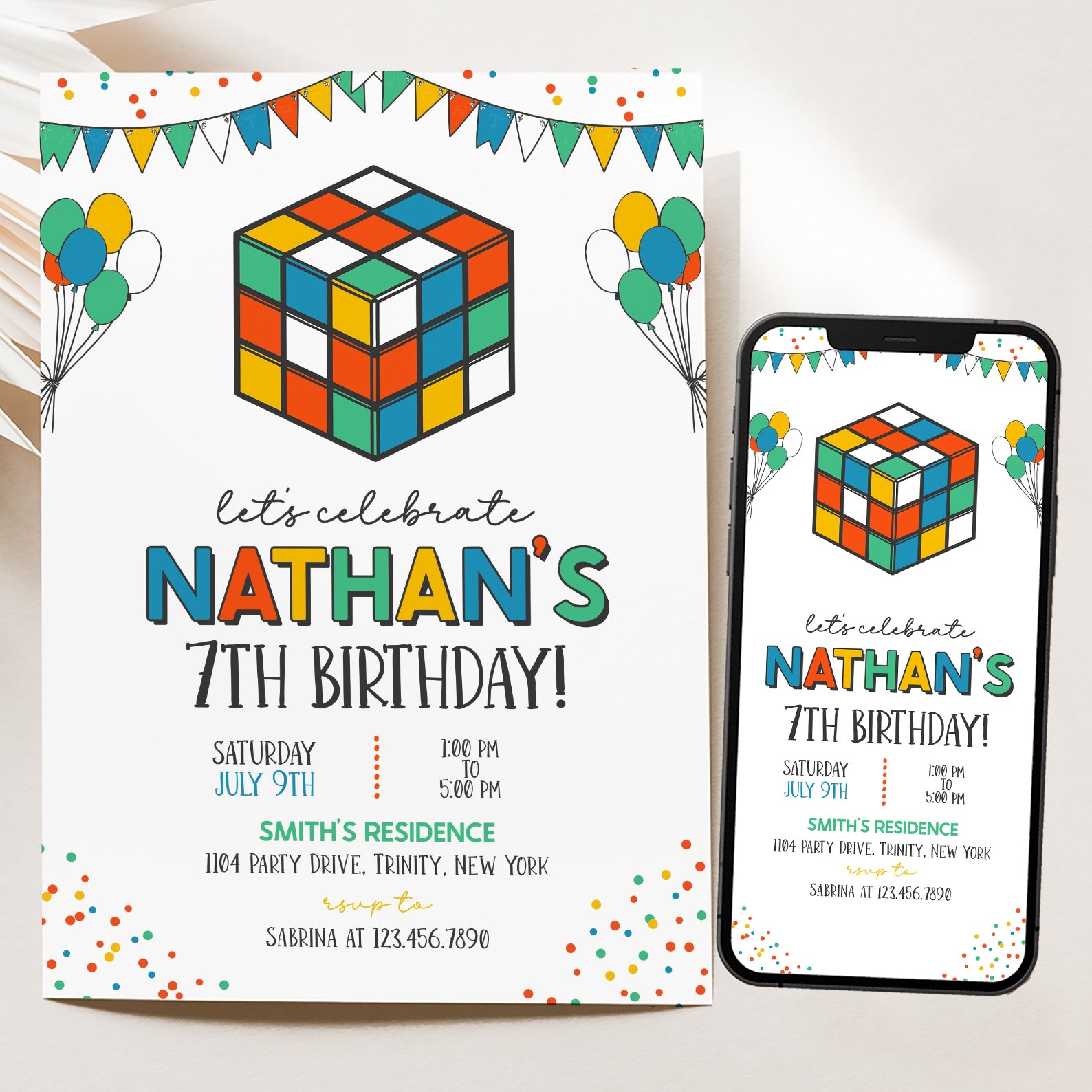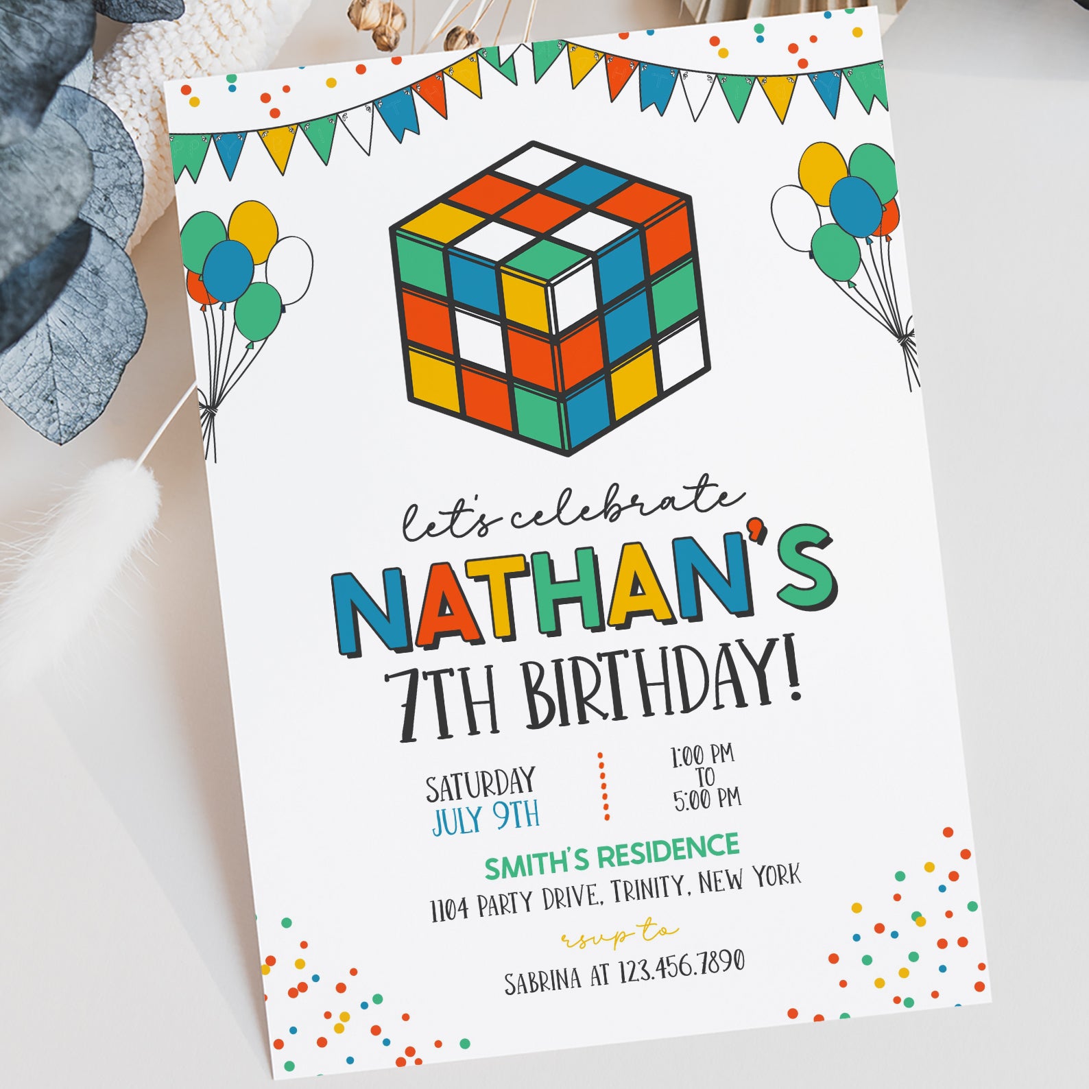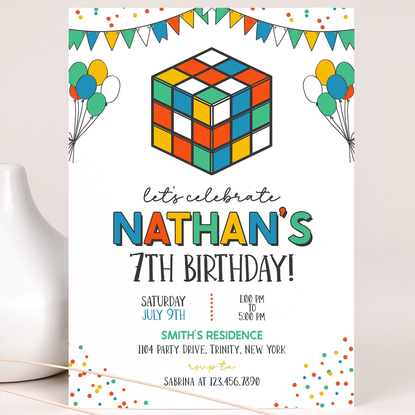 - Purchase this 7th Birthday Party Invite: Rubik’s Cube & Balloons template